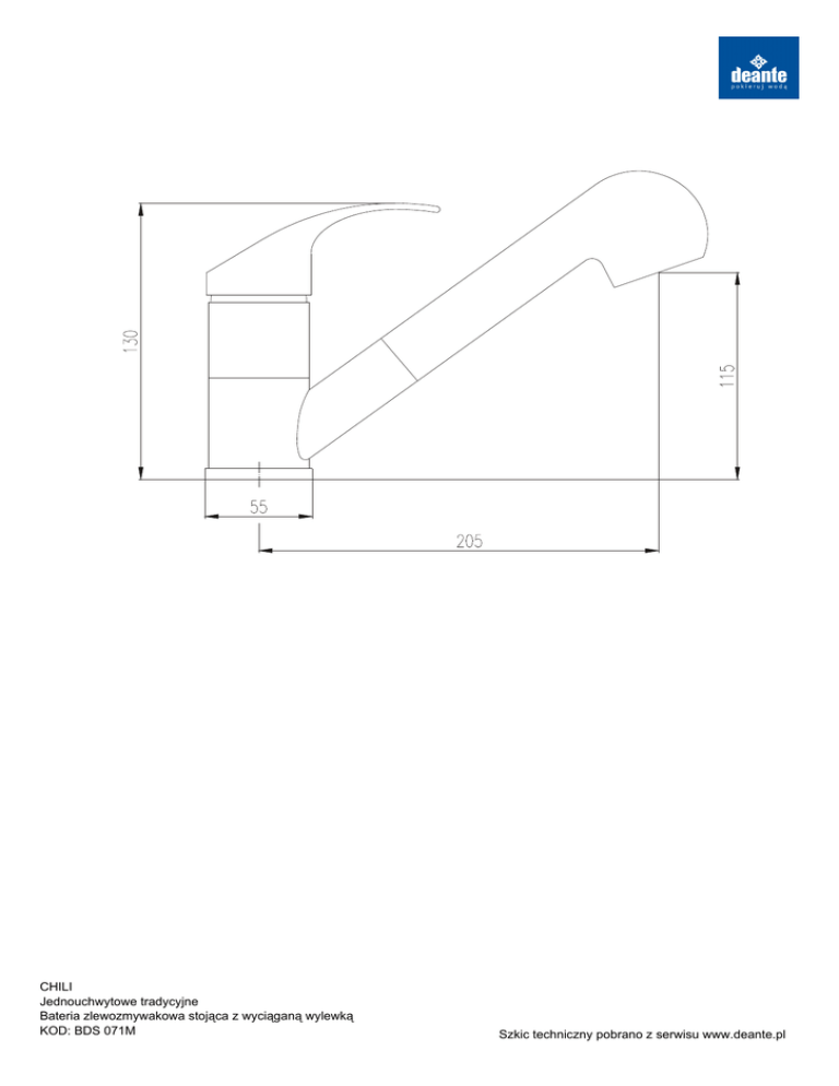 CHILI Jednouchwytowe tradycyjne Bateria zlewozmywakowa stojąca z wyciąganą wylewką KOD: BDS 071M Szkic techniczny pobrano z serwisu www.deante.pl