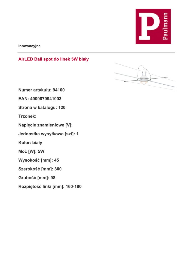 Innowacyjne AirLED Ball spot do linek 5W biały Numer artykułu: 94100 EAN: 4000870941003 Strona w katalogu: 120 Trzonek: Napięcie znamieniowe [V]: Jednostka wysyłkowa [szt]: 1 Kolor: biały Moc [W]: 5W Wysokość [mm]: 45 Szerokość [mm]: 300 Grubość [mm]: 98 Rozpiętość linki [mm]: 160-180