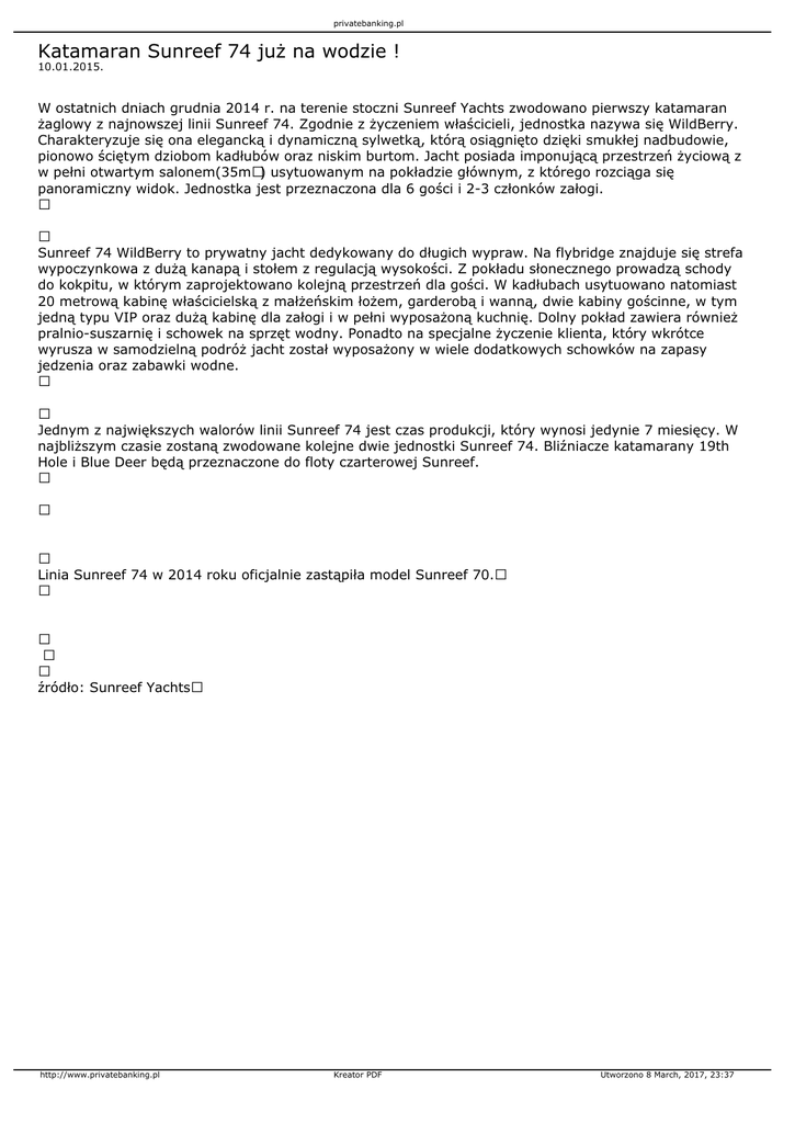 privatebanking.pl Katamaran Sunreef 74 już na wodzie ! 10.01.2015. W ostatnich dniach grudnia 2014 r. na terenie stoczni Sunreef Yachts zwodowano pierwszy katamaran żaglowy z najnowszej linii Sunreef 74. Zgodnie z życzeniem właścicieli, jednostka nazywa się WildBerry. Charakteryzuje się ona elegancką i dynamiczną sylwetką, którą osiągnięto dzięki smukłej nadbudowie, pionowo ściętym dziobom kadłubów oraz niskim burtom. Jacht posiada imponującą przestrzeń życiową z w pełni otwartym salonem(35m²) usytuowanym na pokładzie głównym, z którego rozciąga się panoramiczny widok. Jednostka jest przeznaczona dla 6 gości i 2-3 członków załogi. Sunreef 74 WildBerry to prywatny jacht dedykowany do długich wypraw. Na flybridge znajduje się strefa wypoczynkowa z dużą kanapą i stołem z regulacją wysokości. Z pokładu słonecznego prowadzą schody do kokpitu, w którym zaprojektowano kolejną przestrzeń dla gości. W kadłubach usytuowano natomiast 20 metrową kabinę właścicielską z małżeńskim łożem, garderobą i wanną, dwie kabiny gościnne, w tym jedną typu VIP oraz dużą kabinę dla załogi i w pełni wyposażoną kuchnię. Dolny pokład zawiera również pralnio-suszarnię i schowek na sprzęt wodny. Ponadto na specjalne życzenie klienta, który wkrótce wyrusza w samodzielną podróż jacht został wyposażony w wiele dodatkowych schowków na zapasy jedzenia oraz zabawki wodne. Jednym z największych walorów linii Sunreef 74 jest czas produkcji, który wynosi jedynie 7 miesięcy. W najbliższym czasie zostaną zwodowane kolejne dwie jednostki Sunreef 74. Bliźniacze katamarany 19th Hole i Blue Deer będą przeznaczone do floty czarterowej Sunreef. Linia Sunreef 74 w 2014 roku oficjalnie zastąpiła model Sunreef 70. źródło: Sunreef Yachts http://www.privatebanking.pl Kreator PDF Utworzono 8 March, 2017, 23:37