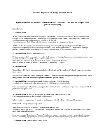 Załącznik do protokołu z sesji 10 lipca 2008 r. Sprawozdanie z działalności burmistrza w okresie od 12 czerwca do 10 lipca 2008 (20 dni roboczych) Kalendarium: 14 czerwca 2008 r. 10.30- Dokonałam otwarcia IV edycji Turnieju Koszykówki Ulicznej zorganizowanej przez Stowarzyszenie Piechowice. Jej pomysłodawcami i głównymi organizatorami są bracia Daniel i Jakub Potkańscy. Jednym ze współorganizatorów jest takŜe zastępca burmistrza K. Raczek. Turniej zgromadził około 80 zawodników, którzy przybyli nawet z Boguszowa-Gorce 11.00 - 14.00 Otworzyłam i obserwowałam przebieg powiatowej Olimpiady Bezpieczeństwa Malucha zorganizowanej pod egidą StraŜy Miejskiej w Jeleniej Górze przez jej pracownika G. Rybarczyka- radnego powiatu jeleniogórskiego. W olimpiadzie uczestniczyło 10 druŜyn, w tym jedna z Niemiec. 15 czerwca 2008 r. Turniej Samorządowców DruŜyna piechowickich samorządowców zdobyła II miejsce w Turnieju Samorządowym zorganizowanym przez Związek Gmin Karkonoskich w parku pałacu w Bukowcu. Skład druŜyny: burmistrz ZGB, sekretarz M. Kamiński, inspektor R. Bieniek, radni: I. Hasiec- Kukułka, E. Szmel, J. Kamiński, D. Potkański, L. Rębisz 18 czerwca 2008 r. Wystąpiłam w TV Dami, zapraszając mieszkańców Piechowic na "Kryształowy Weekend" -imprezę promująca nasze miasto. Powiedziałam :"ŚnieŜne Kotły, wodospad Szklarka i tradycje szklarskie to główne atuty turystyczne, które mogą stać się znakiem rozpoznawczym Piechowic nie tylko w Polsce” 19 czerwca 2008 r. zastępca burmistrza K. Raczek i sekretarz UM M. Kamiński wzięli udział w zakończeniu roku szkolnego dla kl. III Gimnazjum Jana Pawła II. Gimnazjum ukończyło 50 uczniów, jeden pozostał w kl. III, średnia ocen to 3,85 a wyróŜniono 8 uczniów kl. III piechowickiego gimnazjum 20 czerwca 2008 r. K. Raczek uczestniczył w zakończeniu roku szkolnego kl. I-III , a ja w zakończeniu roku kl. IV-VI szkoły podstawowej. Szkołę podstawową ukończyło 50 uczniów, średnia ocen w kl. VI 4,26 a wyróŜniono 15 uczniów. Godz. 17.00 Uroczysta Sesja Rady Miasta Wręczyłam odznaczenia "Honorowy Obywatel Miasta Piechowice" Marianowi Matuli (ks. Kubek) , Zdzisławowi Gaszowi oraz pośmiertnie Leszkowi Krzeptowskiemu przyznane przez Radę Miasta Piechowice. Sesja ta rozpoczęła "Kryształowy Weekend" trzydniową imprezę promującą tradycje i teraźniejszość naszego miasta. Uświetnił ją występ artystki Moniki Gruszczyńskiej ,która zaśpiewała najpiękniejsze arie operetkowe . 21 czerwca 2008 r. III Karkonoski Piknik Szkła Wraz z zastępcą K. Raczkiem otworzyłam piknik i zaprosiłam mieszkańców Piechowic do obejrzenia szklanych ekspozycji i wspólnej sobotniej zabawy. 22 czerwca 2008 r. Trzeci dzień "Kryształowego Weekendu" z udziałem władz miasta: msza w intencji mieszkańców, wycieczka szklarskim szlakiem prowadzona przez Z. Gasza oraz turniej osiedlowy na boisku szkoły podstawowej. Wręczyłam swój puchar najlepszej druŜynie z osiedla Piastów, która wystąpiła pod wodzą p. radnego B. Daniły Turniej osiedlowy zaszczycił swą obecnością p. M. Zawiła poseł na Sejm RP 27 czerwca 2008 r. wzięłam udział w seminarium "KSWi K etap I jako przykład inwestycji ekologicznej ze środków Unii Europejskiej", w czasie którego omówiono zaawansowanie projektu i zakres prac w poszczególnych gminach. Bardzo waŜnym było przedstawienie informacji o II etapie, w którym Piechowice najprawdopodobniej będą uczestniczyć. Przewidziano w nim wybudowanie w naszym mieście 22 km wodociągów i 35 km kanalizacji sanitarnej. 30 czerwca 2008 r. Komisja Edukacji... w gimnazjum Uczestniczyłam w obradach Komisji Edukacji... na temat funkcjonowania naszego gimnazjum. Po dokonaniu lustracji obiektu i terenu przyszkolnego omówiono najistotniejsze problemy w pracy tej placówki, m.in. jak podnieść atrakcyjność procesu dydaktyczno-wychowawczego, aby jak największy procent absolwentów szkoły podstawowej kontynuował w niej naukę. 1 lipca 2008 r. spotkanie z Ŝoną i rodziną p. L. Krzeptowskiego, który pośmiertnie otrzymał tytuł honorowego obywatela Piechowic. 9 lipca 2008 r. Urząd Miasta- spotkanie zainteresowanych stron w sprawie utrzymania dróg powiatowych Zadania remontowo-inwestycyjne 1. Przygotowanie dokumentacji projektowej dla inwestycji pod nazwą: Budowa kanalizacji sanitarnej wraz z przyłączami do budynków w ulicy 1 Maja i części ulicy Zawadzkiego w Piechowicach. - ZłoŜenie wniosku o dofinanasowanie powyŜszej inwestycji z Funduszu Ochrony Środowiska. - Przygotowanie dokumentacji przetargowej i wybranie wykonawcy dla omawianego zadania inwestycyjnego, którym będzie Przedsiębiorstwo Melioracji i InŜynieriiŚrodowiska „ EKO-MEL” w Jeleniej Górze 2. Uzyskanie pozwolenia wodno-prawnego oraz pozwolenia na budowę dla realizacji inwestycji pod nazwą: Odbudowa kładki dla pieszych na rzece Kamiennej w km 14+559 w Piechowicach. - Przygotowanie dokumentacji przetargowej na wykonanie powyŜszego zadania. Przetarg ogłoszony został na dzień 16 lipca br. 3. Przygotowanie dokumentacji projektowej i przetargowej dla zadania pod nazwą: Remont ulicy Mickiewicza. Inwestycja ta realizowana będzie w ramach pozyskanych środków finasowych na usuwanie skutków powodzi. 4.Sprawowanie bieŜącego nadzóru inwestorskiego nad remontem ulicy Wczasowej . Termin zakończenia zadania 4 września br. 5. Przygotowanie dokumentacji projektowej i przetargowej na zadanie pod nazwą : Budowa kanalizacji sanitrnej i sieci wodociągowej w ulicy Norwida. 6. Opracowanie bilansu potrzeb energetycznych dla budownictwa mieszkaniowego w mieście do roku 2012 i przekazanie do Koncernu Enegetycznego Energia PRO w Jeleniej Górze. 7. Powtórne zaopiniowanie ( w związku z uwagami wniesionymi przez właścicieli nieruchomości) projektów miejscowych planów dla Piastowa i Pakoszowa. 8. Przygotowanie do złoŜenia w ramach ogłoszonego naboru Reginalnego Programu Operacy