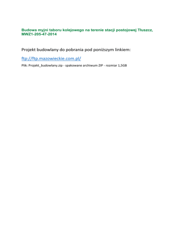 Budowa myjni taboru kolejowego na terenie stacji postojowej Tłuszcz, MWZ1-205-47-2014 Projekt budowlany do pobrania pod poniższym linkiem: ftp://ftp.mazowieckie.com.pl/ Plik: Projekt_budowlany.zip - spakowane archiwum ZIP - rozmiar 1,5GB