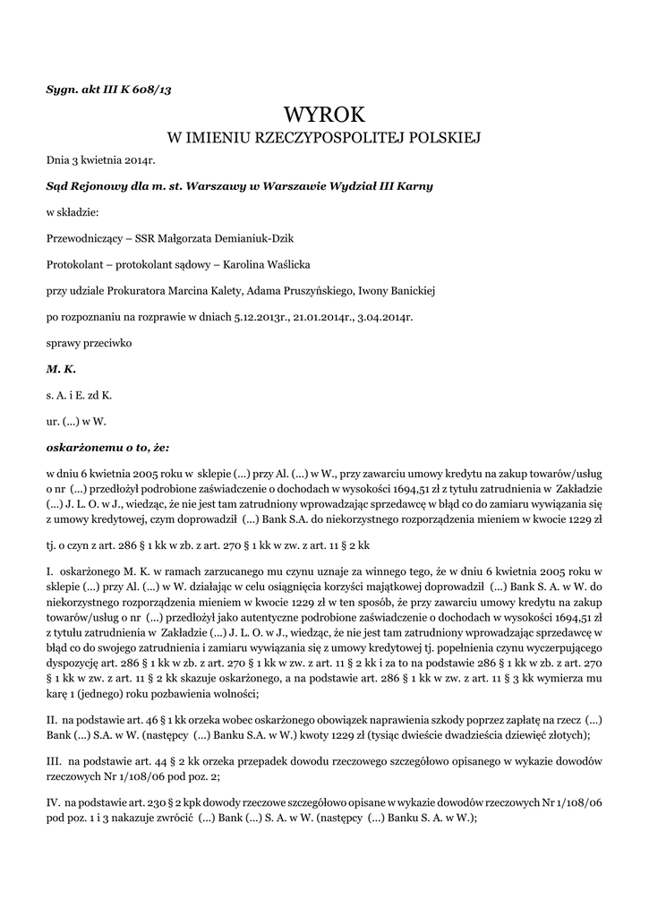 Sygn. akt III K 608/13 WYROK W IMIENIU RZECZYPOSPOLITEJ POLSKIEJ Dnia 3 kwietnia 2014r. Sąd Rejonowy dla m. st. Warszawy w Warszawie Wydział III Karny w składzie: Przewodniczący – SSR Małgorzata Demianiuk-Dzik Protokolant – protokolant sądowy – Karolina Waślicka przy udziale Prokuratora Marcina Kalety, Adama Pruszyńskiego, Iwony Banickiej po rozpoznaniu na rozprawie w dniach 5.12.2013r., 21.01.2014r., 3.04.2014r. sprawy przeciwko M. K. s. A. i E. zd K. ur. (...) w W. oskarżonemu o to, że: w dniu 6 kwietnia 2005 roku w sklepie (...) przy Al. (...) w W., przy zawarciu umowy kredytu na zakup towarów/usług o nr (...) przedłożył podrobione zaświadczenie o dochodach w wysokości 1694,51 zł z tytułu zatrudnienia w Zakładzie (...) J. L. O. w J., wiedząc, że nie jest tam zatrudniony wprowadzając sprzedawcę w błąd co do zamiaru wywiązania się z umowy kredytowej, czym doprowadził (...) Bank S.A. do niekorzystnego rozporządzenia mieniem w kwocie 1229 zł tj. o czyn z art. 286 § 1 kk w zb. z art. 270 § 1 kk w zw. z art. 11 § 2 kk I. oskarżonego M. K. w ramach zarzucanego mu czynu uznaje za winnego tego, że w dniu 6 kwietnia 2005 roku w sklepie (...) przy Al. (...) w W. działając w celu osiągnięcia korzyści majątkowej doprowadził (...) Bank S. A. w W. do niekorzystnego rozporządzenia mieniem w kwocie 1229 zł w ten sposób, że przy zawarciu umowy kredytu na zakup towarów/usług o nr (...) przedłożył jako autentyczne podrobione zaświadczenie o dochodach w wysokości 1694,51 zł z tytułu zatrudnienia w Zakładzie (...) J. L. O. w J., wiedząc, że nie jest tam zatrudniony wprowadzając sprzedawcę w błąd co do swojego zatrudnienia i zamiaru wywiązania się z umowy kredytowej tj. popełnienia czynu wyczerpującego dyspozycję art. 286 § 1 kk w zb. z art. 270 § 1 kk w zw. z art. 11 § 2 kk i za to na podstawie 286 § 1 kk w zb. z art. 270 § 1 kk w zw. z art. 11 § 2 kk skazuje oskarżonego, a na podstawie art. 286 § 1 kk w zw. z art. 11 § 3 kk wymierza mu karę 1 (jednego) roku pozbawienia wolności; II. na podstawie art. 46 § 1 kk orzeka wobec oskarżonego obowiązek naprawienia szkody poprzez zapłatę na rzecz (...) Bank (...) S.A. w W. (następcy (...) Banku S.A. w W.) kwoty 1229 zł (tysiąc dwieście dwadzieścia dziewięć złotych); III. na podstawie art. 44 § 2 kk orzeka przepadek dowodu rzeczowego szczegółowo opisanego w wykazie dowodów rzeczowych Nr 1/108/06 pod poz. 2; IV. na podstawie art. 230 § 2 kpk dowody rzeczowe szczegółowo opisane w wykazie dowodów rzeczowych Nr 1/108/06 pod poz. 1 i 3 nakazuje zwrócić (...) Bank (...) S. A. w W. (następcy (...) Banku S. A. w W.); V. na podstawie art. 624 § 1 kpk zwalnia oskarżonego od zapłaty na rzecz Skarbu Państwa kosztów sądowych; VI. na podstawie art. 29 ust. 1 ustawy z dnia 26 maja 1982r. Prawo o adwokaturze przyznaje od Skarbu Państwa na rzecz adw. S. W. –. M. kwotę 588 (pięćset osiemdziesiąt osiem) złotych powiększoną o podatek VAT tytułem nieopłaconej pomocy prawnej udzielonej z urzędu oskarżonemu M. K.. Sygn. akt III K 608/13 UZASADNIENIE Na podstawie całokształtu zebranego i ujawnionego na rozprawie głównej materiału dowodowego Sąd Rejonowy ustalił następujący stan faktyczny: w dniu 6 kwietnia 2005 roku oskarżony M. K., w sklepie (...) Sp. z o.o. przy Al. (...) w W. zawarł umowę kredytu o numerze (...) na zakup kamery S. w cenie 1299 zł. Wartość udzielonego kredytu wynosiła 1229 zł, zgodnie bowiem z postanowieniami umowy oskarżony był zobowiązany przy jej zawarciu do uiszczenia części ceny zakupionego towaru tj. kwoty 70 zł. Oskarżony nie wywiązał się z płatności rat kredytu. Przy zawarciu umowy M. K. przedłożył podrobione zaświadczenie o zatrudnieniu w Zakładzie (...) J. L. O. w J. i osiąganych z tego tytułu zarobkach w wysokości 1 694,51 zł wiedząc, że nigdy nie był tam zatrudniony. Przedkładając podrobione zaświadczenie i zawierając umowę oskarżony wprowadził sprzedawcę sklepu (...) w błąd, co do zamiaru wywiązania się z umowy kredytu. (...) Bank S.A., działając z przyjętą dla takich przypadków procedurą, w dniu 25.07.2005r. zawiadomiła Prokuraturę o popełnieniu przestępstwa. Do chwili obecnej na rzecz pokrzywdzonej spółki (aktualnie pod nazwą (...) Bank (...) S.A), tytułem spłaty zobowiązania kredytowego, oskarżony nie dokonał żadnej wpłaty. Powyższy stan faktyczny Sąd ustalił na podstawie następujących dowodów: zeznań świadka J. N. k. 223-224, zeznań świadka E. O. k. 29v-30, 186-187, zeznań świadka J. G. k. 4, 184-186, umowy kredytu, zaświadczenia o dochodach oraz faktury k. 74, opinii z zakresu badania pisma ręcznego k. 110-121) Oskarżony na etapie postępowania przygotowawczego nie przyznał się do popełnienia zarzucanego mu czynu i skorzystał z przysługującego mu prawa do odmowy składania wyjaśnień (k. 53). Wyjaśnienia oskarżonego zostały ujawnione na rozprawie w dniu 5.12.2013r. w trybie art. 377§4 kpk z uwagi na to, że M. K. osobiście zawiadomiony o terminie rozprawy nie stawił się bez usprawiedliwienia, co stało się podstawą zastosowania art. 377 § 3 kpk. Oskarżony, co do którego Sąd uzyskał informację, że od dnia 22.01.2014r. został pozbawiony wolności, doprowadzony na rozprawę w dniu 3.04.2014r. na pytanie Sądu, czy chce złożyć wyjaśnienia oświadczył, że nie będzie wyjaśniał (k. 276). Sąd nie dał wiary wyjaśnieniom oskarżonego, które ograniczyły się jedynie do oświadczenia o nieprzyznaniu się do zarzucanego mu czynu, gdyż są one nielogiczne oraz sprzeczne z zeznaniami świadków, dowodami w postaci dokumentów, a w szczególności opinią biegłego z zakresu badania pisma ręcznego. Jako w pełni wiarygodne Sąd ocenił zeznania świadka J. G. – pracownika (...) Banku S.A, zatrudnionego na stanowisku kierownika działu kredytów trudnych. J. G. w dniu 29.08.2005 r złożył ustne zawiadomienie o pr