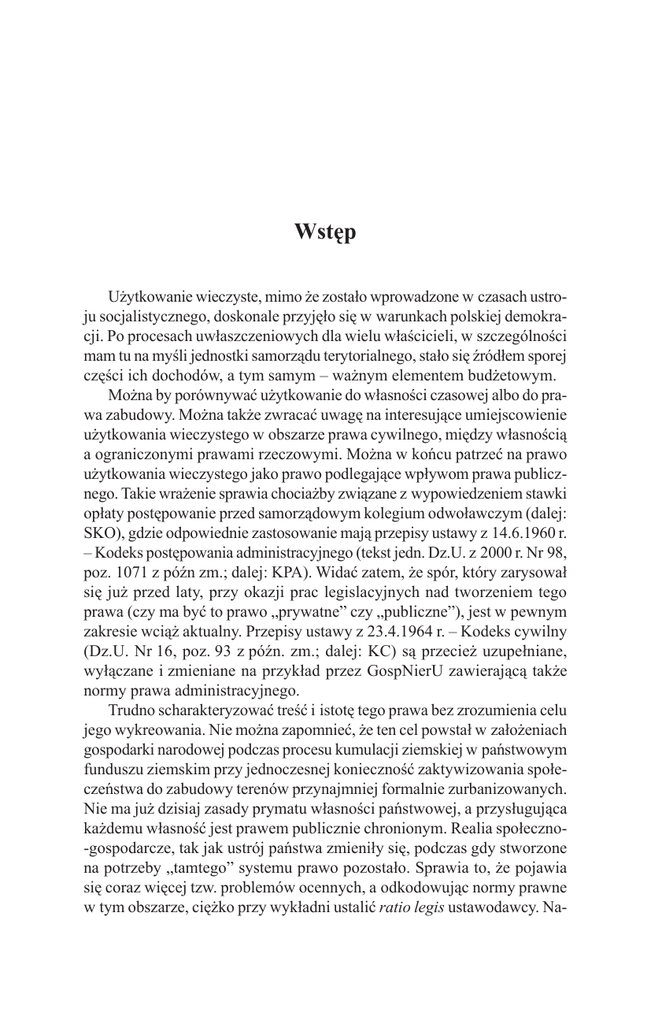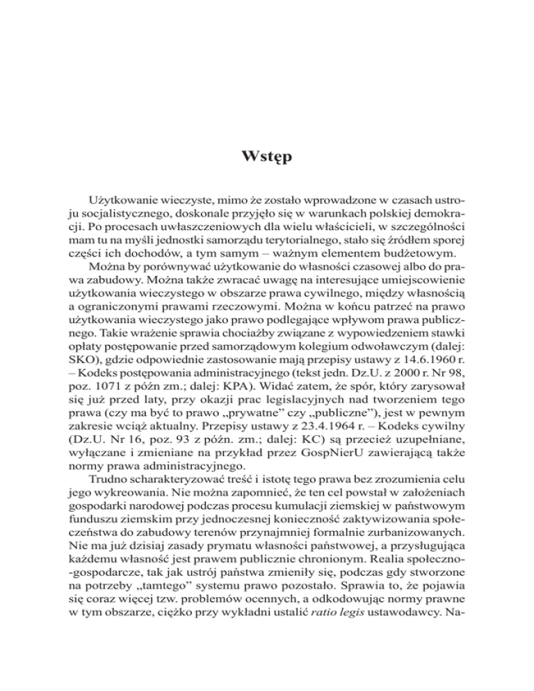 Wstęp Użytkowanie wieczyste, mimo że zostało wprowadzone w czasach ustroju socjalistycznego, doskonale przyjęło się w warunkach polskiej demokracji. Po procesach uwłaszczeniowych dla wielu właścicieli, w szczególności mam tu na myśli jednostki samorządu terytorialnego, stało się źródłem sporej części ich dochodów, a tym samym – ważnym elementem budżetowym. Można by porównywać użytkowanie do własności czasowej albo do prawa zabudowy. Można także zwracać uwagę na interesujące umiejscowienie użytkowania wieczystego w obszarze prawa cywilnego, między własnością a ograniczonymi prawami rzeczowymi. Można w końcu patrzeć na prawo użytkowania wieczystego jako prawo podlegające wpływom prawa publicznego. Takie wrażenie sprawia chociażby związane z wypowiedzeniem stawki opłaty postępowanie przed samorządowym kolegium odwoławczym (dalej: SKO), gdzie odpowiednie zastosowanie mają przepisy ustawy z 14.6.1960 r. – Kodeks postępowania administracyjnego (tekst jedn. Dz.U. z 2000 r. Nr 98, poz. 1071 z późn zm.; dalej: KPA). Widać zatem, że spór, który zarysował się już przed laty, przy okazji prac legislacyjnych nad tworzeniem tego prawa (czy ma być to prawo „prywatne” czy „publiczne”), jest w pewnym zakresie wciąż aktualny. Przepisy ustawy z 23.4.1964 r. – Kodeks cywilny (Dz.U. Nr 16, poz. 93 z późn. zm.; dalej: KC) są przecież uzupełniane, wyłączane i zmieniane na przykład przez GospNierU zawierającą także normy prawa administracyjnego. Trudno scharakteryzować treść i istotę tego prawa bez zrozumienia celu jego wykreowania. Nie można zapomnieć, że ten cel powstał w założeniach gospodarki narodowej podczas procesu kumulacji ziemskiej w państwowym funduszu ziemskim przy jednoczesnej konieczność zaktywizowania społeczeństwa do zabudowy terenów przynajmniej formalnie zurbanizowanych. Nie ma już dzisiaj zasady prymatu własności państwowej, a przysługująca każdemu własność jest prawem publicznie chronionym. Realia społeczno-gospodarcze, tak jak ustrój państwa zmieniły się, podczas gdy stworzone na potrzeby „tamtego” systemu prawo pozostało. Sprawia to, że pojawia się coraz więcej tzw. problemów ocennych, a odkodowując normy prawne w tym obszarze, ciężko przy wykładni ustalić ratio legis ustawodawcy. Na- XVIII Wstęp wet zdawałoby się niebudząca wątpliwości charakterystyka prawa użytkowania wieczystego jako prawa czasowego, może w konkretnych przypadkach być różnie interpretowana. Zgodnie z uchwałą SN z 16.2.2012 r. zawarcie umowy o przedłużenie użytkowania wieczystego na żądanie zgłoszone w terminie określonym w art. 236 § 2 KC może nastąpić także po upływie okresu, na jaki to prawo zostało ustanowione. Gminy, powiaty, województwa i w końcu także sam Skarb Państwa nie są zainteresowani utrzymaniem niskich opłat z tytułu użytkowania ani tym bardziej przekształceniem tego prawa. Trudno się temu dziwić skoro, jak zostało to na wstępie powiedziane, wpływy z tytułu opłat stanowią jeden z ważniejszych dochodów budżetowych. Kwestia ta jest o tyle skomplikowana, że samorząd, a właściwie jego organ wykonawczy, niejednokrotnie w innych sprawach jak np. przekształcenie w mieście na prawach powiatu, działa w ramach władztwa administracyjnego, gdy na gruncie prawa cywilnego organ ten występuje jako reprezentant gminy będącej stroną umowy o użytkowanie wieczyste. Użytkowanie wieczyste niesie ze sobą wiele więcej problemów związanych chociażby z procesem przekształcenia użytkowania wieczystego w prawo własności. Jednostki samorządu terytorialnego i Skarb Państwa ze względu na swoje dochody sprzeciwiają się wszelkim próbom pozbawienia ich majątku, jako sprzecznych z Konstytucją. Problem jest jednak bardziej złożony. Nie można bowiem pominąć zaszłości historycznych oraz faktu, że owa własność została przecież komuś odebrana na mocy dekretów władzy ludowej. Byli właściciele są zatem obecnie niejednokrotnie użytkownikami wieczystymi. Ponadto – z punktu widzenia ochrony konstytucyjnej – wątpliwości może budzić także sama konstrukcja podmiotowa tegoż prawa. Zakłada ona, że jedynie wybrani właściciele (publiczni) mogą oddawać nieruchomości do korzystania i rozporządzania w granicach umownych. Tym samym pozostali właściciele (prywatni) ze swej istoty nie posiadają takich uprawnień. W czasach demokracji, gdzie prymat własności publicznej już nie ma wiodącej roli, stawianie właścicieli publicznych na uprzywilejowanej pozycji może budzić wątpliwości. Jak zatem obecnie scharakteryzować użytkowanie wieczyste? De facto pełni ono funkcję czysto fiskalną. Opłaty roczne są przecież uzależnione od celu i poniekąd samego sposobu wykorzystania nieruchomości, a ich podstawowa stawka w przypadku gospodarczego wykorzystania gruntu stanowi rocznie równowartość 3% aktualnej jego wartości. Przy prostym rachunku, że użytkowanie wieczyste ustalono na maksymalny okres 99 lat, III CZP 94/11, Legalis. Wstęp XIX daje to kwotę znacznie wyższą od jednorazowej wartości ustalonej przy sprzedaży. Należy przy tym pamiętać, że podczas ustanowienia własności użytkownik zobowiązany jest do uiszczenia pierwszej opłaty, sięgającej od 15 do 25% wartości nieruchomości. Naiwnym byłoby myślenie o opłatach za użytkowanie wieczyste tylko jak o ekwiwalencie pieniężnym, ustalanym między równymi wobec siebie stronami stosunku cywilnoprawnego. Owej „równości” stron nie ma bowiem zarówno w obszarze uregulowań materialnoprawnych, jak i procesowych. Oczywiście bez zrozumienia istoty danego prawa trudno jest odnieść się do wybranych zagadnień z nim związanych. Pomimo tego to właśnie te wybrane zagadnienia (w tym zagadnienia procesowe, szczególnie związane z aktualizacją opłaty) mają stanowić istotę i novum tej publikacji. Nie chodzi bowiem o to, aby po