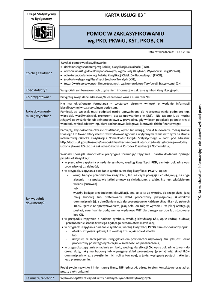Urząd Statystyczny w Bydgoszczy KARTA USŁUGI 03 * POMOC W ZAKLASYFIKOWANIU wg PKD, PKWiU, KŚT, PKOB, CN Data zatwierdzenia: 31.12.2014 Co chcę załatwić? Uzyskać pomoc w zaklasyfikowaniu: działalności gospodarczej, wg Polskiej Klasyfikacji Działalności (PKD), wyrobu lub usługi do celów podatkowych, wg Polskiej Klasyfikacji Wyrobów i Usług (PKWiU), obiektu budowlanego, wg Polskiej Klasyfikacji Obiektów Budowlanych (PKOB), środka trwałego, wg Klasyfikacji Środków Trwałych (KŚT), towarów eksportowanych i importowanych, wg Nomenklatury Taryfowej i Statystycznej (CN). Kogo dotyczy? Wszystkich zainteresowanych uzyskaniem informacji w zakresie symboli klasyfikacyjnych. Co przygotować? Przygotuj swoje dane adresowe/teleadresowe wraz z numerem NIP. Jakie dokumenty muszę wypełnić? Nie ma określonego formularza – wystarczy pisemny wniosek o wydanie informacji klasyfikacyjnej wraz z czytelnym podpisem. Pamiętaj, że wniosek musi podpisać osoba upoważniona do reprezentowania podmiotu (np. właściciel, współwłaściciel, prokurent, osoba upoważniona w KRS). Nie zapomnij, że musisz załączyć upoważnienie lub pełnomocnictwo w przypadku, gdy wniosek podpisuje podmiot trzeci w imieniu wnioskodawcy (np. biuro rachunkowe, księgowa, kierownik działu finansowego). Pamiętaj, aby dokładnie określić działalność, wyrób lub usługę, obiekt budowlany, rodzaj środka trwałego lub towar, który chcesz zaklasyfikować zgodnie z wytycznymi zamieszczonymi na stronie internetowej Ośrodka Klasyfikacji i Nomenklatur Urzędu Statystycznego w Łodzi pod adresem: http://lodz.stat.gov.pl/osrodki/osrodek-klasyfikacji-i-nomenklatur-urzedu-statystycznego-w-lodzi/ (strona główna US Łódź → zakładka Ośrodki → Ośrodek Klasyfikacji i Nomenklatur). Jak wypełnić dokumenty? Wniosek sporządź samodzielnie precyzyjnie formułując zapytanie i bardzo dokładnie opisując przedmiot klasyfikacji: w przypadku zapytania o nadanie symbolu, według klasyfikacji PKD, zamieść dokładny opis prowadzonej działalności, w przypadku zapytania o nadanie symbolu, według klasyfikacji PKWiU, opisz: usługi będące przedmiotem klasyfikacji, tzn. na czym polegają i co obejmują, na czyje zlecenie i na podstawie jakiej umowy są świadczone, a także, kto jest właścicielem wkładu (surowca) lub wyroby będące przedmiotem klasyfikacji, tzn. co to są za wyroby, do czego służą, jaką mają budowę lub preferowany skład procentowy przynajmniej składników dominujących (tj. z określeniem udziału procentowego każdego składnika - do pełnych 100%, łącznie ze sprecyzowaniem, jaką pełni on rolę w wyrobie) i w jakiej występują postaci, ewentualnie podaj numer wydanego WIT dla danego wyrobu lub stosowany kod CN, w przypadku zapytania o nadanie symbolu, według klasyfikacji KŚT, opisz rodzaj, budowę i przeznaczenie środka trwałego będącego przedmiotem klasyfikacji, w przypadku zapytania o nadanie symbolu, według klasyfikacji PKOB, zamieść dokładny opis: obiektu inżynierii lądowej lub wodnej, tzn. o jaki obiekt chodzi lub budynku, ze szczególnym uwzględnieniem powierzchni użytkowej, tzn. jaki jest udział procentowy poszczególnych części w zależności od przeznaczenia, w przypadku zapytania o nadanie symbolu, według klasyfikacji CN, opisz dokładnie towar - do czego służy, jaką ma budowę lub wymagany skład procentowy (przynajmniej składników dominujących wraz z określeniem ich roli w towarze), w jakiej występuje postaci i jakie jest jego przeznaczenie. Podaj swoje nazwisko i imię, nazwę firmy, NIP jednostki, adres, telefon kontaktowy oraz adres poczty elektronicznej. Ile muszę zapłacić? Wysokość opłaty zależy od liczby nadanych symboli klasyfikacyjnych. KARTA USŁUGI 03 * Urząd Statystyczny w Bydgoszczy POMOC W ZAKLASYFIKOWANIU wg PKD, PKWiU, KŚT, PKOB, CN Data zatwierdzenia: 31.12.2014 Kiedy złożyć dokumenty? Dokumenty złóż w dowolnym, dogodnym dla siebie terminie. Bezpośrednią pomoc w zaklasyfikowaniu uzyskasz: Ośrodek Klasyfikacji i Nomenklatur Urząd Statystyczny w Łodzi 93-176 Łódź, ul. Suwalska 29, fax: 42 683 90 10; e-mail: [email protected] Pomoc w sprawie przesłania wniosku i procedur istniejących w Ośrodku uzyskasz pod numerami telefonów: 42 683 92 72; 42 683 92 76; 42 683 92 74; 42 683 92 71; 42 683 92 75; 42 683 92 82 Wniosek możesz wysłać e-mailem, faksem, pocztą tradycyjną lub złożyć osobiście także w siedzibie tutejszego Urzędu lub w jednym z naszych Oddziałów terenowych. W takim przypadku prześlemy Twój wniosek do ww. Ośrodka w Łodzi, o czym zostaniesz poinformowany. Gdzie załatwię sprawę? Nasze dane kontaktowe: Urząd Statystyczny w Bydgoszczy 85-066 Bydgoszcz, ul. Konarskiego 1-3 e-mail: [email protected] http://bydgoszcz.stat.gov.pl fax: 52 366-93-56 godziny pracy: poniedziałek-piątek 700-1500 Oddziały terenowe: Toruń 87-100, ul. Mickiewicza 10/16 fax: 56 61-17-199 godziny pracy: 700-1500 Włocławek 87-800, ul. Piekarska 16a fax: 54 23-56-424 godziny pracy: 700-1500 Inowrocław 88-100, Al. Niepodległości 4 godziny pracy: 700-1500 Co zrobi urząd? Urząd Statystyczny w Bydgoszczy prześle Twój wniosek do Ośrodka Klasyfikacji i Nomenklatur w Urzędzie Statystycznym w Łodzi, o czym zostaniesz powiadomiony. Urząd Statystyczny w Łodzi przygotuje odpowiedź i powiadomi Cię o należnej opłacie i numerze konta, na jaki masz jej dokonać. Po wpłynięciu opłaty na konto, Urząd Statystyczny w Łodzi wyśle listem poleconym przygotowaną informację (wraz z fakturą VAT) na podany przez Ciebie adres. Jaki jest czas realizacji? Odpowiedź zostanie udzielona przez Urząd Statystyczny w Łodzi w ciągu 30 dni, a w sprawach skomplikowanych, wymagających dodatkowych wyjaśnień - nie później niż w ciągu 60 dni od daty wpływu wniosku do służb statystyki publicznej. Jak się odwołać? Wydana przez US w Łodzi informacja nie stanowi decyzji administracyjnej i nie ma charakteru