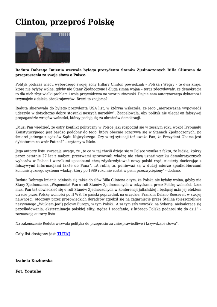 Clinton, przeproś Polskę Reduta Dobrego Imienia wezwała byłego prezydenta Stanów Zjednoczonych Billa Clintona do przeproszenia za swoje słowa o Polsce. Polityk podczas wiecu wyborczego swojej żony Hillary Clinton powiedział: – Polska i Węgry – te dwa kraje, które nie byłyby wolne, gdyby nie Stany Zjednoczone i długa zimna wojna – teraz zdecydowały, że demokracja to dla nich zbyt wielki problem i wolą przywództwo na wzór putinowski. Dajcie nam autorytarnego dyktatora i trzymajcie z daleka obcokrajowców. Brzmi to znajomo? Reduta skierowała do byłego prezydenta USA list, w którym wskazała, że jego „nierozważna wypowiedź uderzyła w dotychczas dobre stosunki naszych narodów”. Zaapelowała, aby polityk nie ulegał on fałszywej propagandzie wrogów wolności, którzy podają się za obrońców demokracji. „Musi Pan wiedzieć, że ostry konflikt polityczny w Polsce jaki rozpoczął się w zeszłym roku wokół Trybunału Konstytucyjnego jest bardzo podobny do tego, który obecnie rozgrywa się w Stanach Zjednoczonych, po śmierci jednego z sędziów Sądu Najwyższego. Czy w tej sytuacji też uważa Pan, że Prezydent Obama jest dyktatorem na wzór Putina?” – czytamy w liście. Jego autorzy listu zwracają uwagę, że „to co w tej chwili dzieje się w Polsce wynika z faktu, że ludzie, którzy przez ostatnie 27 lat z małymi przerwami sprawowali władzę nie chcą uznać wyniku demokratycznych wyborów w Polsce i wszelkimi sposobami chcą zdyskredytować nowy polski rząd, niestety docierając z fałszywymi informacjami także do Pana”. „A robią to, ponieważ są w dużej mierze spadkobiercami komunistycznego systemu władzy, który po 1989 roku nie został w pełni przezwyciężony’ – dodano. Reduta Dobrego Imienia odniosła się także do słów Billa Clintona o tym, że Polska nie byłaby wolna, gdyby nie Stany Zjednoczone. „Wspomniał Pan o roli Stanów Zjednoczonych w odzyskaniu przez Polskę wolności. Lecz musi Pan też dowiedzieć się o roli Stanów Zjednoczonych w konferencji jałtańskiej i będącej m.in jej efektem utracie przez Polskę wolności po II WŚ. To pański poprzednik na urzędzie, Franklin Delano Roosevelt w swojej naiwności, otoczony przez prosowieckich doradców zgodził się na zagarnięcie przez Stalina (pieszczotliwie nazywanego „Wujkiem Joe”) połowy Europy, w tym Polski. A za tym szły wywózki na Syberię, niekończące się prześladowania, eksterminacja polskiej elity, nędza i zacofanie, z którego Polska podnosi się do dziś” – zaznaczają autorzy listu. Na zakończenie Reduta wezwała polityka do przeprosin za „niesprawiedliwe i krzywdzące słowa”. Cały list dostępny jest TUTAJ. Izabela Kozłowska Fot. Youtube