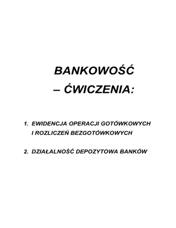 BANKOWOŚĆ – ĆWICZENIA: 1. EWIDENCJA OPERACJI GOTÓWKOWYCH I ROZLICZEŃ BEZGOTÓWKOWYCH 2. DZIAŁALNOŚĆ DEPOZYTOWA BANKÓW EWIDENCJA OPERACJI GOTÓWKOWYCH I ROZLICZEŃ BEZGOTÓWKOWYCH Grupa A I. a) b) c) d) Oceń, które z poniższych stwierdzeń jest prawdziwe (P), a które nieprawdziwe (N) egzemplarz A polecenia przelewu ostatecznie zostaje w banku wierzyciela banki komercyjne posiadają rachunki bieżące o nazwie „konto bieżące nostro” do dokumentacji podstawowej banku zalicza się m. in. asygnaty kasowe konto, które w podmiotach niefinansowych nazywane jest „kasa”, w bankach nosi nazwę „gotówka” e) operacje czynne banków to np. udzielenie kredytu bankowi B f) jedną z form wpłaty pieniędzy do banku są wpłaty do skarbca nocnego II. Uzupełnij zdanie: W obrocie wekslem trasowanym występują 3 podmioty. Wystawca weksla, tzw. …..(1) zleca dłużnikowi, czyli …..(2) zapłacenie kwoty wekslowej na rzecz wierzyciela zwanego ……(3). III. Wyróżnia się kilka form rozliczeń bezgotówkowych. Jedną z nich jest ............................................... Wystawiane jest przez dłużnika i służy do wydania bankowi polecenia przelania z rachunku bieżącego dłużnika na rachunek bieżący wierzyciela określonej kwoty. IV. Wyjaśnij pojęcia: a) akredytywa b) czek rozrachunkowy V. a) b) c) d) Dokumenty księgowe dotyczące obrotu gotówkowego banku: zawsze powodują zmiany w stanach kont to m. in. czek rozrachunkowy i wyciąg bankowy nie zawsze wywołują zmiany księgowe (np. protokół z otwarcia skarbca nocnego) nie powodują żadnych zmian na kontach VI. Obrót gotówkowy banku polega na przyjmowaniu wpłat i dokonywaniu wypłat. Wpłaty pieniędzy mogą odbywać się wyłącznie w formie wpłat gotówki do kasy banku. a) prawda b) fałsz Grupa B I. Oceń, które z poniższych stwierdzeń jest prawdziwe (P), a które nieprawdziwe (N) a) operacją bierną banku jest np. przyjęcie depozytu od banku B b) do dokumentacji uzupełniającej banku zalicza się m. in. wyciągi bankowe c) egzemplarz C polecenia przelewu ostatecznie zostaje w dokumentacji wierzyciela d) jedną z form wpłaty pieniędzy do banku jest wpłata do kasy banku e) egzemplarz D polecenia przelewu bank wierzyciela przesyła wierzycielowi informując go o wykonaniu dyspozycji f) podmioty niefinansowe posiadają rachunki bankowe w wybranych bankach komercyjnych II. Uzupełnij zdanie: Wpłaty gotówki do kasy banku mogą być dokonywane na 3 sposoby. Jedną z form jest wpłata do ……(1), dzięki której firma może dokonać wpłaty nawet nocą. Kolejny sposób wykorzystuje specjalny pojazd – mówimy więc o wpłacie za pośrednictwem …….(2). Dla klientów indywidualnych najprostszą z form jest natomiast wpłata ………(3). 2 III. Wyróżnia się kilka form rozliczeń bezgotówkowych. Jedną z nich jest ....................... Jest to dokument wystawiany przez dłużnika i wręczany wierzycielowi, który realizuje czek w banku, uzyskując zwiększenie swoich środków pieniężnych na rachunku bieżącym. IV. Wyjaśnij pojęcia: a) weksel trasowany b) polecenie przelewu V. Obrót gotówkowy banku polega na: a) przyjmowaniu wpłat i dokonywaniu wypłat b) przyjmowaniu wpłat wyłącznie do kasy banku c) przyjmowaniu i ewidencji poleceń przelewu d) prowadzeniu ewidencji kasowej VI. Operacje gotówkowe banku dokumentowane są różnymi dowodami księgowymi (asygnaty, protokoły, itd.). Wszystkie te dokumenty powodują zmiany w stanach kont. a) prawda b) fałsz Grupa A Zadanie praktyczne nr 1 Ewidencja na rachunkach własnych banków Saldo początkowe „konta bieżącego nostro” (w NBP) banku A wynosi 35 000 zł. Dokonaj ewidencji poniższych operacji: 1) pobranie gotówki z rachunku bieżącego nostro w NBP 8 000 zł 2) przekazanie środków na rachunek rezerwy obowiązkowej 2 000 zł 3) wpływ należności od innego banku z tytułu rozrachunków międzybankowych 14 000 zł 4) przyjęcie lokaty terminowej od banku B 10 000 zł 5) naliczenie odsetek dotyczących lokaty od banku B 60 zł Zadanie praktyczne nr 2 Ewidencja na rachunkach bankowych podmiotów niefinansowych Saldo początkowe na rachunku bieżącym firmy Omega w banku A wynosi 26 000 zł. Zaksięguj poniższe operacje. Zamknij konto „rachunki bieżące” i zinterpretuj jego saldo końcowe. 1) przyjęcie gotówki na rachunek firmy Omega (wpłata własna na podstawie bankowego dowodu wpłaty) 8 000 zł 2) otrzymanie od firmy Omega wniosku o otwarcie akredytywy na rzecz dostawcy Plus 5 000 zł 3) otrzymanie od innego banku polecenia przelewu (odcinki B i C) na rzecz firmy Omega 12 000 zł 4) otrzymanie od firmy Omega polecenia przelewu (odcinki A, B, C i D) na rzecz wierzyciela Z posiadającego rachunek w innym oddziale banku A 15 000 zł 3 Grupa B Zadanie praktyczne nr 1 Ewidencja operacji gotówkowych banku Saldo początkowe konta „gotówka” w banku A wynosi 50 000 zł. Zaksięguj poniższe operacje: 1) realizacja czeku gotówkowego z rachunku bieżącego podmiotu niefinansowego 5 000 zł 2) udzielenie kredytu gotówkowego 8 300 zł 1 000 zł 3) przyjęcie gotówki na rzecz klienta posiadającego rachunek w innym banku 4) klient dokonał wpłaty czynszu na rachunek prowadzony w innym oddziale banku A 800 zł Zadanie praktyczne nr 2 Ewidencja na rachunkach własnych banków Saldo początkowe „konta bieżącego nostro” (w NBP) banku A wynosi 46 000 zł, a konta „gotówka” 16 000 zł. Dokonaj ewidencji poniższych operacji. Zamknij „konto bieżące nostro” i zinterpretuj jego saldo końcowe. 1) odprowadzenie gotówki na rachunek w NBP 10 000 zł 2) opłata za usługi świadczone przez KIR 80 zł 3) spłata zobowiązania z tytułu rozrachunków międzybankowych 5 000 zł 4) zaciągnięcie kredytu w banku B 16 000 zł 5) naliczenie odsetek od zaciągniętego kredytu 140 zł 4 DZIAŁALNOŚĆ DEPOZYTOWA BANKÓW ZADANIE 1 Klient wpłacił 1 400 zł na lokatę terminową trzymiesięczną. Stopa procentowa