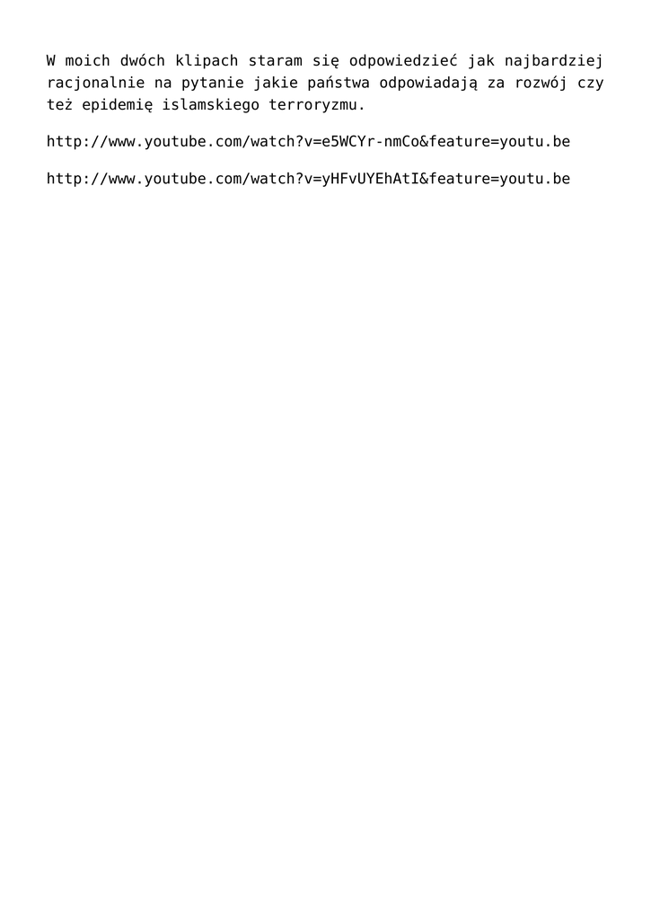 W moich dwóch klipach staram się odpowiedzieć jak najbardziej racjonalnie na pytanie jakie państwa odpowiadają za rozwój czy też epidemię islamskiego terroryzmu. http://www.youtube.com/watch?v=e5WCYr-nmCo&feature=youtu.be http://www.youtube.com/watch?v=yHFvUYEhAtI&feature=youtu.be
