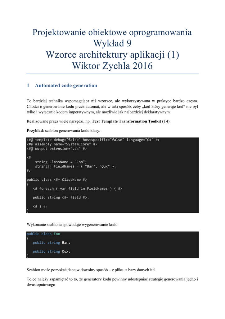 Chodzi o generowanie kodu przez automat, ale w taki sposób, żeby „kod który generuje kod” nie był