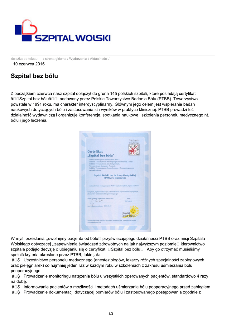 ścieżka do tekstu: / strona główna / Wydarzenia / Aktualności / 10 czerwca 2015 Szpital bez bólu Z początkiem czerwca nasz szpital dołączył do grona 145 polskich szpitali, które posiadają certyfikat â Szpital bez bóluâ •, nadawany przez Polskie Towarzystwo Badania Bólu (PTBB). Towarzystwo powstałe w 1991 roku, ma charakter interdyscyplinarny. Głównym jego celem jest wspieranie badań naukowych dotyczących bólu i zastosowania ich wyników w praktyce klinicznej. PTBB prowadzi też działalność wydawniczą i organizuje konferencje, spotkania naukowe i szkolenia personelu medycznego nt. bólu i jego leczenia. W myśl przesłania ,,uwolnijmy pacjenta od bólu przyświecającego działalności PTBB oraz misji Szpitala Wolskiego dotyczącej ,,zapewnienia świadczeń zdrowotnych na jak najwyższym poziomie kierownictwo szpitala podjęło decyzję o ubieganiu się o certyfikat Szpital bez bólu . Aby go otrzymać musieliśmy spełnić kryteria określone przez PTBB, takie jak: â Ş Uczestnictwo personelu medycznego (anestezjologów, lekarzy różnych specjalności zabiegowych oraz pielęgniarek) co najmniej jeden raz w każdym roku w szkoleniach z zakresu uśmierzania bólu pooperacyjnego. â Ş Prowadzenie monitoringu natężenia bólu u wszystkich operowanych pacjentów, standardowo 4 razy na dobę. â Ş Informowanie pacjentów o możliwości i metodach uśmierzania bólu pooperacyjnego przed zabiegiem. â Ş Prowadzenie dokumentacji dotyczącej pomiarów bólu i zastosowanego postępowania zgodnie z 1/2 rekomendacjami uśmierzania bólu. â Ş Monitorowanie ewentualnych działań niepożądanych zastosowanego leczenia na załączonym formularzu działań niepożądanych. Realizowany u nas program dotyczy pacjentów po zabiegach operacyjnych. Prowadzony jest zgodnie z obowiązującą w szpitalu procedurą (określoną zarządzeniem dyrektora szpitala) w następujących oddziałach: â Ş anestezjologii i intensywnej terapii (w sali wybudzeń), â Ş chirurgii ogólnej i onkologicznej z częścią urazową, â Ş chirurgii naczyniowej, â Ş kardiologicznym (u pacjentów po wszczepieniu kardiowerterów i stymulatorów). Na spotkaniu z komisją certyfikacyjną składającą się z członków grupy ekspertów: prof. dr. hab. Jana Dobrogowskiego - prezesa PTBB, Jacka Łopuszko - koordynatora projektu Szpital bez bólu , Ewy Popiołek i dr. Jarosława Woronia Szpital Wolski reprezentowały: â Ş Jadwiga Saganowska, pełnomocnik dyrektora szpitala ds. jakości â Ş Agnieszka Rytel Rylska, ordynator Oddziału anestezjologii i intensywnej terapii. Decyzją komisji Szpital Wolski otrzymał certyfikat Szpital bez bólu ważny do 1 czerwca 2018 roku, czyli na 3 lata, z możliwością przedłużenia jego ważności na kolejne lata, po uprzednim przystąpieniu do ponownej weryfikacji. W zamyśle PTBB certyfikat Szpital bez bólu gwarantuje wysoki poziom usług w zakresie medycyny bólu. W związku z tym Towarzystwo będzie zabiegać o uwzględnienie posiadania tego certyfikatu przez szpitale, oddziały i poradnie podczas konkursów ofert prowadzonych przez NFZ, a także przy ustalaniu wysokości limitów i kosztów kontraktowanych usług. data wydruku: 9 marzec 2017; 01:37:53 adres dokumentu: http://www.wolski.med.pl//index.php?LANG=pl&page_ID=21&art_ID=433 2/2