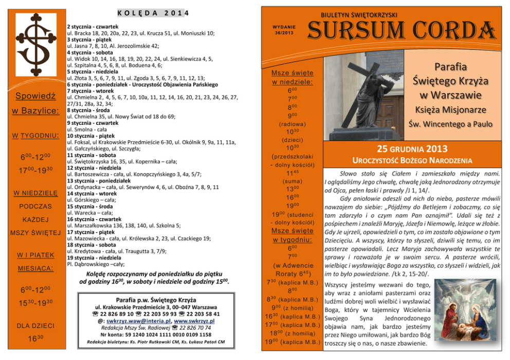 KOLĘDA 2014 Spowiedź w Bazylice: W TYGODNIU : 00 6 -12 00 17 00 -19 30 W NIEDZIELĘ PODCZAS KAŻDEJ MSZY ŚWIĘTEJ W I PIĄTEK MIESIĄCA : 00 6 -12 00 15 30 -19 30 DLA DZIECI 16 30 2 stycznia - czwartek ul. Bracka 18, 20, 20a, 22, 23, ul. Krucza 51, ul. Moniuszki 10; 3 stycznia - piątek ul. Jasna 7, 8, 10, Al. Jerozolimskie 42; 4 stycznia - sobota ul. Widok 10, 14, 16, 18, 19, 20, 22, 24, ul. Sienkiewicza 4, 5, ul. Szpitalna 4, 5, 6, 8, ul. Boduena 4, 6; 5 stycznia - niedziela ul. Złota 3, 5, 6, 7, 9, 11, ul. Zgoda 3, 5, 6, 7, 9, 11, 12, 13; 6 stycznia - poniedziałek - Uroczystość Objawienia Pańskiego 7 stycznia - wtorek ul. Chmielna 2, 4, 5, 6, 7, 10, 10a, 11, 12, 14, 16, 20, 21, 23, 24, 26, 27, 27/31, 28a, 32, 34; 8 stycznia - środa ul. Chmielna 35, ul. Nowy Świat od 18 do 69; 9 stycznia - czwartek ul. Smolna - cała 10 stycznia - piątek ul. Foksal, ul Krakowskie Przedmieście 6-30, ul. Okólnik 9, 9a, 11, 11a, ul. Gałczyńskiego, ul. Szczygła; 11 stycznia - sobota ul. Świętokrzyska 16, 35, ul. Kopernika – cała; 12 stycznia - niedziela ul. Bartoszewicza - cała, ul. Konopczyńskiego 3, 4a, 5/7; 13 stycznia - poniedziałek ul. Ordynacka – cała, ul. Sewerynów 4, 6, ul. Oboźna 7, 8, 9, 11 14 stycznia - wtorek ul. Górskiego – cała; 15 stycznia - środa ul. Warecka – cała; 16 stycznia - czwartek ul. Marszałkowska 136, 138, 140, ul. Szkolna 5; 17 stycznia - piątek ul. Mazowiecka - cała, ul. Królewska 2, 23, ul. Czackiego 19; 18 stycznia - sobota ul. Kredytowa - cała, ul. Traugutta 3, 7/9; 19 stycznia - niedziela Pl. Dąbrowskiego –cały; Kolędę rozpoczynamy od poniedziałku do piątku od godziny 1630, w soboty i niedziele od godziny 1500. Parafia p.w. Świętego Krzyża ul. Krakowskie Przedmieście 3, 00–047 Warszawa 22 826 89 10 22 203 59 93 22 203 58 41 @: [email protected], www.swkrzyz.pl Redakcja Mszy Św. Radiowej 22 826 70 74 Nr konta: 59 1240 1024 1111 0010 0109 1158 Redakcja biuletynu: Ks. Piotr Rutkowski CM, Ks. Łukasz Patoń CM BIULETYN ŚWIĘTOKRZYSKI W Y D AN I E 36 / 20 1 3 SURSUM CORDA Msze święte w niedziele: 600 700 800 900 (radiowa) 10 30 Parafia Świętego Krzyża w Warszawie Księża Misjonarze Św. Wincentego a Paulo (dzieci) 10 3 0 ( przedszkolaki - dolny kościół) 11 4 5 (suma) 13 0 0 16 0 0 19 0 0 19 0 0 (studenci - dolny kościół) Msze święte w tygodniu: 600 700 (w Adwencie Roraty 6 4 5 ) 7 3 0 (kaplica M.B.) 800 8 3 0 (kaplica M.B.) 9 0 0 (z homilią) 16 3 0 (kaplica M.B.) 17 0 0 (kaplica M.B.) 18 0 0 (z homilią) 19 0 0 ( kaplica M.B.) 25 GRUDNIA 2013 UROCZYSTOŚĆ BOŻEGO NARODZENIA Słowo stało się Ciałem i zamieszkało między nami. I oglądaliśmy Jego chwałę, chwałę jaką Jednorodzony otrzymuje od Ojca, pełen łaski i prawdy /J 1, 14/. Gdy aniołowie odeszli od nich do nieba, pasterze mówili nawzajem do siebie: „Pójdźmy do Betlejem i zobaczmy, co się tam zdarzyło i o czym nam Pan oznajmił”. Udali się też z pośpiechem i znaleźli Maryję, Józefa i Niemowlę, leżące w żłobie. Gdy Je ujrzeli, opowiedzieli o tym, co im zostało objawione o tym Dziecięciu. A wszyscy, którzy to słyszeli, dziwili się temu, co im pasterze opowiadali. Lecz Maryja zachowywała wszystkie te sprawy i rozważała je w swoim sercu. A pasterze wrócili, wielbiąc i wysławiając Boga za wszystko, co słyszeli i widzieli, jak im to było powiedziane. /Łk 2, 15-20/. Wszyscy jesteśmy wezwani do tego, aby wraz z aniołami pasterzami oraz ludźmi dobrej woli wielbić i wysławiać Boga, który w tajemnicy Wcielenia Swojego Syna Jednorodzonego objawia nam, jak bardzo jesteśmy przez Niego umiłowani, jak bardzo Bóg troszczy się o nas, o nasze zbawienie. Kancelaria parafialna: w dni powszednie w godzinach. 1000 - 1200 oraz 00 00 16 - 18 w soboty w godzinach 1000 - 1200 Ks. Proboszcz Zygmunt Robert Nieskończona miłość Boga do nas stała się widzialna w Chrystusie. /Św. Bernard/ Przez Wcielenie Syna Bożego zostaliśmy w Nim usynowieni. Bóg przybliża się do ludzkości w sposób nieporównany. Jezus Chrystus poczęty za sprawą Ducha Świętego i narodzony z Maryi Dziewicy jest Emmanuelem, tzn. Bogiem z nami. Rozważając tę zdumiewającą tajemnicę, święty papież Leon Wielki (+461) w Kazaniu o Narodzeniu Pańskim wołał: Poznaj swoją godność chrześcijaninie! Stałeś się uczestnikiem Boskiej natury… Pamiętaj, że zostałeś wydarty mocom ciemności i przeniesiony do światła i Królestwa Bożego. W ubóstwie żłóbka kontemplujemy doniosły fakt Wcielenia: Bóg staje się człowiekiem, aby spotkać każdego z nas. /Bł. Jan Paweł II/ Berdychowski CM przyjmuje w środy Anioł Pański i Komunia św. Drodzy Parafianie i Wszyscy modlący się w Bazylice Świętego Krzyża oraz nawiedzający tę naszą misjonarską świątynię! Niech przeżycie na nowo, w świętej liturgii Kościoła, pamiątki Narodzenia Pana, będzie okazją do osobistego i serdecznego spotkania z Nim! Niech Nowonarodzony o godz. 1200 napełni Wasze serca Swoim – Bożym pokojem i prawdziwą radością. Niech On – Syn Boży, Światłość Adoracja świata (por. J 8, 12), rozświetla wszystkie mroki Najświętszego wewnętrzne i smutki, niosąc nadzieję, umacniając wiarę Sakramentu: oraz rozpalając serca Bożą miłością! a Nowy Rok Pański 2014 życzymy Wam Kaplica błogosławieństwa Bożego i obfitości wszelkich Matki Bożej potrzebnych darów Bożych do życia zgodnego Częstochowskiej z Chrystusową Ewangelią. Łączymy się duchowo z Wami Wszystkimi przy wigilijnym stole, zwłaszcza z chorymi, od poniedziałku starszymi wiekiem, samotnymi, i zapewniamy o naszej do piątku modlitwie za Was! w godzinach Ks. Proboszcz Zygmunt Robert Berdychowski CM 30 30 9 - 16 wraz z księżmi posługującymi w Bazylice Świętego Krzyża w dni powszednie: N 29 grudnia – Niedziela w oktawie Narodzenia Pańskiego Nabożeństwa Święto Świętej Rodziny – Jezusa, Maryi i Józefa i Nowenny: W szczególny sposób przyzywamy wstaw