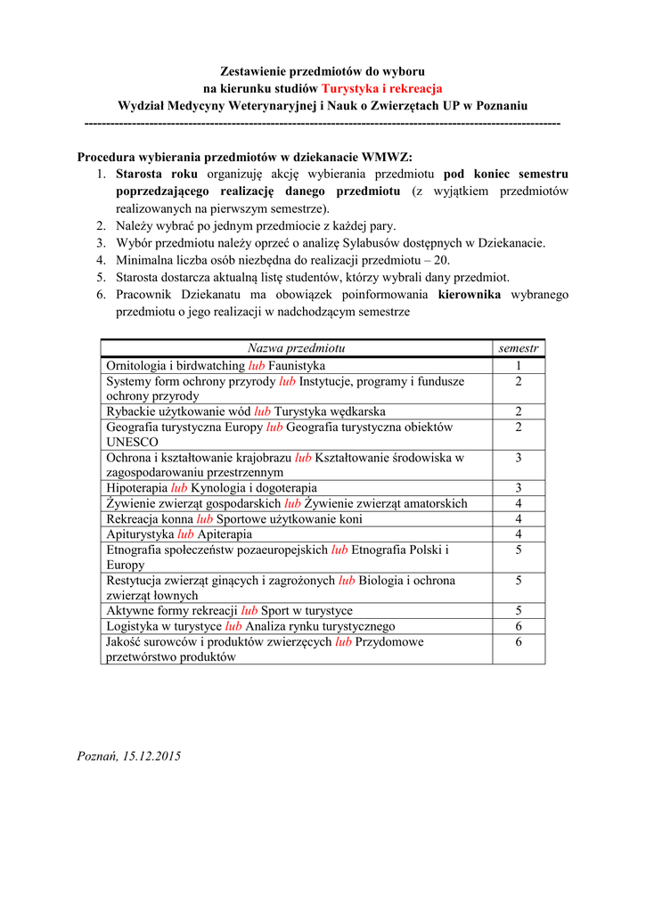Zestawienie przedmiotów do wyboru na kierunku studiów Turystyka i rekreacja Wydział Medycyny Weterynaryjnej i Nauk o Zwierzętach UP w Poznaniu -------------------------------------------------------------------------------------------------------------Procedura wybierania przedmiotów w dziekanacie WMWZ: 1. Starosta roku organizuję akcję wybierania przedmiotu pod koniec semestru poprzedzającego realizację danego przedmiotu (z wyjątkiem przedmiotów realizowanych na pierwszym semestrze). 2. Należy wybrać po jednym przedmiocie z każdej pary. 3. Wybór przedmiotu należy oprzeć o analizę Sylabusów dostępnych w Dziekanacie. 4. Minimalna liczba osób niezbędna do realizacji przedmiotu – 20. 5. Starosta dostarcza aktualną listę studentów, którzy wybrali dany przedmiot. 6. Pracownik Dziekanatu ma obowiązek poinformowania kierownika wybranego przedmiotu o jego realizacji w nadchodzącym semestrze Nazwa przedmiotu Ornitologia i birdwatching lub Faunistyka Systemy form ochrony przyrody lub Instytucje, programy i fundusze ochrony przyrody Rybackie użytkowanie wód lub Turystyka wędkarska Geografia turystyczna Europy lub Geografia turystyczna obiektów UNESCO Ochrona i kształtowanie krajobrazu lub Kształtowanie środowiska w zagospodarowaniu przestrzennym Hipoterapia lub Kynologia i dogoterapia Żywienie zwierząt gospodarskich lub Żywienie zwierząt amatorskich Rekreacja konna lub Sportowe użytkowanie koni Apiturystyka lub Apiterapia Etnografia społeczeństw pozaeuropejskich lub Etnografia Polski i Europy Restytucja zwierząt ginących i zagrożonych lub Biologia i ochrona zwierząt łownych Aktywne formy rekreacji lub Sport w turystyce Logistyka w turystyce lub Analiza rynku turystycznego Jakość surowców i produktów zwierzęcych lub Przydomowe przetwórstwo produktów Poznań, 15.12.2015 semestr 1 2 2 2 3 3 4 4 4 5 5 5 6 6