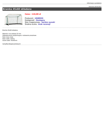Informacje o produkcie Utworzono 09-03-2017 Bramka 45x60 składana Cena : 110,00 zł Producent : UNIBROS Dostępność : Dostępny Stan magazynowy : bardzo wysoki Średnia ocena : brak recenzji Bramka 45x60 składana Materiał: rura stalowa 22 mm Zabezpieczenie antykorozyjne: malowanie proszkowe Kolor ramy: biały Kolor siatki: zielony Oczko siatki: 45x45mm Certyfikat Bezpieczeństwa B