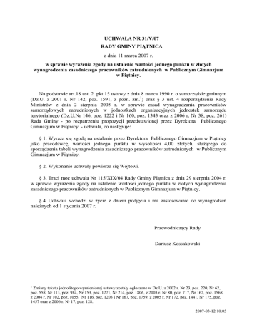 UCHWAŁA NR 31/V/07 RADY GMINY PIĄTNICA z dnia 11 marca 2007 r. w sprawie wyrażenia zgody na ustalenie wartości jednego punktu w złotych wynagrodzenia zasadniczego pracowników zatrudnionych w Publicznym Gimnazjum w Piątnicy. Na podstawie art.18 ust. 2 pkt 15 ustawy z dnia 8 marca 1990 r. o samorządzie gminnym (Dz.U. z 2001 r. Nr 142, poz. 1591, z późn. zm.1) oraz § 3 ust. 4 rozporządzenia Rady Ministrów z dnia 2 sierpnia 2005 r. w sprawie zasad wynagradzania pracowników samorządowych zatrudnionych w jednostkach organizacyjnych jednostek samorządu terytorialnego (Dz.U.Nr 146, poz. 1222 i Nr 160, poz. 1343 oraz z 2006 r. Nr 38, poz. 261) Rada Gminy - po rozpatrzeniu propozycji przedstawionej przez Dyrektora Publicznego Gimnazjum w Piątnicy - uchwala, co następuje: § 1. Wyraża się zgodę na ustalenie przez Dyrektora Publicznego Gimnazjum w Piątnicy jako pracodawcę, wartości jednego punktu w wysokości 4,00 złotych, służącego do sporządzenia tabeli wynagrodzenia zasadniczego pracowników zatrudnionych w Publicznym Gimnazjum w Piątnicy. § 2. Wykonanie uchwały powierza się Wójtowi. § 3. Traci moc uchwała Nr 115/XIX/04 Rady Gminy Piątnica z dnia 29 sierpnia 2004 r. w sprawie wyrażenia zgody na ustalenie wartości jednego punktu w złotych wynagrodzenia zasadniczego pracowników zatrudnionych w Publicznym Gimnazjum w Piątnicy. § 4. Uchwała wchodzi w życie z dniem podjęcia i ma zastosowanie do wynagrodzeń należnych od 1 stycznia 2007 r. Przewodniczący Rady Dariusz Kossakowski 1 Zmiany tekstu jednolitego wymienionej ustawy zostały ogłoszone w Dz.U. z 2002 r. Nr 23, poz. 220, Nr 62, poz. 558, Nr 113, poz. 984, Nr 153, poz. 1271, Nr 214, poz. 1806, z 2003 r. Nr 80, poz. 717, Nr 162, poz. 1568, z 2004 r. Nr 102, poz. 1055, Nr 116, poz. 1203 i Nr 167, poz. 1759, z 2005 r. Nr 172, poz. 1441, Nr 175, poz. 1457 oraz z 2006 r. Nr 17, poz. 128. 2007-03-12 10:05