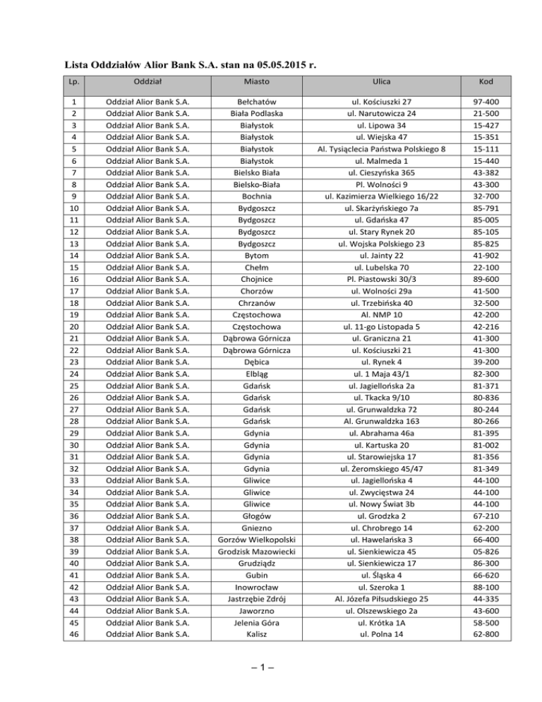 Lista Oddziałów Alior Bank S.A. stan na 05.05.2015 r.