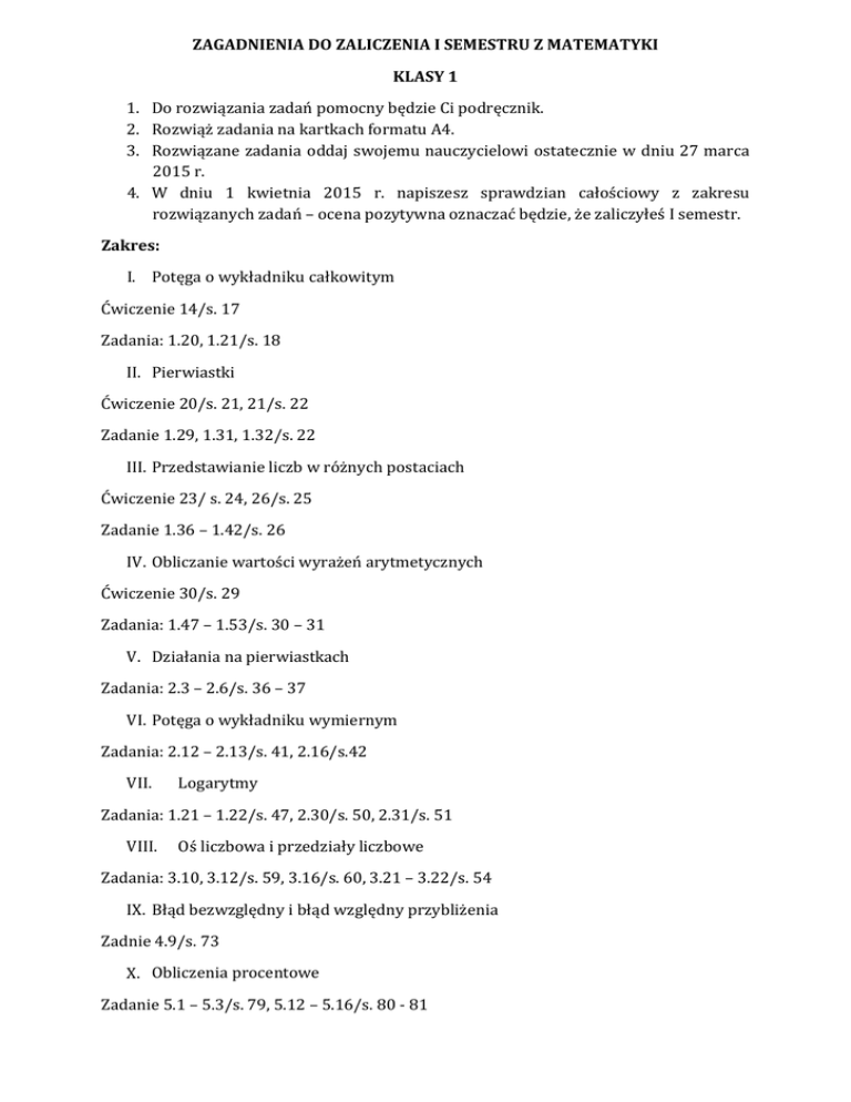 ZAGADNIENIA DO ZALICZENIA I SEMESTRU Z MATEMATYKI KLASY 1 1. Do rozwiązania zadań pomocny będzie Ci podręcznik. 2. Rozwiąż zadania na kartkach formatu A4. 3. Rozwiązane zadania oddaj swojemu nauczycielowi ostatecznie w dniu 27 marca 2015 r. 4. W dniu 1 kwietnia 2015 r. napiszesz sprawdzian całościowy z zakresu rozwiązanych zadań – ocena pozytywna oznaczać będzie, że zaliczyłeś I semestr. Zakres: I. Potęga o wykładniku całkowitym Ćwiczenie 14/s. 17 Zadania: 1.20, 1.21/s. 18 II. Pierwiastki Ćwiczenie 20/s. 21, 21/s. 22 Zadanie 1.29, 1.31, 1.32/s. 22 III. Przedstawianie liczb w różnych postaciach Ćwiczenie 23/ s. 24, 26/s. 25 Zadanie 1.36 – 1.42/s. 26 IV. Obliczanie wartości wyrażeń arytmetycznych Ćwiczenie 30/s. 29 Zadania: 1.47 – 1.53/s. 30 – 31 V. Działania na pierwiastkach Zadania: 2.3 – 2.6/s. 36 – 37 VI. Potęga o wykładniku wymiernym Zadania: 2.12 – 2.13/s. 41, 2.16/s.42 VII. Logarytmy Zadania: 1.21 – 1.22/s. 47, 2.30/s. 50, 2.31/s. 51 VIII. Oś liczbowa i przedziały liczbowe Zadania: 3.10, 3.12/s. 59, 3.16/s. 60, 3.21 – 3.22/s. 54 IX. Błąd bezwzględny i błąd względny przybliżenia Zadnie 4.9/s. 73 X. Obliczenia procentowe Zadanie 5.1 – 5.3/s. 79, 5.12 – 5.16/s. 80 - 81