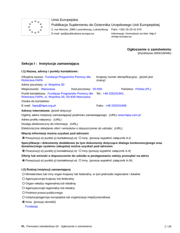 Unia Europejska Publikacja Suplementu do Dziennika Urzędowego Unii Europejskiej 2, rue Mercier, 2985 Luxembourg, Luksemburg Faks: +352 29 29 42 670 E-mail: [email protected] Informacje i formularze on-line: http:// simap.europa.eu Ogłoszenie o zamówieniu (Dyrektywa 2004/18/WE) Sekcja I : Instytucja zamawiająca I.1) Nazwa, adresy i punkty kontaktowe: Oficjalna nazwa: Fundacja Programów Pomocy dla Rolnictwa FAPA Krajowy numer identyfikacyjny: (jeżeli jest znany) _____ Adres pocztowy: ul. Wspólna 30 Miejscowość: Warszawa Kod pocztowy: 00-930 Punkt kontaktowy: Fundacja Programów Pomocy dla Rolnictwa FAPA, ul. Wspólna 30, 00-930 Warszawa Państwo: Polska (PL) Tel.: +48 226231901 Osoba do kontaktów: _____ E-mail: [email protected] Faks: +48 226231909 Adresy internetowe: (jeżeli dotyczy) Ogólny adres instytucji zamawiającej/ podmiotu zamawiającego: (URL) www.fapa.com.pl Adres profilu nabywcy: (URL) _____ Dostęp elektroniczny do informacji: (URL) _____ Elektroniczne składanie ofert i wniosków o dopuszczenie do udziału: (URL) _____ Więcej informacji można uzyskać pod adresem Powyższy(-e) punkt(-y) kontaktowy(-e) Inny (proszę wypełnić załącznik A.I) Specyfikacje i dokumenty dodatkowe (w tym dokumenty dotyczące dialogu konkurencyjnego oraz dynamicznego systemu zakupów) można uzyskać pod adresem Powyższy(-e) punkt(-y) kontaktowy(-e) Inny (proszę wypełnić załącznik A.II) Oferty lub wnioski o dopuszczenie do udziału w postępowaniu należy przesyłać na adres Powyższy(-e) punkt(-y) kontaktowy(-e) Inny (proszę wypełnić załącznik A.III) I.2) Rodzaj instytucji zamawiającej Ministerstwo lub inny organ krajowy lub federalny, w tym jednostki regionalne i lokalne Agencja/urząd krajowy lub federalny Organ władzy regionalnej lub lokalnej Agencja/urząd regionalny lub lokalny Podmiot prawa publicznego Instytucja/agencja europejska lub organizacja międzynarodowa Inna: (proszę określić) Fundacja PL Formularz standardowy 02 - Ogłoszenie o zamówieniu 1 / 26 I.3) Główny przedmiot lub przedmioty działalności Ogólne usługi publiczne Obrona Porządek i bezpieczeństwo publiczne Środowisko Sprawy gospodarcze i finansowe Zdrowie Budownictwo i obiekty komunalne Ochrona socjalna Rekreacja, kultura i religia Edukacja Inny: (proszę określić) Rozwój obszarów wiejskich, rolnictwa, rynków rolnych oraz bankowości spółdzielczej I.4) Udzielenie zamówienia w imieniu innych instytucji zamawiających Instytucja zamawiająca dokonuje zakupu w imieniu innych instytucji zamawiających: tak nie więcej informacji o tych instytucjach zamawiających można podać w załączniku A PL Formularz standardowy 02 - Ogłoszenie o zamówieniu 2 / 26 Sekcja II : Przedmiot zamówienia II.1) Opis : II.1.1) Nazwa nadana zamówieniu przez instytucję zamawiającą : 64/KSOW/PN-U/2014 Zakup usług polegających na zapewnieniu kompleksowej realizacji projektu pn. „Współpraca międzyinstytucjonalna i międzynarodowa wobec wyzwań nowego okresu programowania 2014-2020 w zakresie polityki zrównoważonego rozwoju obszarów wiejskich” II.1.2) Rodzaj zamówienia oraz lokalizacja robót budowlanych, miejsce realizacji dostawy lub świadczenia usług : Wybrać wyłącznie jedną kategorię – roboty budowlane, dostawy lub usługi – która najbardziej odpowiada konkretnemu przedmiotowi zamówienia lub zakupu Roboty budowlane Wykonanie Zaprojektowanie i wykonanie Wykonanie, za pomocą dowolnych środków, obiektu budowlanego odpowiadającego wymogom określonym przez instytucję zamawiającą Dostawy Kupno Dzierżawa Najem Leasing Połączenie powyższych form Usługi Kategoria usług: nr: 27 Zob. kategorie usług w załączniku C1 Główne miejsce lub lokalizacja robót budowlanych, miejsce realizacji dostawy lub świadczenia usług : Polska i Węgry Kod NUTS: PL Kod NUTS: HU II.1.3) Informacje na temat zamówienia publicznego, umowy ramowej lub dynamicznego systemu zakupów (DSZ): Ogłoszenie dotyczy zamówienia publicznego Ogłoszenie dotyczy zawarcia umowy ramowej Ogłoszenie dotyczy utworzenia dynamicznego systemu zakupów (DSZ) II.1.4) Informacje na temat umowy ramowej : (jeżeli dotyczy) Umowa ramowa z kilkoma wykonawcami Umowa ramowa z jednym wykonawcą Liczba : _____ albo (jeżeli dotyczy) liczba maksymalna : _____ uczestników planowanej umowy ramowej Czas trwania umowy ramowej Okres w latach : _____ albo w miesiącach : _____ Uzasadnienie dla umowy ramowej, której czas trwania przekracza okres czterech lat : _____ Szacunkowa całkowita wartość zakupów w całym okresie obowiązywania umowy ramowej (jeżeli dotyczy, proszę podać wyłącznie dane liczbowe) Szacunkowa wartość bez VAT : _____ Waluta : albo Zakres: między : _____ : i : _____ : Waluta : PL Formularz standardowy 02 - Ogłoszenie o zamówieniu 3 / 26 Częstotliwość oraz wartość zamówień, które zostaną udzielone : (jeżeli jest znana) _____ II.1.5) Krótki opis zamówienia lub zakupu : Przedmiotem zamówienia jest kompleksowa realizacja projektu pn. „Współpraca międzyinstytucjonalna i międzynarodowa wobec wyzwań nowego okresu programowania 2014-2020 w zakresie polityki zrównoważonego rozwoju obszarów wiejskich”. Celem ogólnym projektu jest wspieranie efektywnego sposobu wymiany informacji w ramach polsko-węgierskiej współpracy międzyinstytucjonalnej w zakresie promocji zrównoważonego rozwoju obszarów wiejskich na obszarze województwa lubelskiego. Cele szczegółowe: 1 Wymiana informacji pomiędzy lokalnymi grupami działania z terenu woj. lubelskiego (powiat radzyński i lubelski) w poszczególnych sektorach w zakresie zrównoważonego rozwoju obszarów wiejskich 2. Identyfikacja najlepszych praktyk w zakresie przygotowywania i realizacji projektów z zakresu rolnictwa i rewitalizacji społeczno-gospodarczej obszarów wiejskich 3. Identyfikacja zasobów i potrzeb w zakresie współpracy międzynarodowej pomiędzy różnymi instytucjami 4. Wypracowanie celów wspólnych działa