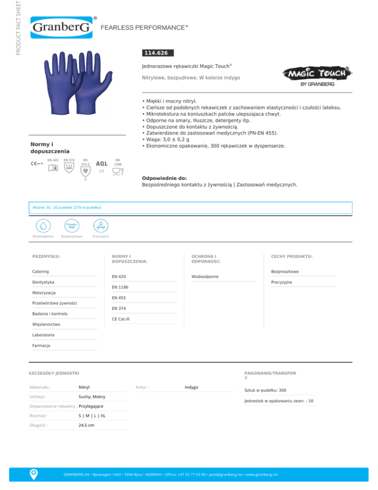 PRODUCT FACT SHEET 114.626 Jednorazowe rękawiczki Magic Touch® Nitrylowe, bezpudrowe. W kolorze indygo • Miękki i mocny nitryl. • Cieńsze od podobnych rekawiczek z zachowaniem elastyczności i czułości lateksu. • Mikrotekstura na koniuszkach palców ulepszajaca chwyt. • Odporne na smary, tłuszcze, detergenty itp. • Dopuszczone do kontaktu z żywnością. • Zatwierdzone do zastosowań medycznych (PN-EN 455). • Waga: 3,0 ± 0,2 g • Ekonomiczne opakowanie, 300 rękawiczek w dyspenserze. Normy i dopuszczenia EN 420 EN 374 EN 374-2 EN 1186 1,5 Odpowiednie do: Bezpośredniego kontaktu z żywnością | Zastosowań medycznych. 2 Ważne: XL: 10 pudełek (270 w pudełku) Wodoodporne Bezproszkowe Precyzyjne PRZEMYSŁU: NORMY I DOPUSZCZENIA: OCHRONA I ODPORNOŚĆ: EN 420 Wodoodporne Catering CECHY PRODUKTU: Bezproszkowe Dentystyka Precyzyjne EN 1186 Motoryzacja EN 455 Przetwórstwo żywności EN 374 Badania i kontrola CE Cat.III Więziennictwo Laboratoria Farmacja SZCZEGÓŁY JEDNOSTKI Materiału : Nitryl Uchwyt : Suchy, Mokry PAKOWANIE/TRANSPOR T Kolor : Indygo Sztuk w pudełku: 300 Jednostek w opakowaniu zewn. : 10 Dopasowanie rękawicy : Przylegające Rozmiar : S | M | L | XL Długość : 24,5 cm GRANBERG AS • Bjoavegen 1442 • 5584 Bjoa • NORWAY • Office: +47 53 77 53 00 • [email protected] • www.granberg.no