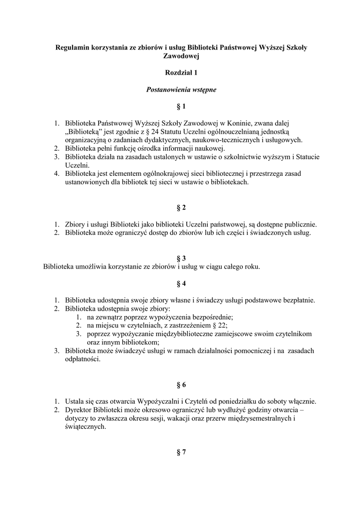 Regulamin korzystania ze zbiorów i usług Biblioteki Państwowej Wyższej Szkoły Zawodowej Rozdział 1 Postanowienia wstępne §1 1. Biblioteka Państwowej Wyższej Szkoły Zawodowej w Koninie, zwana dalej „Biblioteką” jest zgodnie z § 24 Statutu Uczelni ogólnouczelnianą jednostką organizacyjną o zadaniach dydaktycznych, naukowo-tecznicznych i usługowych. 2. Biblioteka pełni funkcję ośrodka informacji naukowej. 3. Biblioteka działa na zasadach ustalonych w ustawie o szkolnictwie wyższym i Statucie Uczelni. 4. Biblioteka jest elementem ogólnokrajowej sieci bibliotecznej i przestrzega zasad ustanowionych dla bibliotek tej sieci w ustawie o bibliotekach. §2 1. Zbiory i usługi Biblioteki jako biblioteki Uczelni państwowej, są dostępne publicznie. 2. Biblioteka może ograniczyć dostęp do zbiorów lub ich części i świadczonych usług. §3 Biblioteka umożliwia korzystanie ze zbiorów i usług w ciągu całego roku. §4 1. Biblioteka udostępnia swoje zbiory własne i świadczy usługi podstawowe bezpłatnie. 2. Biblioteka udostępnia swoje zbiory: 1. na zewnątrz poprzez wypożyczenia bezpośrednie; 2. na miejscu w czytelniach, z zastrzeżeniem § 22; 3. poprzez wypożyczanie międzybiblioteczne zamiejscowe swoim czytelnikom oraz innym bibliotekom; 3. Biblioteka może świadczyć usługi w ramach działalności pomocniczej i na zasadach odpłatności. §6 1. Ustala się czas otwarcia Wypożyczalni i Czytelń od poniedziałku do soboty włącznie. 2. Dyrektor Biblioteki może okresowo ograniczyć lub wydłużyć godziny otwarcia – dotyczy to zwłaszcza okresu sesji, wakacji oraz przerw międzysemestralnych i świątecznych. §7 Warunki i sposoby korzystania ze zbiorów i usług Wypożyczalni i Czytelń precyzują regulaminy cząstkowe zawarte w rozdziałach 2, 3, 4. Rozdział 2 Regulamin Wypożyczalni §8 Wypożyczalnia udostępnia za zewnątrz przede wszystkim podręczniki i lektury drogą wypożyczeń indywidualnych bezpośrednich. §9 1. Prawo korzystania z usług Wypożyczalni mają osoby w niej zarejestrowane i dysponujące aktualną kartą biblioteczną. 2. Poprzez „kartę biblioteczną” należy rozumieć: 1. dla studentów posiadających Elektroniczną Legitymację Studencką – ELS, zarejestrowaną w komputerowym systemie bibliotecznym; 2. dla pozostałych użytkowników - Kartę Biblioteczną wydaną w Bibliotece. 3. W celu rejestracji Czytelnik przedstawia: 1. ELS – przypadku studenta; 2. dokument tożsamości – w przypadku innych osób. 4. Karta biblioteczna jest ważna w danym roku akademickim. 5. Karta biblioteczna jest aktualizowana na kolejny rok akademicki po uregulowaniu przez Czytelnika zobowiązań wobec Biblioteki oraz po uiszczeniu opłaty aktywacyjnej. § 10 1. Ilość wypożyczonych jednorazowo wypożyczeń indywidualnych bezpośrednich regulują bieżące ustalenia Wypożyczalni. 2. Wypożyczalnia ustala górną granicę ilości posiadanych na koncie materiałów bibliotecznych. 3. Wypożyczający nie ma prawa wypożyczać dalszych egzemplarzy książek tego samego wydania. § 11 1. Czytelnik, poszukujący książki nie znajdującej się w zbiorach Biblioteki, może wystąpić o jej sprowadzenie z innej biblioteki w drodze zamówienia międzybibliotecznego. 2. Książki sprowadzone w drodze zamówienia międzybibliotecznego udostępniane są na miejscu w Czytelni. 3. Pracownik przyjmuje rewersy zamówień, pomaga w ich prawidłowym wypełnieniu, wysyła oraz zawiadamia o nadejściu przesyłki. § 12 1. Terminy zwrotów wypożyczonych materiałów bibliotecznych określa Dyrektor Biblioteki. 2. Termin zwrotu wypożyczonych materiałów bibliotecznych może być przedłużony przed upływem pierwotnie ustalonego terminu zwrotu; nie dłużej, jak do końca roku akademickiego. 3. Dyrektor Biblioteki może skrócić okres wypożyczenia materiałów bibliotecznych wypożyczanych i wypożyczonych. 4. Czytelnik ma możliwość zamawiania i rezerwacji materiałów bibliotecznych poprzez katalog online. 5. Poprzez „rezerwację” rozumie się księgozbiór aktualnie dostępny w Wypożyczalni, natomiast przez „zamówienia” rozumie się księgozbiór, który w danym momencie jest wypożyczony przez innych czytelników. 6. Z powodu otwartego dostępu Czytelników do księgozbioru w Bibliotece, rezerwacji dokonywać można poza godzinami otwarcia Wypożyczalni. Zamawiać książki można całą dobę. § 13 1. Zbiory Wypożyczalni wykorzystuje czytelnik na miejscu lub wypożycza na zewnątrz na zasadzie wolnego dostępu do półek. 2. Wypożyczane egzemplarze przedkłada Czytelnik wraz z kartą biblioteczną bibliotekarzowi, z zastrzeżeniem ust. 3. 3. W przypadku wypożyczeń magazynowych Czytelnik zobowiązany jest złożyć zamówienie osobiście w Wypożyczalni. Odbioru zamówionej ksiązki dokonuje się w dniu następnym. 4. Po zarejestrowaniu wypożyczeń lub zwrocie materiałów bibliotecznych Czytelnik zobowiązany jest sprawdzić stan swojego konta a ewentualne uwagi zgłosić przed opuszczeniem Biblioteki. § 14 1. Użytkowników Wypożyczalni obowiązują powszechnie stosowane zasady korzystania z instytucji użyteczności publicznej oraz bezwzględnie przepisy porządkowe ogłoszone przez Bibliotekę. 2. Użytkownicy mają obowiązek szczególnego przestrzegania przepisów bhp i p-poż obowiązujących w Bibliotece oraz szanowania społecznych zbiorów bibliotecznych, wyposażeń i urządzeń Biblioteki. 3. Wypożyczających obowiązuje zgłaszanie zauważonych w wyposażonych materiałach braków i uszkodzeń. 4. Na wypożyczającym spoczywa obowiązek powiadomienia Wypożyczalni o każdorazowej zmianie stałego miejsca zamieszkania, zmianie nazwiska, zmianie wydziału, zagubieniu lub zniszczeniu karty bibliotecznej. 5. Wypożyczalnia nie ponosi odpowiedzialności za posługiwanie się kartą biblioteczną przez osoby drugie. 6. Wypożyczalnia potwierdza uregulowanie zobowiązań wobec niej i Biblioteki na kartach obiegowych o