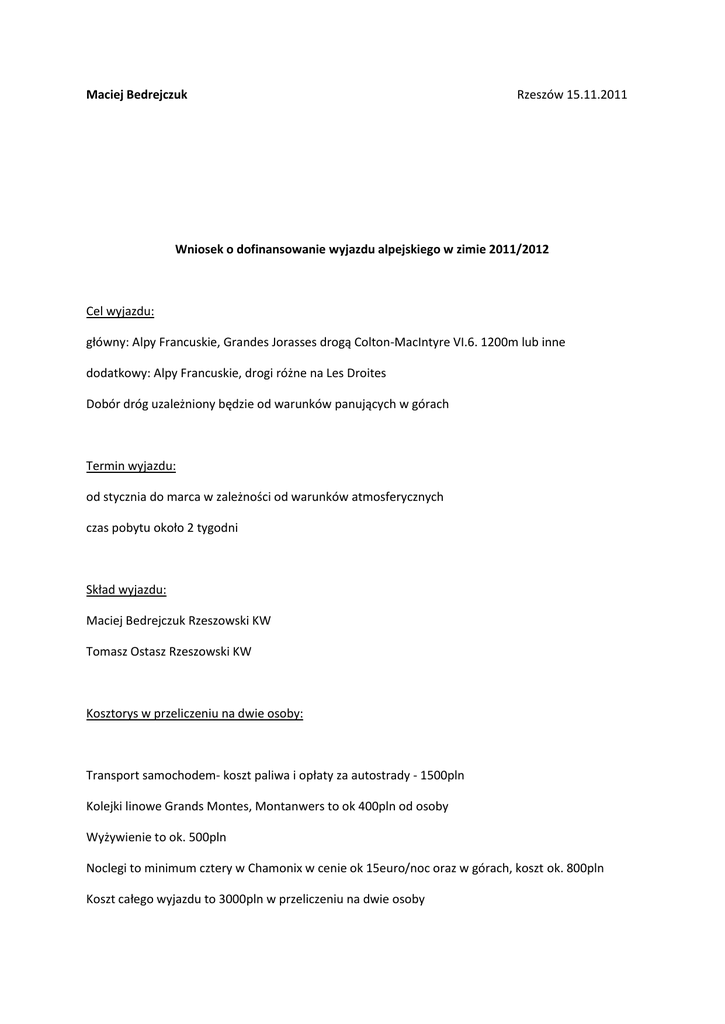 Maciej Bedrejczuk Rzeszów 15.11.2011 Wniosek o dofinansowanie wyjazdu alpejskiego w zimie 2011/2012 Cel wyjazdu: główny: Alpy Francuskie, Grandes Jorasses drogą Colton-MacIntyre VI.6. 1200m lub inne dodatkowy: Alpy Francuskie, drogi różne na Les Droites Dobór dróg uzależniony będzie od warunków panujących w górach Termin wyjazdu: od stycznia do marca w zależności od warunków atmosferycznych czas pobytu około 2 tygodni Skład wyjazdu: Maciej Bedrejczuk Rzeszowski KW Tomasz Ostasz Rzeszowski KW Kosztorys w przeliczeniu na dwie osoby: Transport samochodem- koszt paliwa i opłaty za autostrady - 1500pln Kolejki linowe Grands Montes, Montanwers to ok 400pln od osoby Wyżywienie to ok. 500pln Noclegi to minimum cztery w Chamonix w cenie ok 15euro/noc oraz w górach, koszt ok. 800pln Koszt całego wyjazdu to 3000pln w przeliczeniu na dwie osoby Oczekiwane dofinansowanie Wg uznania komisji wspinaczki wysokogórskiej PZA Poprzednie dofinansowania: Maciej Bedrejczuk: Alpy lato 2011, Kirgistan 2011 Prosimy o pozytywne rozpatrzenie naszego wniosku. Z pozdrowieniami Maciej Bedrejczuk, Tomasz Ostasz