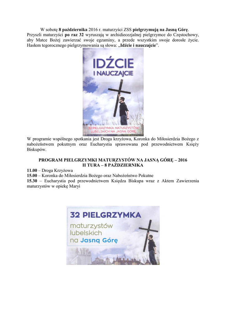 W sobotę 8 października 2016 r. maturzyści ZSS pielgrzymują na Jasną Górę. Przyszli maturzyści po raz 32 wyruszają w archidiecezjalnej pielgrzymce do Częstochowy, aby Matce Bożej zawierzać swoje egzaminy, a przede wszystkim swoje dorosłe życie. Hasłem tegorocznego pielgrzymowania są słowa: „Idźcie i nauczajcie”. W programie wspólnego spotkania jest Droga krzyżowa, Koronka do Miłosierdzia Bożego z nabożeństwem pokutnym oraz Eucharystia sprawowana pod przewodnictwem Księży Biskupów. PROGRAM PIELGRZYMKI MATURZYSTÓW NA JASNĄ GÓRĘ – 2016 II TURA – 8 PAŹDZIERNIKA 11.00 – Droga Krzyżowa 15.00 – Koronka do Miłosierdzia Bożego oraz Nabożeństwo Pokutne 15.30 – Eucharystia pod przewodnictwem Księdza Biskupa wraz z Aktem Zawierzenia maturzystów w opiekę Maryi