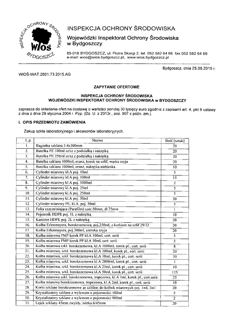 INSPEKCJA OCHRONY SRODOWISKA Wos <S>u C/l Wojewodzki Inspektorat Ochrony 6rodowiska w Bydgoszczy 85-018 BYDGOSZCZ, ul. Piotra Skargi 2, tel. 052 582 64 66 fax 052 582 64 69 e-mail: [email protected], www.wios.bydgoszcz.pl Bydgoszcz, dnia 25.09.2015 r. WIOS-WAT.2601.73.2015.AG ZAPYTANIE OFERTOWE INSPEKCJA OCHRONY SRODOWISKA WOJEW6DZKI INSPEKTORAT OCHRONY SRODOWISKA w BYDGOSZCZY zaprasza do sktadania ofert na dostaw§ o wartosci ponizej 30 tysiecy euro zgodnie z zapisami art. 4, pkt 8 ustawy z dnia z dnia 29 stycznia 2004 r. Pzp. (Dz. U. z2013r, poz. 907zp6zn. zm.). I. OPIS PRZEDMIOTU ZAMOWIENIA Zakup szkla laboratoryjnego i akcesori6w laboratoryjnych. L.p. 1. 2. 3. 4. 5. 6. 7. 8. 9. 10. 11. 12. 13. 14. 15. 16. 17. 18. 19. 20. 21. 22. 23. 24. 25. 26. 27. 28. 29. 30. 31. Nazwa Bagietka szklana 3-4x300mm Butelka PE 1 00ml sz/sz z podzialka i nakretkif Butelka PE 250ml sz/sz z podzialka i nakr?tkg Butelka szklana 1 000ml, oranz, korek na szlif, waska szyja Butelka szklana 1000ml, oranz, nakretka niebieska Cylinder miarowy kl.A poj. 10ml Cylinder miarowy kl.A poj. 100ml Cylinder miarowy kl.A poj. 1000ml Cylinder miarowy kl.A poj. 25ml Cylinder miarowy kl.A poj. 250ml Cylinder miarowy kl.A poj. 50ml Cylinder miarowy PE, kl.A, poj. 50ml Folia uszczelniajaca (Parafilm) szer.50mm, dt.75mm Pojemnik HOPE poj. 1L z nakretka Kanister HOPE poj. 2L z nakretkij Kolba Erlenmayera, borokrzemowa, poj.250ml, z korkicm na szlif 29/32 Kolba Erlenmayera, poj. 300ml, szeroka szyja Kolba miarowa PMP korek PP kl.A 100ml, cert, serii Kolba miarowa PMP korek PP kl.A 50ml, cert, serii Kolba miarowa szkl. borokrzemowa, kl.A 1 000ml, korek pi., cert, serii Kolba miarowa, szkl. borokrzemowa kl.A 1 00ml, korek pi., cert, serii Kolba miarowa, szkl. borokrzemowa kl.A I Oml, korek pi., cert, serii Kolba miarowa, szkl. borokrzemowa kl.A 2000ml, korek pi., cert, serii Kolba miarowa, szkl. borokrzemowa kl.A 25ml, korek pi., cert, serii Kolba miarowa, szkl. borokrzemowa kl.A 50ml, korek pi., cert, serii Kolba miarowa szkl. borokrzemowa, trapezowa, kl.A 1 ml, korek pi., cert.serii Kolba miarowa borokrzemowa, trapezowa, kl.A 2ml, korek pi., cert, serii Korki szklane borokrzemowe ze szlifem do kolbek iniarowych poj. 1ml, 2ml Krystalizatory szklane z wylewem o pojemnoSci 1 00ml Krystalizatory szklane z wylewem o pojemno^ci 900ml Lejek szklany 45mm zwykly, n6zka 6/45mm HoSc [sztuk] 20 20 20 20 10 5 15 2 5 5 20 5 1 10 20 20 20 5 5 8 20 30 1 10 125 25 10 20 5 2 20 32. 33. 34. 35. 36. 37. 38. 39. 40. 41. 42. 43. 44. 45. 46. 47. 48. 49. 50. Lejek szklany 55mm zwykly, n6zka 8/55mm Lyzki porcelanowe o dtugoSci okofo 100mm Lyzko-szpatulki ze stall nierdzewnej, pokryte teflonem o dt. ok 200mm Parownica szklana plaskodenna, o pojemnosci 90ml Parownica szklana ptaskodenna o pojemnosci 60ml Pluczka Dreschlazgrzybkicm poj. 150ml, szlif 29/32 Rozdziclacz gruszkowy poj. 1000ml, kran teflonowy, korek polipropylenowy Rozdzielacz gruszkowy poj. 250ml, kran teflonowy, korck polipropylenowy Statyw plastikowy 3-miejscowy do rozdzielaczy poj. 500 i 1000 ml Szkielka zegarkowe sr.6cm Wiadro PP z wylewem, poj. 15L Zlewka szklana borokrzemowa wysoka 1000ml Zlewka szklana borokrzemowa wysoka 2000ml Zlewka szklana borokrzemowa wysoka 250ml Zlewka szklana borokrzemowa wysoka 4000ml Zlewka szklana borokrzemowa wysoka 50ml Zlewka szklana borokrzemowa niska 1000ml Zlewka szklana borokrzemowa niska 400ml Zlewka szklana borokrzemowa niska 50ml 20 10 5 10 5 20 5 5 2 20 3 10 5 5 2 5 10 10 5 Wymogi zamawiajqcego: Wliczony w cene transport do siedziby WIOS w Bydgoszczy. II. TERMIN WYKONANIA ZAMOWIENIA Dostawa w terminie do dnia 30 pazdziernika 2015 r. III. WARUNKI PtATNO$CI Podstawa zaptaty: faktura. Ptatnosc: w terminie 30 dni od dnia otrzymania faktury. IV. OPIS SPOSOBU PRZYGOTOWANIA OFERTY Oferta powinna: > zawierac adres lub siedzibe Wykonawcy, numer telefonu lub adres mailowy do kontaktu; > okreslac cene za calosc dostawy okreslonej w opisie przedmiotu zambwienia. V. WARUNKI UDZIALU > uprawnienie do wystepowania w obrocie prawnym zgodnie z wymogami ustawowymi; > dysponowanie osobami zdolnymi do wykonania zambwienia; > dysponowanie niezbedn$ wiedz$, doswiadczeniem, potencjatem i technicznym gwarantujqcym nalezyte wykonanie zam6wienia. ekonomicznym VI. OSOBY UPOWAZNIONE DO KONTAKTOW > Pan! Jolanta Jurek-Gajownik lub Dorota Raduhska - tel. 52-5826466 do 68; e-mail: iolanta.iurek-gaiownik(a)wios.bvdgoszcz.pl. [email protected] VII. SKtADANIE OFERT 1. Oferta powinna bye zlozona w terminie do dnia 30 wrzesnia 2015 roku wjednej z form: • pisemnej na adres Wojew6dzki Inspektorat Ochrony 6rodowiska w Bydgoszczy, 85-018 Bydgoszcz, ul. Piotra Skargi 2 (sekretariat - pokoj nr 22); • faxem na nr 52 5826469; • elektronicznie na adres e-mail: [email protected] 2. Oferty ztozone po terminie nie bed$ rozpatrywane. 3. Wykonawca moze przed uplywem terminu sWadania ofert zmienifj lub wycofac swoj^ oferte. 4. W toku badania i oceny ofert Zamawiaja.cy moze zqdai od Wykonawc6w wyjasniert dotyczqcych tresci ziozonych ofert. Wojewodzki Inspektorat Ochrony Srodowiskaw Bydgoszczy ul. Piotra Skargi 2 85-018 Bydgoszcz tel .52 582 64 66 fax.52 582 64 69 e-mail: [email protected] VIII. DODATKOWE INFORMACJE Zamawiajqcy wybierze Wykonawc^, M6ry zaproponuje najkorzystniejszq ofert§ i zawrze z nim umow§. Wzalqczeniu Og6lne warunki umowy. ™ isssr , NACZELNIK \Vydz. Adm. -^chniczncgo »GV Wojewodzki Inspeklorat Ochrony Srodowiska w Bydgoszczy ul. Piotra Skargi 2 85-018 Bydgoszcz i ieg tel.52 582 64 66 fax.52 582 64 69 e-mail: [email protected] WIOS-WAT.2601.73.2015.AG Zalqcznik nr Ogolne warunki umowy §1 Sprzedawca sprzedaje, a Kupujacy nabywa szkto i akcesoria laboratory]ne, ktorych charakterystyke okresla zalacznik do niniejszej umowy. §2 1. Sprzedawca zobowiazuje sie dostarczyc w jednej dostawie przedmiot umowy okreslony w §1 do Laboratorium Kupujacego — Pracownia w Bydgoszczy w terminie do dnia 30 pazdziernika 2015 r. 2. Dostarczenie przedmiotu umowy okreslonego w §1 zostanie potw