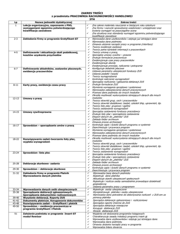 ZAKRES TREŚCI z przedmiotu PRACOWNIA RACHUNKOWOŚCI HANDLOWEJ 3TH Lp 1 Nazwa jednostki dydaktycznej Lekcja organizacyjna, zapoznanie z PSO, wymaganiami egzaminu potwierdzającego kwalifikacje zawodowe Zakres treści 2-3 Zakładanie firmy w programie Gratyfikant GT 4-5 Definiowanie i aktualizacja skali podatkowej, kosztów uzyskania przychodów 6-7 Definiowanie składników, zestawów płacowych, ewidencja pracowników 8-11 Karty pracy, ewidencja czasu pracy 12-13 Umowy o pracę 14-15 Umowy cywilnoprawne 16-17 Sprawdzian – sporządzanie umów o pracę 18-22 Rozwiązywanie zadań-tworzenie listy płac, wypłata wynagrodzeń 23-24 Sprawdzian- lista płac 25-28 Deklaracje skarbowe- zadania 29-30 Sprawdzian – deklaracje skarbowe 31-32 Zakładanie firmy w programie Płatnik Wprowadzanie danych płatnika 33-34 35-38 Wprowadzanie danych osób ubezpieczonych Sporządzanie deklaracji zgłoszeniowych. Sporządzanie dokumentów rozliczeniowych Wysyłanie deklaracji, Raporty ZUS Dokumenty płatnicze. Korygowanie dokumentów Rozwiązywanie zadań – Gratyfikant i płatnik Sprawdzian – ewidencja pracownicza w programie Gratyfikant i Płatnik 39-40 41-42 43-48 49-50 51 Założenie podmiotu w programie Insert GT moduł Rewizor Zna zakres materiału nauczania w bieżącym roku szkolnym Zna formy i warunki sprawdzania wiadomości i umiejętności oraz kryteria wymagań na poszczególne oceny Zna strukturę oraz standardy wymagań egzaminu potwierdzającego kwalifikacje zawodowe Wprowadza dane użytkowników i edytuje już istniejące dane Wprowadza dane podmiotu Omawia ułożenie narzędzi pracy w programie (interface) Tworzy ewidencje osobowe Tworzy pełne kartoteki informacji o pracownikach Tworzy umowę o pracę, Sporządza umowy cywilno – prawne Drukuje formularze pracownicze Ewidencjonuje czas pracy pracowników Ewidencjonuje akordy Ewidencjonuje prowizje, naliczenia i potrącenia Konfiguruje składniki płacowe Ustawia parametry ubezpieczeń funduszy ZUS Ustawia podatki i koszty Tworzy wynagrodzenia Kontroluje naliczenie wynagrodzeń Sporządza rozliczenia i zgłoszenia deklaracji ZUS Drukuje formularze ZUS Wymienia wymagania sprzętowe i systemowe Wprowadza zabezpieczenia danych pracowniczych Przenosi dane podmiotu do innych modułów Określa możliwość wykorzystania istniejących danych dla innych modułów Tworzy słowniki grup, cech i pracowników Tworzy słowniki dodatkowe: badań, szkoleń bhp, uprawnień, itp. Tworzy listy płac: grupowe i ogólne Tworzy zestawienie wynagrodzeń Sporządza zestawienia funduszy pracodawcy Drukuje listy płac i sporządzone zestawienia Eksport danych do „płatnika” ZUS Zakłada folder archiwum Omawia proces archiwizacji Kontroluje zapis i ścieżki danych programu w systemie Dearchiwizuje i przywraca program Wymienia wymagania sprzętowe i systemowe Wprowadza zabezpieczenia danych pracowniczych Przenosi dane podmiotu do innych modułów Określa możliwość wykorzystania istniejących danych dla innych modułów Tworzy słowniki grup, cech i pracowników Tworzy słowniki dodatkowe: badań, szkoleń bhp, uprawnień, itp. Tworzy listy płac: grupowe i ogólne Tworzy zestawienie wynagrodzeń Sporządza zestawienia funduszy pracodawcy Drukuje listy płac i sporządzone zestawienia Eksport danych do „płatnika” ZUS Zakłada folder archiwum Omawia proces archiwizacji Kontroluje zapis i ścieżki danych programu w systemie Dearchiwizuje i przywraca program Wprowadza bazę danych podmiotu Rejestruje dane płatnika Aktualizuje stawki ubezpieczeń społecznych Rejestruje i rozlicza osoby samodzielnie prowadzące działalność gospodarczą Ustawia parametry pracy z programem Rejestruje osoby ubezpieczone Wyrejestrowuje płatnika i osoby ubezpieczone Wprowadza dane potrzebne do dokonywania rozliczeń z ZUS-em za pomocą płatnika Sporządza deklaracje zgłoszeniowe i rozliczeniowe Sporządza raporty imienne do ZUS Sporządza deklaracje miesięczne Koryguje deklaracje ZUS Wysyła deklaracje ZUS Wyjaśnia cel stosowania programów księgowych Charakteryzuje zasady instalacji programu insert gt Wprowadza dane użytkowników i edytuje już istniejące dane Wprowadza dane podmiotu Omawia ułożenie narzędzi pracy w programie Wprowadza bilans otwarcia 52-53 Ewidencja operacji gotówkowych-rozwiązywanie zadań (2) 54-55 56-57 Ewidencja operacji bankowych - rozwiązywanie zadań (2) Ewidencja Innych środków pieniężnych – rozwiązywanie zadań (2) 58 Ewidencja krótkoterminowych papierów wartościowych – rozwiązywanie zadań 59-60 Sprawdzian (2) 61-63 Kartoteka środków trwałych. Amortyzacja środków trwałych. Tabela amortyzacyjna. (3) 64-67 Ewidencja zakupu środków trwałychrozwiązywanie zadań (4) 68-72 Ewidencja zmian w stanie i wartości środków trwałych (5) 73-74 Sprawdzian (2) 75-80 Ewidencja zakupu towarów – rozwiązywanie zadań (6) 81-85 Ewidencja sprzedaży towarów – rozwiązywanie zadań (5) 86-90 Rozliczenie transakcji zakupu i sprzedaży materiałów – operacje bankowe i kasowe (5) 91-92 Ewidencja sprzedaży usług – rozwiązywanie zadań (2) 93-94 Sprawdzian (2) 95-98 Ewidencja różnic inwentaryzacyjnych rozwiązywanie zadań (4) Ewidencja rozliczenia wyników inwentaryzacji – rozwiązywanie zadań (4) Sprawdzian (2) Ewidencja kapitałów własnych - rozwiązywanie zadań (4) Ewidencja rezerw – rozwiązywanie zadań (4) Sprawdzian (2) Ewidencja wyniku finansowego – wariant porównawczy (2) Ewidencja wyniku finansowego – wariant kalkulacyjny (2) Sprawdzian (2) 99-102 103-104 105-108 109-112 113-114 115-116 117-118 119-120 Wprowadza plan kont Tworzy dokumenty kasowe kp, kw, raport kasowy oraz dokumenty operacji bankowych wb Drukuje kartoteki i dokumenty Drukuje zestawienia, analizy i statystyki Tworzy dokumenty kasowe kp, kw, raport kasowy oraz dokumenty operacji bankowych wb Sporządza zestawienie obrotów i sald Ewidencjonuje operacje bankowe Ewidencjonuje operacje kasowe Dekretuje dokumenty księgowe Wymi