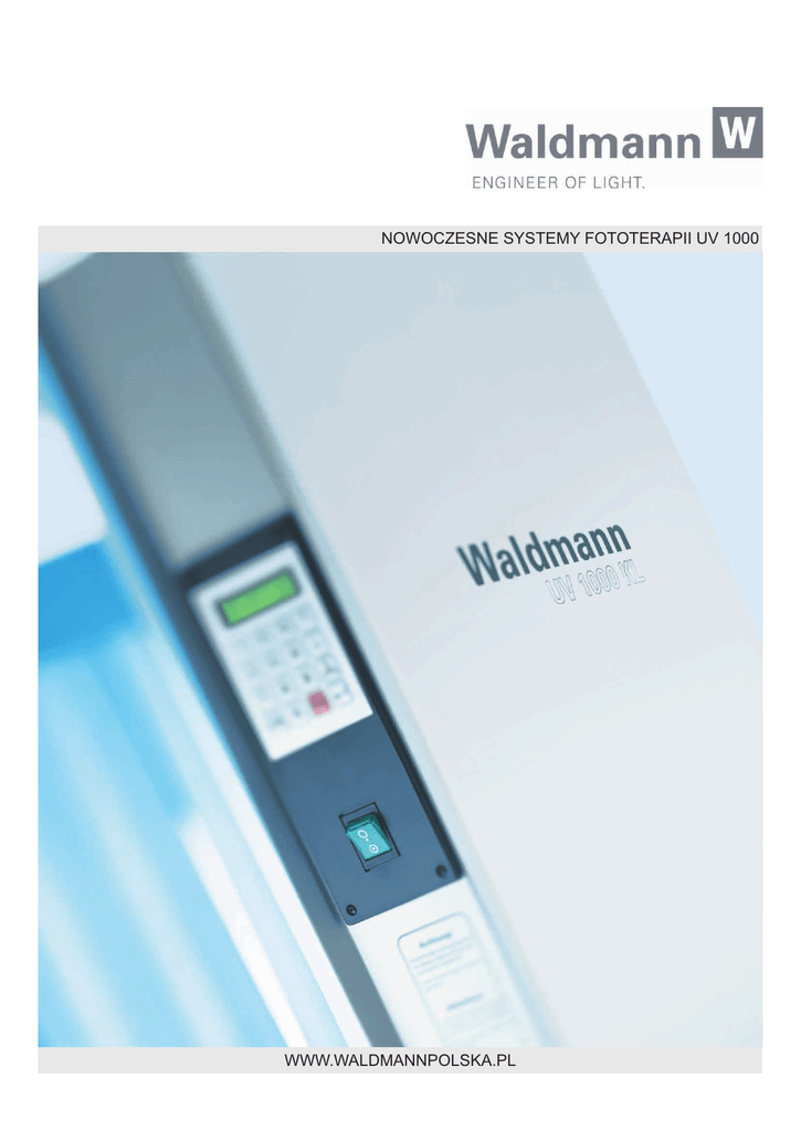 NOWOCZESNE SYSTEMY FOTOTERAPII UV 1000 WWW.WALDMANNPOLSKA.PL NOWOCZESNE SYSTEMY FOTOTERAPII UV 1000 UV 1000 Podstawowa wersja kabiny wyposażona w 26 lamp UV o mocy 100 W. Jest to ekonomiczne rozwiązanie, dedykowane przede wszystkim do prowadzenia monoterapii. System terapii Waldmann UV 1000 umożliwia równomierne i efektywne naświetlanie. Niewielkie rozmiary sprawiają, że urządzenie jest bardzo praktyczne i wygodne w użyciu. Kabina wyposażona jest w tradycyjny timer elektroniczny LCD umożliwiający wprowadzanie dawki naświetlania w dżulach lub jednostce czasu. Panel sterujący LCD: Podświetlany wyświetlacz Menu zapewnia bezpieczną oraz łatwą obsługę Programowalne limity dawek Łatwa do czyszczenia klawiatura Zalety: Urządzenie zajmuje mało miejsca Wydajny, zintegrowany system chłodzenia Specjalna geometria zwierciadeł zapewniająca równomierne naświetlanie Kabina wyłącza się automatycznie po zakończeniu terapii Podświetlany timer LCD do wprowadzania dawek w dżulach lub jednostce czasu PARAMETRY TECHNICZNE Wymiary (wys. x szer. x głęb.): Podstawa: Waga: Pobór mocy: Napięcie zasilania: Klasa ochronności: Wyposażenie: monoterapia: terapia łączona: 1915 x 840 zamknięte, max. 1480 otwarte, (wymagane ok. 1250) x 1014 zamknięte, 900 mm otwarte wyposażona w 8 kółek ok. 155 kg (bez opakowania) ok. 3 kW, cos φ 0.98 230 V / 50 Hz IIa 26 x PUVA 100 W, 26 x UVB 311 nm 100 W 20 x PUVA 100 W / 6 x UV 21 100 W 16 x PUVA 100 W / 10 x UVB 311 nm 100 W Euroscalemed sp. z o. o. jest wyłącznym przedstawicielem firmy Waldmann GmbH na Polskę. Oferuje pełny serwis gwarancyjny, pogwarancyjny, a także dostawę części zamiennych. Biuro handlowe e-mail: [email protected] ul. Szczecińska 61/67 www.euroscalemed.pl 91-222 Łódź tel. +48 42 652 01 28 +48 42 612 20 04 0297 Serwis ul. Flamandzka 19 91-160 Łódź tel. +48 42 612 33 23 e-mail: [email protected]