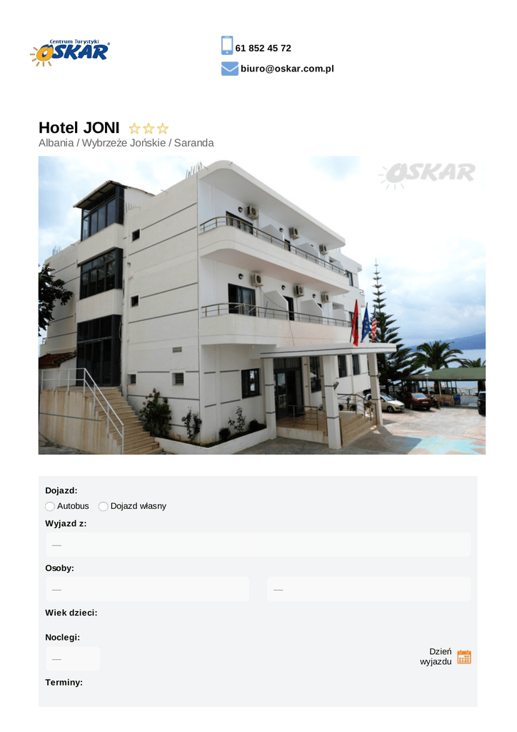 61 852 45 72 [email protected] Hotel JONI Albania / Wybrzeże Jońskie / Saranda Dojazd: Autobus Dojazd własny Wyjazd z: Osoby: Wiek dzieci: Noclegi: Dzień wyjazdu Terminy: Pokój: Wyżywienie: Najtańsza oferta First Minute cena katalogowa do 12 marca 2017: 716,70 zł do 12 marca 2017: 716,70 zł do 25 sierpnia 2017: 1672,30 zł do 25 sierpnia 2017: 1672,30 zł Suma:2389,00 zł Suma: 2389,00 zł Opis oferty Miejscowość Atuty Wycieczki bliskość plaży fakultatywne piękny taras z widokiem na morze i na wyspę Korfu przyjazny rodzinom z dziećmi Opinie Internet Wi-Fi w miejscach ogólnodostępnych bezpłatny bar i restauracja bezpłatna klimatyzacja bezpłatne leżaki Położenie Hotel Joni położony jest na wybrzeżu Morza Jońskiego bezpośrednio przy plaży. Obiekt dysponuje prywatną plażą oraz basenem zewnętrznym i tarasem słonecznym. Dojście do głównej promenady zajmuje 10 minut pieszo, natomiast do centrum Sarandy 15 minut. Zakwaterowanie Zakwaterowanie w pokojach z łazienkami oraz balkonem z bocznym lub centralnym widokiem na morze. Pokoje wyposażone są w klimatyzację, TV, bezpłatny dostęp do Internetu Wi-Fi. Obiekt posiada prywatną plażę oraz taras słoneczny z bezpłatnymi leżakami do dyspozycji gości. Dostępne opcje zakwaterowania pokoje 2-osobowe pokoje 3-osobowe dokwaterowanie lub pokój 1-osobowy * dokwaterowanie: osoby wybierając się pojedynczo, które w momencie rezerwacji nie dokonują dopłaty do pokoju jednoosobowego, mogą zostać zakwaterowanie z jedną lub kilkoma osobami tej samej płci w tzw. opcji dokwaterowania; jednakże w przypadku braku innej rezerwacji w opcji dokwaterowania w terminie do 7 dni przed rozpoczęciem imprezy wymagana jest dopłata do pokoju 1 osobowego Dostępne opcje wyżywienia śniadania - bufet (w cenie) obiadokolacje - serwowane (dopłata opcjonalna) Pakiet KOMFORT gwarancja wyboru miejsca w autokarze napoje w autokarze w cenie (6 x do wyboru: kawa, herbata, zimny napój 0,2l) cena: 50 zł/os Pakiet PRESTIGE gwarancja wyboru miejsca w autokarze napoje w autokarze w cenie (6 x do wyboru: kawa, herbata, zimny napój 0,2l) pierwszeństwo wejścia na pokład autokaru nadbagaż 5 kg w cenie suchy prowiant na drogę powrotną cena: 100 zł/os Karta Dużej Rodziny www.oskar.com.pl/zalaczniki/karta_duzej_rodziny Warunki promocji FIRST MINUTE www.oskar.com.pl/zalaczniki/warunki_promocji Ubezpieczenie Warunki ubezpieczenia Bezpieczne Podróże Signal Iduna dokument do pobrania www.oskar.com.pl/zalaczniki/owu Warunki ubezpieczenia Kosztów Imprezy Turystycznej Signal Iduna dokument do pobrania www.oskar.com.pl/zalaczniki/owurg Turystyczny Fundusz Gwarancyjny W związku z powołaniem do życia w dniu 26.11.2016 Turystycznego Funduszu Gwarancyjnego każdy klient Biura Podróży Oskar zobowiązany jest do zapłaty kwoty w wysokości 10zł/os. przy każdorazowej rezerwacji imprezy turystycznej (obowiązuje od dnia 26.11.2016). Kwota przeznaczona na Turystyczny Fundusz Gwarancyjny zostanie automatycznie doliczona do wartości rezerwacji (w momencie jej dokonania). Wyjątkiem są imprezy turystyczne odbywające się w krajach posiadających granicę z Rzeczpospolitą Polską. Składka nie jest przychodem biura. Udogodnienia Widok na morze Klimatyzacja Regulowane fotele Tacki Nowoczesna flota Zawodowy kierowca Pasy bezpieczeństwa Toaleta w autokarze Podnóżki Dla rodzin z dziećmi Wi-Fi Lodówka Blisko centrum Bez paszportu Blisko plaży Restauracja hotelowa Region nadmorski Program ramowy Dzień 1 - 2 Wyjazd z Polski zgodnie z rozkładem jazdy autokarów. Przejazd przez Czechy, Słowację, Węgry, Serbię, Macedonię, Grecję. Dzień 3 Przyjazd do Sarandy w godzinach popołudniowych. Zakwaterowanie. Spotkanie informacyjne z rezydentem. Dzień 4 - 12 Pobyt na miejscu, możliwość korzystania z dodatkowych wycieczek fakultatywnych - Korfu, Butrint, wieczór albański, Ksamil i inne. Dzień 12 Wykwaterowanie do godz. 09.00. Czas wolny. Wyjazd do Polski w godzinach popołudniowych. Dzień 13 - 14 Przejazd przez Grecję, Macedonię, Serbię, Węgry, Słowację, Czechy. Przyjazd do Polski. Orientacyjne godziny powrotu do poszczególnych miast zgodnie z rozkładem jazdy autokarów. Cena obejmuje przejazd autokarem klasy LUX (klimatyzacja, cafe - bar, DVD, WC) zakwaterowanie: 9 noclegów w Hotelu JONI opiekę pilota w czasie podróży opieka rezydenta na miejscu wyżywienie wg wybranej opcji ubezpieczenie KL 10000 euro, NNW 10000 zł, bagaż (utrata 500 zł) Cena nie obejmuje Dopłaty wymagane na miejscu opłata klimatyczna 10 euro/os; dzieci do 12 lat płacą 50% - płatne u pilota w autokarze Dopłaty opcjonalne ubezpieczenie od chorób przewlekłych i nowotworowych KL 20000 euro, NNW 10000 zł, bagaż (utrata 500 zł): 160 zł/os ubezpieczenie od kosztów rezygnacji: 3,5% wartości rezerwacji Informacje dodatkowe dokumenty: paszport lub dowód osobisty (zgodnie z obowiązującymi przepisami) zaleca się wyrobienie karty EKUZ brak aneksów kuchennych chyba, że oferta stanowi inaczej Chcesz wiedzieć szybciej? Polub nas na facebooku Wycieczki fakultatywne 45 € /os. Riwiera Albanska 28 € /os. Wieczor albanski 35 € /os. 25 € /os. Girjokastra i Blekitne Butrint - Albanskie Oko Pompeje 45 € /os. Przelecz Llogara i Zamek Lekursi OSKAR Sp. z o.o. pl.Wolności 2/4c, 61-738 Poznań Potrzebujesz pomocy? Zadzwoń lub napisz: 61 852 45 72 [email protected] Zadzwoń Projekt i wdrożenie: Simply User