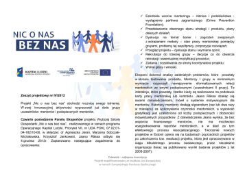 Estońskie wzorce mentoringu – różnice i podobieństwa wystąpienie partnera zagranicznego (Crime Prevention Foundation); Przedstawienie obecnego stanu strategii i produktu, plany dalszych działań; Dyskusja na temat barier i zagrożeń związanych z wdrażaniem metody – stan pracy mentorskiej pomiędzy grupami, problemy tej współpracy, propozycje rozwiązań; Przegląd projektu – dyskusja stanu i wymiana opinii; Rekrutacja do trzeciej grupy – decyzje co do otwarcia rekrutacji i ewentualnej modyfikacji procedur; Zadania i oczekiwania ze strony koordynatora projektu; Wolne głosy i wnioski. Zeszyt projektowy nr IV/2012 Projekt „Nic o nas bez nas” obchodzi rocznicę swego istnienia. W swej innowacyjnej aktywności wypracował już dwie grupy uczestników: mentorów i podopiecznych mentorów. Czwarte posiedzenie Panelu Ekspertów projektu Wyższej Szkoły Gospodarki „Nic o nas bez nas”, realizowanego w ramach programu Operacyjnego Kapitał Ludzki, Priorytet VII, nr UDA POKL 07.02.0104-182/10-00, w składzie: dr Agnieszka Jeran, Marzena SobczakMichałowska, Krzysztof Jankowski, Jaano Rässa odbyło się 4 grudnia 2012r. Zaplanowano następujące zagadnienia do opracowania: Eksperci dokonali analizy zaistniałych problemów, które powstały w okresie testowania produktu. Mentorzy I grupy w minimalnym wymiarze rozpoczęli nawiązywanie sformalizowanych relacji mentorskich ze swymi podopiecznymi (uczestnikami II grupy). Te interakcje, które powstały, rzadko kiedy są realizowane na podstawie karty pracy mentorskiej lub kontraktu. Jaano Rässa dzieląc się swoimi doświadczeniami, mówił o systemie motywacyjnym dla mentorów. Estońscy mentorzy dostają stypendium (raz lub dwa razy w miesiącu) za wykonywanie czynności mentorskich, a wysokość gratyfikacji jest uzależniona od liczby podopiecznych i złożoności indywidualnych przypadków. Z doświadczenia Jaano wynika, że bez wsparcia finansowego mentorów, nie ma możliwości wyegzekwowania raportów mentorskich, a w ślad za tym efektywnego procesu resocjalizacyjnego. Tworzenie nowych projektów w Estonii opiera się na badaniach poprzednich projektów po zakończeniu tzw. ewaluacji projektu, która jest opracowywana w ciągu kilkuletniego procesu badawczego, przez niezależne organizacje (teraz są publikowane wyniki badania projektów z lat 2005-2007). Człowiek – najlepsza inwestycja Projekt współfinansowany ze środków Unii Europejskiej w ramach Europejskiego Funduszu Społecznego Decyzje ekspertów dotyczyły następujących kwestii: zostaną także Rejonowe Ośrodki Pomocy Społecznej, NGO, PCPR oraz inne instytucje z którymi współpracujemy przy realizacji projektu. prowadzący zajęcia powinni być współodpowiedzialni za cele produktu; przy III rekrutacji należy użyć precyzyjnego narzędzia rekrutacji; kolejnego, bardziej wyjazdy traktować należy jako nagrody za wykonanie pracy mentorskiej; „niesparowane” osoby traktować jako grupę, w którą należy dalej inwestować, bo jednak zajęcia powodują istotny wzrost kompetencji społecznych; dokonać realnej inwentaryzacji relacji mentorskich – ustalenie stanu faktycznego; propozycja związków mentorskich z młodzieżą zagrożoną zjawiskiem wykluczenia społecznego spoza projektu, zamiana mentoringu spontanicznego na mentoring w instytucjach (pod nadzorem); propozycja nagrody dla najlepszego mentora – ustalenie Nasi eksperci Z wykształcenia rolnik zootechnik, z wyboru policjant, przez 20 lat w różnych służbach (patrolówka, dzielnicowy, kryminalna, dochodzeniówka, długie lata pracował jako specjalista ds. nieletnich, patologii społecznych i prewencji kryminalnej). O kim mowa? To sylwetka jednego z naszych ekspertów, Roberta Lubranta. Współzałożyciel 2 stowarzyszeń związanych z pomaganiem ludziom w sytuacjach kryzysowych, realizator wielu programów dotyczących zapobiegania patologiom społecznym. Sam o sobie mówi: „jestem praktykiem, a nie teoretykiem”. Zdecydowany i konkretny w działaniach, lubi ludzi i lubi im pomagać, szczególnie dzieciom. Ceni szczerość oraz otwartość, nie lubi obłudy i niesprawiedliwości. Zawsze dąży do dobrej współpracy międzyinstytucjonalnej w celu lepszego pomagania ludziom potrzebującym pomocy. Niektórzy mówią o nim „kontrowersyjny pozytywnie”. Prywatnie lubi majsterkować, pracować na działce przy pielęgnacji kwiatów i roślin. Zafascynowany karaoke, odkrywa w sobie ciągle nowe talenty, np. wystawiając sztukę dla młodzieży o tematyce uzależnienia i przemocy. kryteriów jej przyznawania; Opracowała N.Lejbman brak monitorowania w projekcie. poziomu motywacji uczestnictwa Od 15 grudnia 2012 rusza nabór do III grupy uczestników. Za rekrutację odpowiadają m.in. uczestnicy 2. grupy, prowadzona będzie także kampania promująca projekt i zachęcająca do udziału odpowiedzialne i zmotywowane osoby. O rekrutacji powiadomione Człowiek – najlepsza inwestycja Projekt współfinansowany ze środków Unii Europejskiej w ramach Europejskiego Funduszu Społecznego Publikacja bezpłatna