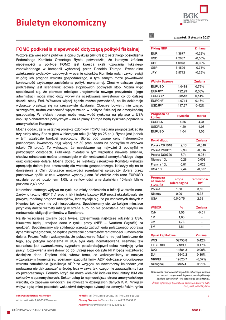 Biuletyn ekonomiczny czwartek, 5 stycznia 2017 FOMC podkreśla niepewność dotyczącą polityki fiskalnej Wczorajsza wieczorna publikacja opisu dyskusji (minutes) z ostatniego posiedzenia Federalnego Komitetu Otwartego Rynku potwierdziła, że istotnym źródłem niepewności w polityce FOMC jest kwestia skali luzowania fiskalnego zapowiadanego w kampanii wyborczej przez Donalda Trumpa. Ewentualne zwiększenie wydatków rządowych w ocenie członków Komitetu rodzi ryzyko rewizji w górę ich prognoz wzrostu gospodarczego, a tym samym może powodować konieczność szybszego zacieśniania polityki monetarnej. Choć w dalszym ciągu podkreślany jest scenariusz jedynie stopniowych podwyżek stóp. Można więc spodziewać się, że pierwsze miesiące urzędowania nowego prezydenta i jego administracji mogą mieć duży wpływ na oczekiwania inwestorów co do dalszej ścieżki stopy Fed. Wówczas więcej będzie można powiedzieć, na ile deklaracje wyborcze przełożą się na rzeczywiste działania. Obecnie bowiem, nie znając szczegółów, trudno oszacować wpływ zmian w polityce fiskalnej na amerykańską gospodarkę. W efekcie rosnąć może wrażliwość rynkowa na płynące z USA impulsy o charakterze politycznym – na ile plany Trumpa będą zyskiwać poparcie w amerykańskim Kongresie. Można dodać, że w ostatniej projekcji członków FOMC mediana prognoz zakładała trzy ruchy stopy Fed w górę w bieżącym roku (każdy po 25 pb.). Rynek jest jednak w tym względzie bardziej sceptyczny. Biorąc pod uwagę ceny instrumentów pochodnych, inwestorzy dają więcej niż 50 proc. szans na podwyżkę w czerwcu (około 70 proc.). To wskazuje, że oczekiwane są najwyżej 2 podwyżki w półrocznych odstępach. Publikacja minutes w tym względzie niewiele zmieniła, chociaż odnotować można przesunięcie w dół rentowności amerykańskiego długu oraz osłabienie dolara. Można dodać, że niektórzy członkowie Komitetu wskazali aprecjację dolara jako przeszkodę dla wzrostu gospodarczego. Nałożyły się na to doniesienia z Chin dotyczące możliwości ewentualnej sprzedaży dolara przez państwowe spółki w celu wsparcia wyceny juana. W efekcie dziś rano EURUSD oscyluje ponad poziomem 1,05, a rentowności amerykańskich 10-latek blisko poziomu 2,43 proc. Natomiast istotnego wpływu na rynki nie miały doniesienia o inflacji w strefie euro. Zarówno łączny HICP (1,1 proc.), jak i indeks bazowy (0,9 proc.) ukształtowały się powyżej mediany prognoz analityków, lecz wydaje się, że po wtorkowych danych z Niemiec taki wynik nie był niespodzianką. Spodziewamy się, że kolejne miesiące przyniosą dalsze wzrosty inflacji w strefie euro, co nie pozostanie bez wpływu na rentowności obligacji emitentów z Eurolandu. Na ile wczorajsze zmiany będą trwałe, zdeterminują najbliższe odczyty z USA. Kluczowe będą jutrzejsze dane z rynku pracy (NFP – Nonfarm Payrolls) za grudzień. Spodziewamy się solidnego wzrostu zatrudnienia połączonego poprawą dynamiki wynagrodzeń, co będzie prowadzić do wzrostów rentowności i umocnienia dolara. Prezes Yellen wskazywała, że poluzowanie fiskalne nie jest konieczne do tego, aby polityka monetarna w USA była dalej normalizowana. Niemniej taki scenariusz jest uwarunkowany sygnałami potwierdzającymi dobra kondycję rynku pracy. Oczekiwania inwestorów co do jutrzejszego odczytu NFP będą kształtować dzisiejsze dane. Dopiero dziś, wbrew temu, co wskazywaliśmy w naszym wczorajszym komentarzu, poznamy szacunki firmy ADP dotyczące grudniowego wzrostu zatrudnienia (publikacja ADP ze względu na noworoczny kalendarz jest podawana nie „jak zawsze” w środę, lecz w czwartek, czego nie zauważyliśmy i za co przepraszamy). Ponadto liczyć się może wielkość indeksu koniunktury ISM dla sektorów nieprzemysłowych. Sektor usług to najmocniejsza strona amerykańskiego wzrostu, co zapewne uwidoczni się również w dzisiejszych danych ISM. Mniejszy wpływ będą mieć pozostałe wskazówki dotyczące sytuacji na amerykańskim rynku Bank Gospodarstwa Krajowego Kontakt: tel. (+48 22) 52-29-211, tel. (+48 22) 52-29-211 Al. Jerozolimskie 7, 00-955 Warszawa Główny Ekonomista Tomasz Kaczor +48 22 596 59 13 Analityk Piotr Dmitrowski +48 22 522 92 17 Fixing NBP Zmiana EUR 4,3877 -0,28% USD 4,2037 -0,55% CHF 4,0978 -0,39% GBP 5,1596 -0,73% JPY 3,5712 -0,25% Waluty Bazowe Zmiana EURUSD 1,0488 0,79% EURJPY 122,99 0,38% EURGBP 0,8513 0,14% EURCHF 1,0714 0,18% USDJPY 117,27 -0,42% Prognoza na koniec EURPLN stycznia marca 4,36 4,34 USDPLN 4,20 4,08 EURUSD 1,04 1,06 Rynki długu Zmiana Polska OK1018 2,13 -0,010 Polska PS0421 2,93 -0,016 Polska DS0726 3,71 -0,051 Niemcy 10L 0,28 0,008 Francja 10L 0,81 0,023 USA 10L 2,44 -0,007 Prognoza na koniec stycznia Polska stopa referencyjna rentowność 10Y 1,50 3,59 0,00 0,38 0,5-0,75 2,58 Niemcy USA WIBOR % Zmiana O/N 1,55 -0,01 1M 1,66 - 3M 1,73 - 6M 1,81 - Rynki kapitałowe Zmiana WIG 52753,8 0,42% FTSE 100 7189,7 0,17% DAX 11584,3 0,00% DJI 19942,2 0,30% NIKKEI 19520,7 -0,37% Szanghaj 3165,4 0,21% Notowania z końca ostatniego dnia roboczego, zmiana w stosunku do poprzedniego notowania (dla stóp banków centralnych - od ostatniego posiedzenia). Źródła informacji: Bloomberg, Thomson Reuters, PAP, GUS, NBP, NYMEX, GPW 1 Biuletyn ekonomiczny czwartek, 5 stycznia 2017 dostrzegamy powodów do zmian ratingu. Decyzje o ich utrzymaniu byłby korzystne dla wyceny złotego. pracy, a więc cotygodniowe dane o nowych bezrobotnych i raport Challengera. Na krajowym rynku długu w środę niewiele się działo. Dziś rano położenie krzywej rentowności polskich obligacji jest bardzo bliskie temu z wczorajszego otwarcia. Wciąż płynność pozostaje poniżej zazwyczaj notowanych poziomów. W dalszej części dnia skala wahań może być większa, nie tylko ze względu na obfity kalendarz danych makro zagranicą, lecz również z uwagi na pierwszy w nowym roku przetarg obligacji. Zgodnie z nowymi zas
