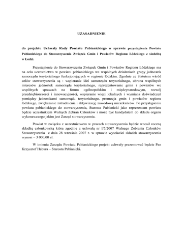 UZASADNIENIE do projektu Uchwały Rady Powiatu Pabianickiego w sprawie przystąpienia Powiatu Pabianickiego do Stowarzyszenia Związek Gmin i Powiatów Regionu Łódzkiego z siedzibą w Łodzi. Przystąpienie do Stowarzyszenia Związek Gmin i Powiatów Regionu Łódzkiego ma na celu uczestnictwo w powiatu pabianickiego we wspólnych działaniach grupy jednostek samorządu terytorialnego funkcjonujących w regionie łódzkim. Zgodnie ze Statutem wśród celów stowarzyszenia są : wspieranie idei samorządu terytorialnego, obrona wspólnych interesów jednostek samorządu terytorialnego, reprezentowanie gmin i powiatów we wspólnych sprawach na forum ogólnopolskim i międzynarodowym, rozwój przedsiębiorczości i innowacyjności, wspieranie więzi lokalnych i wymiana doświadczeń pomiędzy jednostkami samorządu terytorialnego, promocja gmin i powiatów regionu łódzkiego, zwiększanie zatrudnienia i aktywizację zawodową mieszkańców. Po przystąpieniu powiatu pabianickiego do stowarzyszenia, Starosta Pabianicki jako reprezentant powiatu będzie uczestnikiem Walnych Zebrań Członków i może być kandydatem do składu organu wykonawczego jakim jest Zarząd stowarzyszenia. Powiat w związku z uczestnictwem w pracach stowarzyszenia będzie wnosił roczną składkę członkowską która zgodnie z uchwałą nr I/5/2007 Walnego Zebrania Członków Stowarzyszenia z dnia 28 września 2007 r. w sprawie wysokości składek stowarzyszenia wynosi – 3 000,00 zł. W imieniu Zarządu Powiatu Pabianickiego projekt uchwały prezentować będzie Pan Krzysztof Habura – Starosta Pabianicki.
