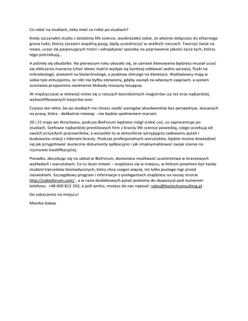 Co robić na studiach, żeby mieć co robić po studiach? Kiedy zaczynałeś studia z dziedziny life science, wyobrażałeś sobie, że właśnie dołączasz do elitarnego grona ludzi, którzy zarażeni wspólną pasją, będą uczestniczyć w wielkich rzeczach. Tworzyć świat na nowo, uczyć się pasjonujących treści i odnajdywać sposoby na poprawienie jakości życia tych, którzy tego potrzebują… A później się obudziłeś. Na pierwszym roku okazało się, że zamiast klonowania będziesz musiał uczyć się obliczania macierzy (choć słowo matrix wydaje się bardziej oddawać sedno sprawy), fizyki na mikrobiologii, anatomii na biotechnologii, a podstaw chirurgii na dietetyce. Wykładowcy mają w sobie tyle entuzjazmu, że nikt nie byłby zdziwiony, gdyby zasnęli na własnych zajęciach, a system oceniania przypomina zwolnienie blokady maszyny losującej. W międzyczasie w telewizji mówi się o rzeszach bezrobotnych magistrów czy też erze najbardziej wykwalifikowanych kasjerów ever. Czytasz ten tekst, bo po studiach nie chcesz zasilić szeregów absolwentów bez perspektyw, skazanych na pracę, która - delikatnie mówiąc - nie będzie spełnieniem marzeń. 20 i 21 maja we Wrocławiu, podczas BioForum będziesz mógł zrobić coś, co zaprocentuje po studiach. Szefowie najbardziej prestiżowych firm z branży life science powiedzą, czego oczekują od swoich przyszłych pracowników, a wszystko to w atmosferze sprzyjającej zadawaniu pytań i budowaniu relacji z liderami branży. Podczas profesjonalnych warsztatów, będzie można dowiedzieć się jak przygotować skuteczne dokumenty aplikacyjne i jak zmaksymalizować swoje szanse na rozmowie kwalifikacyjnej. Ponadto, decydując się na udział w BioForum, dostaniesz możliwość uczestnictwa w branżowych wykładach i warsztatach. Co tu dużo mówić – znajdziesz się w miejscu, w którym powinien być każdy student kierunków biomedycznych, który chce czegoś więcej, niż tylko pustego mgr przed nazwiskiem. Szczegółowy program i informacje o prelegentach znajdziesz na naszej stronie http://cebioforum.com/ , a w razie dodatkowych pytań jesteśmy do dyspozycji pod numerem telefonu: +48 600 812 332, a jeśli wolisz, możesz do nas napisać: [email protected] . Do zobaczenia na miejscu! Monika Gabas
