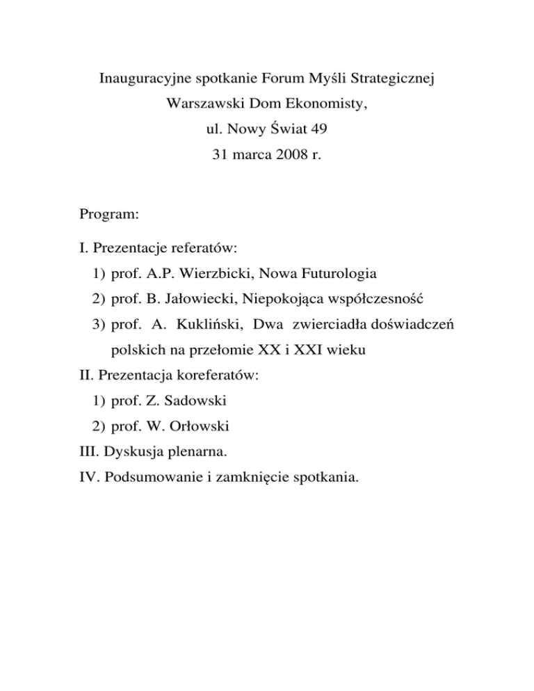 Inauguracyjne spotkanie Forum Myśli Strategicznej Warszawski Dom Ekonomisty, ul. Nowy Świat 49 31 marca 2008 r. Program: I. Prezentacje referatów: 1) prof. A.P. Wierzbicki, Nowa Futurologia 2) prof. B. Jałowiecki, Niepokojąca współczesność 3) prof. A. Kukliński, Dwa zwierciadła doświadczeń polskich na przełomie XX i XXI wieku II. Prezentacja koreferatów: 1) prof. Z. Sadowski 2) prof. W. Orłowski III. Dyskusja plenarna. IV. Podsumowanie i zamknięcie spotkania.