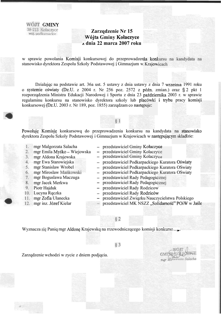 WOJT GMINY Zarzqdzenie Nr 15 W6jta Gminy Kolaczyce L dnia 22 marca 2007 roku w sprawie powolania Komisji konkursowej do przeprowadzen'~ i akonl - stanowisko dyrektora Zespolu Szkoly Podstawowej i Gimnazjum w. Kraj o\;c Dzialajqc na podstawie art. 36a ust. 5 ustawy z dnia ustawy z dnia 7 wrzesn~a1991 roku o systemie oSwiaty (Dz.U. z 2004 r. Nr 256 poz. 2572 z p6in. zmian.) oraz § 2 pkt 1 rozporzqdzenia Ministra Edukacji Narodowej i Sportu z dnia 23 paidziernika 2003 r. w sprawie regulaminu konkursu na stanowisko dyrektora szkoly lub placdwki i trybu pracy komisji konkursowej (Dz.U. 2003 r. Nr 189, poz. 1855) zarzqdzam co nastqpuje: Powolujq Komisjq konkursowq do przeprowadzenia konkursu na kandydata na sta.nowisko dyrektora Zespolu Szkoly Podstawowej i Gimnazjum w Krajowicach w nastqpujqcjrm skladIzie: rngr Malgorzata Salacha rngr Emila MySko - Wiejowska rngr Aldona Krajewska rngr Ewa Starowiejska rngr Stanislaw Wrobel rngr Miroslaw M a I i k ~ \ ; y ~ ~ ~ rngr Boguslawa Maczuga rngr Jacek Merkwa Piotr Hajduk Lucyna Rqczka rngr Zofia Ulanecka rngr inz. J6zef Kielar - przedstawiciel Gminy Kolaczyn- przedstawiciel Gminy Kolaczy - przedstawiciel Gminy Kolaczy _ _ - przedstawiciel Podkarpackiego Kuratora OSwiaty - przedstawiciel Podkarpackiego Kuratora OSwiaty - przedstawiciel Podkarpackiego Kuratora OSwiaty - przedstawiciel Rady Pedagogic - przedstawiciel Rady Pedagogic - przedstawiciel Rady Rodzicow - przedstawiciel Rady Rodzic6w - przedstawiciel Zwiqzku Nauczycielstwa Polskiego przedstawiciel MK NSZZ ,,SolidarnoSC" POiW w JaSlc Wyznacza sic Paniq rngr Aldone Krajewskq na rrzewodniczqcego komisji ko~wursc., . . Zarzqdzenie wchodzi w zycie z dniem podjqcia.
