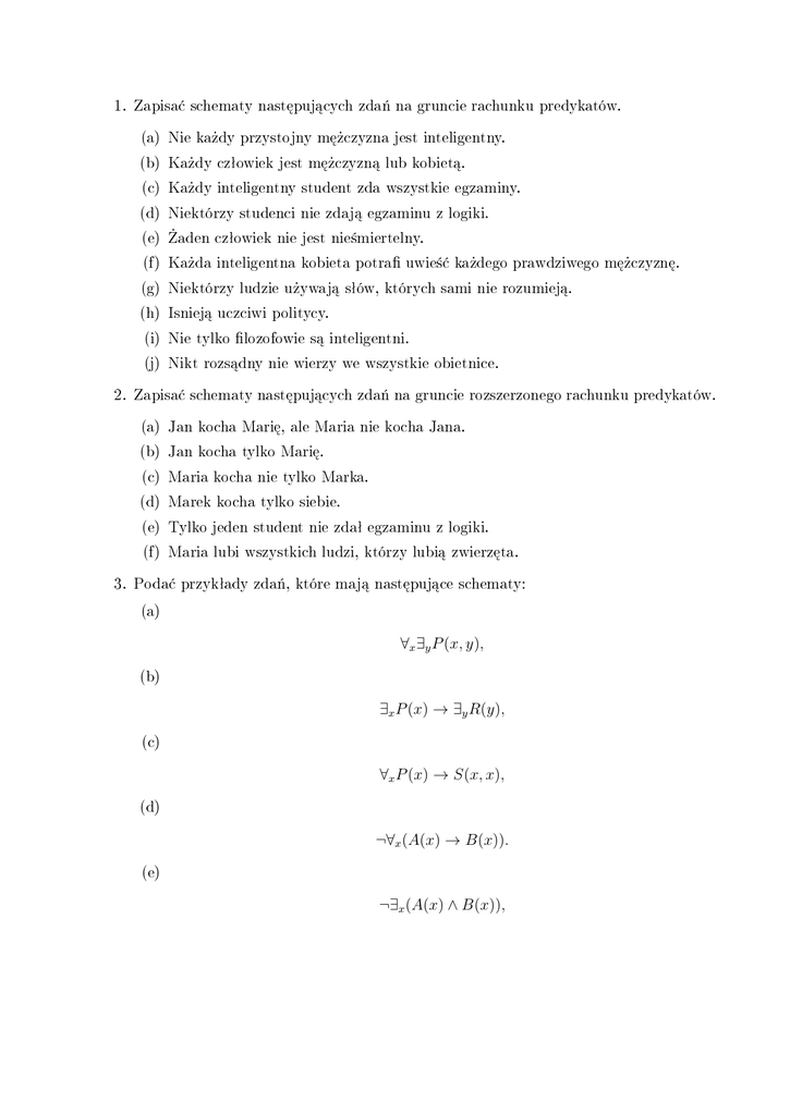 1. Zapisa¢ schematy nast¦puj¡cych zda« na gruncie rachunku predykatów. (a) (b) (c) (d) (e) (f) (g) (h) (i) (j) Nie ka»dy przystojny m¦»czyzna jest inteligentny. Ka»dy czªowiek jest m¦»czyzn¡ lub kobiet¡. Ka»dy inteligentny student zda wszystkie egzaminy. Niektórzy studenci nie zdaj¡ egzaminu z logiki. aden czªowiek nie jest nie±miertelny. Ka»da inteligentna kobieta potra uwie±¢ ka»dego prawdziwego m¦»czyzn¦. Niektórzy ludzie u»ywaj¡ sªów, których sami nie rozumiej¡. Isniej¡ uczciwi politycy. Nie tylko lozofowie s¡ inteligentni. Nikt rozs¡dny nie wierzy we wszystkie obietnice. 2. Zapisa¢ schematy nast¦puj¡cych zda« na gruncie rozszerzonego rachunku predykatów. (a) (b) (c) (d) (e) (f) Jan kocha Mari¦, ale Maria nie kocha Jana. Jan kocha tylko Mari¦. Maria kocha nie tylko Marka. Marek kocha tylko siebie. Tylko jeden student nie zdaª egzaminu z logiki. Maria lubi wszystkich ludzi, którzy lubi¡ zwierz¦ta. 3. Poda¢ przykªady zda«, które maj¡ nast¦puj¡ce schematy: (a) ∀x ∃y P (x, y), (b) ∃x P (x) → ∃y R(y), (c) ∀x P (x) → S(x, x), (d) ¬∀x (A(x) → B(x)). (e) ¬∃x (A(x) ∧ B(x)), (f) ∀x ((A(x) ∧ B(x)) → C(x)). 4. Uzasadni¢, »e poni»sze formuªy nie s¡ tautologiami ani kontrtautologiami: (a) ∃x (P (x) ∨ R(x)), (b) ∀x ∃y A(x, y), (c) ∀x ∃y A(x, y) → ∃x A(x, x), (d) ∀x ∃y A(x, y) → ∃x ∀y A(x, y).