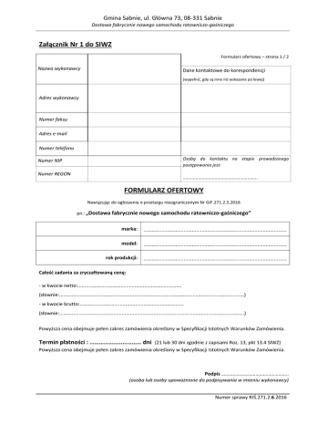 Gmina Sabnie, ul. Główna 73, 08-331 Sabnie Dostawa fabrycznie nowego samochodu ratowniczo-gaśniczego Załącznik Nr 1 do SIWZ Formularz ofertowy – strona 1 / 2 Nazwa wykonawcy Dane kontaktowe do korespondencji (wypełnić, gdy są inne niż wskazane po lewej) Adres wykonawcy Numer faksu Adres e-mail Numer telefonu Osobą do kontaktu na etapie prowadzonego postępowania jest: Numer NIP Numer REGON ………………………………………………….. FORMULARZ OFERTOWY Nawiązując do ogłoszenia o przetargu nieograniczonym Nr GIF.271.2.5.2016 pn.: „Dostawa fabrycznie nowego samochodu ratowniczo-gaśniczego” marka: ....................................................................................................... model: ................ ....................................................................................................... rok produkcji: .................... ....................................................................................................... Całość zadania za zryczałtowaną cenę: .................... - w kwocie netto:........................................................................... (słownie:.....................................................................................................................................) - w kwocie brutto:........................................................................... (słownie:.....................................................................................................................................) Powyższa cena obejmuje pełen zakres zamówienia określony w Specyfikacji Istotnych Warunków Zamówienia. Termin płatności : …………………………… dni (21 lub 30 dni zgodnie z zapisami Roz. 13, pkt 13.4 SIWZ) Powyższa cena obejmuje pełen zakres zamówienia określony w Specyfikacji Istotnych Warunków Zamówienia. Podpis …………………………………………….. (osoba lub osoby upoważnione do podpisywania w imieniu wykonawcy) Numer sprawy RIŚ.271.2.6.2016 Gmina Sabnie, ul. Główna 73, 08-331 Sabnie Dostawa fabrycznie nowego samochodu ratowniczo-gaśniczego Jednocześnie oświadczam(y), iż spełniamy warunki o których mowa w art. 22 ust 1 ustawy Prawo zamówień publicznych: a) Posiadamy uprawnienia do wykonania określonej działalności i czynności będących przedmiotem zamówienia, b) posiadamy wiedzę i doświadczenie, c) dysponujemy odpowiednim potencjałem technicznym oraz osobami zdolnymi do wykonania zamówienia, d) znajdujemy się w sytuacji ekonomicznej i finansowej zapewniającej wykonanie zamówienia. Ponadto: e) zapoznaliśmy się ze specyfikacją istotnych warunków zamówienia na dostawę fabrycznie nowego samochodu ratowniczo-gaśniczego i nie wnosimy do niej zastrzeżeń oraz przyjmujemy warunki w niej zawarte, f) uważamy się za związanych niniejszą ofertą na czas wskazany w SIWZ, g) pozyskaliśmy wszystkie informacje pozwalające na sporządzenie oferty oraz wykonanie w/w zamówienia, h) zawarte postanowienia we wzorze umowy zostały przez nas zaakceptowane i zobowiązujemy się w przypadku przyznania nam zamówienia do zawarcia umowy w miejscu i terminie wyznaczonym przez Zamawiającego. Podpis …………………………………………….. (osoba lub osoby upoważnione do podpisywania w imieniu wykonawcy) Oświadczamy, że 1) Zamierzamy powierzyć podwykonawcom wykonanie następującej części zamówienia (wpisać jeśli dotyczy): a)…………………………………………………………………………………….. b)…………………………………………………………………………………….. c)…………………………………………………………………………………….. Niniejsza oferta przetargowa obejmuje następujące załączniki: 1) ………………………………………………………………………………………….. 2) ………………………………………………………………………………………….. 3) ………………………………………………………………………………………….. 4) ………………………………………………………………………………………….. 5) …………………………………………………………………………………………. 6) …………………………………………………………………………………………. 7) …………………………………………………………………………………………. 8) …………………………………………………………………………………………. Oferta została złożona na .............. stronach podpisanych i kolejno ponumerowanych od nr……. do nr ....... . Podpis …………………………………………….. (osoba lub osoby upoważnione do podpisywania w imieniu wykonawcy) Data: ………………………………………………. Numer sprawy RIŚ.271.2.6.2016 Gmina Sabnie, ul. Główna 73, 08-331 Sabnie Dostawa fabrycznie nowego samochodu ratowniczo-gaśniczego Załącznik Nr 2 do SIWZ ...................................................... ...................................................... ...................................................... ( nazwa i adres zamawiającego / pieczęć ) OŚWIADCZENIE o braku podstaw do wykluczenia na podstawie art. 24 ust. 1 Ustawy Prawo Zamówień Publicznych z dnia 29 stycznia 2004 r. Składając ofertę w postępowaniu o udzielenie zamówienia publicznego pn. „Dostawa fabrycznie nowego samochodu ratowniczo-gaśniczego” na podst. art. 24 ust.1 ustawy Prawo zamówień publicznych z dnia 29.01.2004 r. (Dz. U. 2013, poz. 907, z późn. zm.) oświadczam(y), że nie podlegam(y) wykluczeniu z postępowania o udzielenie zamówienia na podstawie art. 24 ust. 1 ustawy Prawo zamówień publicznych. ……………………………………. (data) …