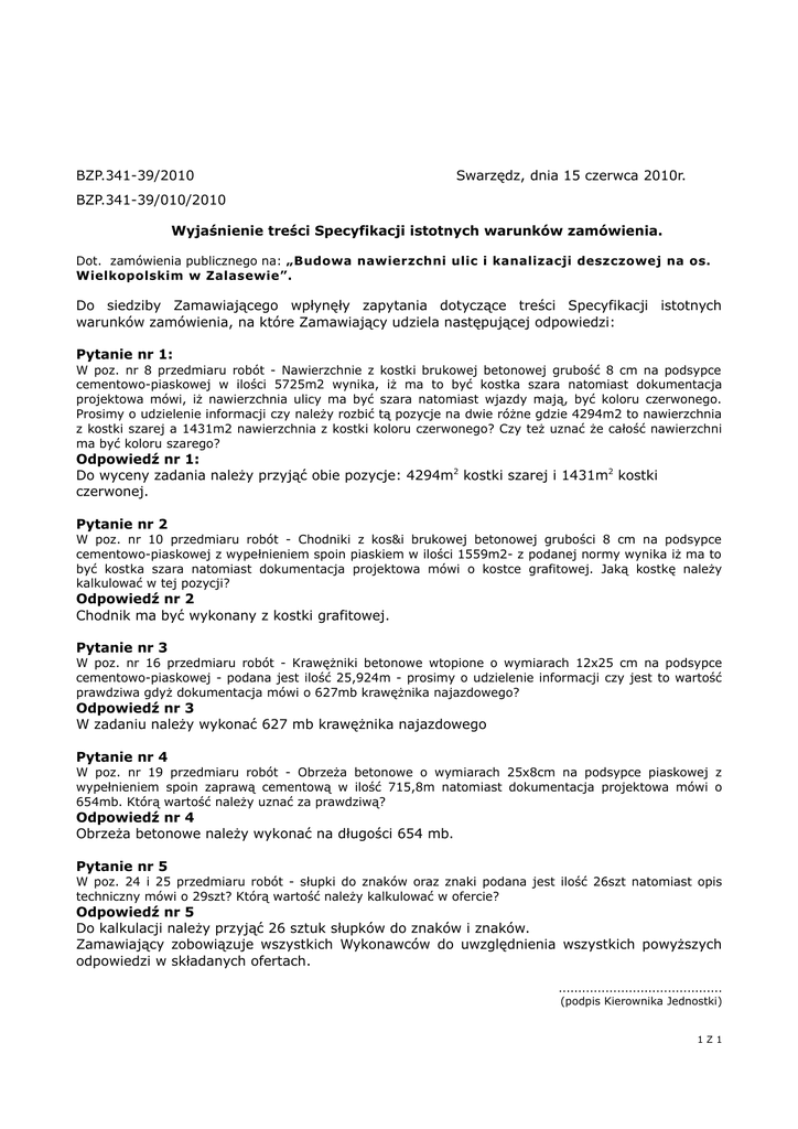 BZP.341-39/2010 Swarzędz, dnia 15 czerwca 2010r. BZP.341-39/010/2010 Wyjaśnienie treści Specyfikacji istotnych warunków zamówienia. Dot. zamówienia publicznego na: „Budowa nawierzchni ulic i kanalizacji deszczowej na os. Wielkopolskim w Zalasewie”. Do siedziby Zamawiającego wpłynęły zapytania dotyczące treści Specyfikacji istotnych warunków zamówienia, na które Zamawiający udziela następującej odpowiedzi: Pytanie nr 1: W poz. nr 8 przedmiaru robót - Nawierzchnie z kostki brukowej betonowej grubość 8 cm na podsypce cementowo-piaskowej w ilości 5725m2 wynika, iż ma to być kostka szara natomiast dokumentacja projektowa mówi, iż nawierzchnia ulicy ma być szara natomiast wjazdy mają, być koloru czerwonego. Prosimy o udzielenie informacji czy należy rozbić tą pozycje na dwie różne gdzie 4294m2 to nawierzchnia z kostki szarej a 1431m2 nawierzchnia z kostki koloru czerwonego? Czy też uznać że całość nawierzchni ma być koloru szarego? Odpowiedź nr 1: Do wyceny zadania należy przyjąć obie pozycje: 4294m2 kostki szarej i 1431m2 kostki czerwonej. Pytanie nr 2 W poz. nr 10 przedmiaru robót - Chodniki z kos&i brukowej betonowej grubości 8 cm na podsypce cementowo-piaskowej z wypełnieniem spoin piaskiem w ilości 1559m2- z podanej normy wynika iż ma to być kostka szara natomiast dokumentacja projektowa mówi o kostce grafitowej. Jaką kostkę należy kalkulować w tej pozycji? Odpowiedź nr 2 Chodnik ma być wykonany z kostki grafitowej. Pytanie nr 3 W poz. nr 16 przedmiaru robót - Krawężniki betonowe wtopione o wymiarach 12x25 cm na podsypce cementowo-piaskowej - podana jest ilość 25,924m - prosimy o udzielenie informacji czy jest to wartość prawdziwa gdyż dokumentacja mówi o 627mb krawężnika najazdowego? Odpowiedź nr 3 W zadaniu należy wykonać 627 mb krawężnika najazdowego Pytanie nr 4 W poz. nr 19 przedmiaru robót - Obrzeża betonowe o wymiarach 25x8cm na podsypce piaskowej z wypełnieniem spoin zaprawą cementową w ilość 715,8m natomiast dokumentacja projektowa mówi o 654mb. Którą wartość należy uznać za prawdziwą? Odpowiedź nr 4 Obrzeża betonowe należy wykonać na długości 654 mb. Pytanie nr 5 W poz. 24 i 25 przedmiaru robót - słupki do znaków oraz znaki podana jest ilość 26szt natomiast opis techniczny mówi o 29szt? Którą wartość należy kalkulować w ofercie? Odpowiedź nr 5 Do kalkulacji należy przyjąć 26 sztuk słupków do znaków i znaków. Zamawiający zobowiązuje wszystkich Wykonawców do uwzględnienia wszystkich powyższych odpowiedzi w składanych ofertach. .......................................... (podpis Kierownika Jednostki) 1Z1