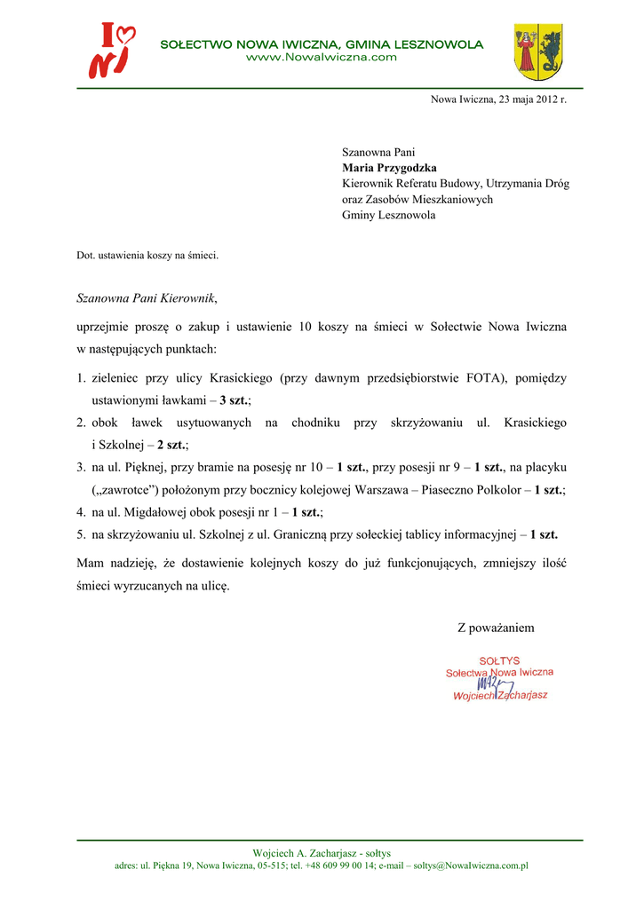 SOŁECTWO NOWA IWICZNA, GMINA LESZNOWOLA www.NowaIwiczna.com Nowa Iwiczna, 23 maja 2012 r. Szanowna Pani Maria Przygodzka Kierownik Referatu Budowy, Utrzymania Dróg oraz Zasobów Mieszkaniowych Gminy Lesznowola Dot. ustawienia koszy na śmieci. Szanowna Pani Kierownik, uprzejmie proszę o zakup i ustawienie 10 koszy na śmieci w Sołectwie Nowa Iwiczna w następujących punktach: 1. zieleniec przy ulicy Krasickiego (przy dawnym przedsiębiorstwie FOTA), pomiędzy ustawionymi ławkami – 3 szt.; 2. obok ławek usytuowanych na chodniku przy skrzyżowaniu ul. Krasickiego i Szkolnej – 2 szt.; 3. na ul. Pięknej, przy bramie na posesję nr 10 – 1 szt., przy posesji nr 9 – 1 szt., na placyku („zawrotce”) położonym przy bocznicy kolejowej Warszawa – Piaseczno Polkolor – 1 szt.; 4. na ul. Migdałowej obok posesji nr 1 – 1 szt.; 5. na skrzyżowaniu ul. Szkolnej z ul. Graniczną przy sołeckiej tablicy informacyjnej – 1 szt. Mam nadzieję, że dostawienie kolejnych koszy do już funkcjonujących, zmniejszy ilość śmieci wyrzucanych na ulicę. Z poważaniem Wojciech A. Zacharjasz - sołtys adres: ul. Piękna 19, Nowa Iwiczna, 05-515; tel. +48 609 99 00 14; e-mail – [email protected]