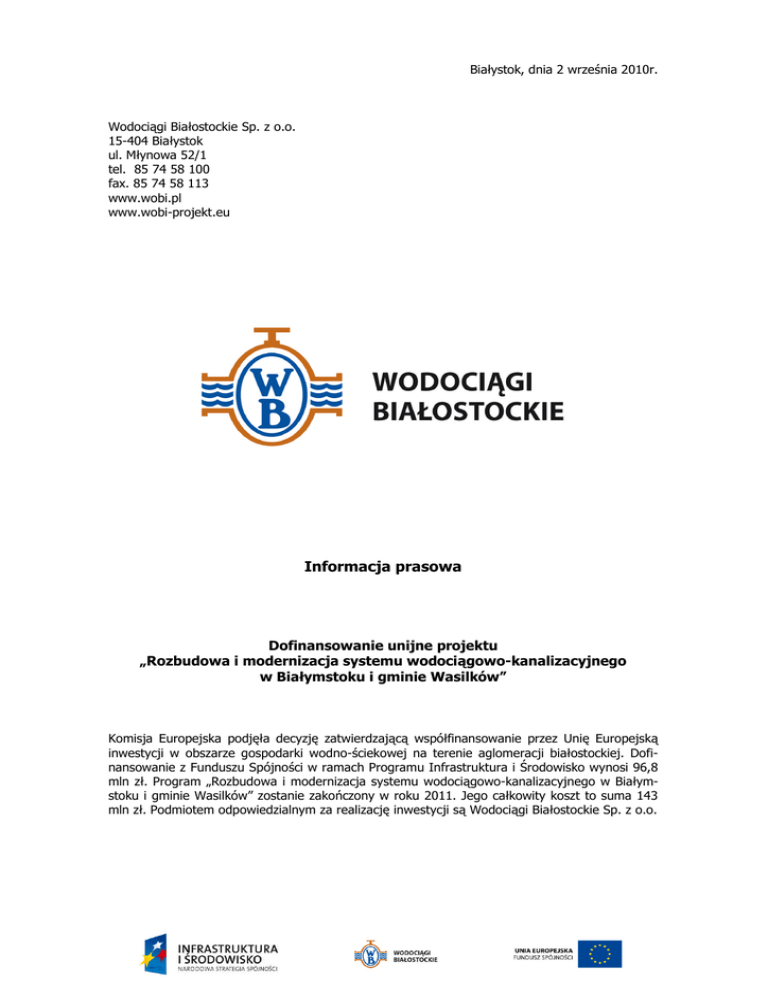 Białystok, dnia 2 września 2010r. Wodociągi Białostockie Sp. z o.o. 15-404 Białystok ul. Młynowa 52/1 tel. 85 74 58 100 fax. 85 74 58 113 www.wobi.pl www.wobi-projekt.eu Informacja prasowa Dofinansowanie unijne projektu „Rozbudowa i modernizacja systemu wodociągowo-kanalizacyjnego w Białymstoku i gminie Wasilków” Komisja Europejska podjęła decyzję zatwierdzającą współfinansowanie przez Unię Europejską inwestycji w obszarze gospodarki wodno-ściekowej na terenie aglomeracji białostockiej. Dofinansowanie z Funduszu Spójności w ramach Programu Infrastruktura i Środowisko wynosi 96,8 mln zł. Program „Rozbudowa i modernizacja systemu wodociągowo-kanalizacyjnego w Białymstoku i gminie Wasilków” zostanie zakończony w roku 2011. Jego całkowity koszt to suma 143 mln zł. Podmiotem odpowiedzialnym za realizację inwestycji są Wodociągi Białostockie Sp. z o.o. Informacja prasowa strona 2 Program inwestycyjny obejmuje budowę sieci wodociągowej i kanalizacji sanitarnej na obszarach nieskanalizowanych, rozdział kanalizacji ogólnospławnej na kanalizację sanitarną i deszczową, dotyczy także zapewnienia właściwej sprawności pozostałych elementów systemu wodociągowo-kanalizacyjnego. Dzięki realizacji programu „Rozbudowa i modernizacja systemu wodociągowo-kanalizacyjnego w Białymstoku i gminie Wasilków” powstanie lub zostanie zmodernizowanych 70 km sieci kanalizacyjnej oraz 42 km sieci wodociągowej. Liczba mieszkańców Białegostoku podłączonych do sieci kanalizacyjnej w ramach realizacji projektu to blisko 5400 osób, zaś planowana liczba mieszkańców podłączonych do sieci wodociągowej to ponad 1400 osób. Po realizacji projektu blisko 99% gospodarstw domowych Białegostoku zostanie podłączonych do sieci wodociągowej i 98,1% do sieci kanalizacyjnej. Wodociągi Białostockie są pierwszym beneficjentem, który podpisał we wrześniu 2009r. z Narodowym Funduszem Ochrony Środowiska i Gospodarki Wodnej umowę o dofinansowaniu realizacji projektu, wyłonionego w drodze konkursowej, w ramach Programu Operacyjnego Infrastruktura i Środowisko 2007-2013. Tym samym z chwilą podpisania w/w umowy Wodociągi Białostockie uzyskały możliwość finansowania realizowanych zadań z przyznanej dotacji rozwojowej. W ramach projektu „Rozbudowa i modernizacja systemu wodociągowo-kanalizacyjnego w Białymstoku i gminie Wasilków” Wodociągi Białostockie zrealizowały już inwestycje na Osiedlu Zawady, a także zakończyły część prac w Centrum Miasta. Obecnie trwa budowa i modernizacja infrastruktury wodociągowo-kanalizacyjnej w osiedlach: Dojlidy, Skorupy, Mickiewicza, Piaski, Dziesięciny, Bojary, Sienkiewicza, Wygoda. Planowane są również prace modernizacyjne na obszarze osiedli: Piasta, Białostoczek, Jaroszówka, Starosielce oraz w Centrum Miasta. Zakończenie wszystkich inwestycji w ramach projektu zaplanowano na rok 2011r. Realizacja programu przyczyni się do zwiększenia niezawodności i bezawaryjnego działania systemu wodociągowo-kanalizacyjnego, ograniczenia ryzyka wtórnego zanieczyszczenia wody, uzyskanego dzięki poprawie jego szczelności i wymianie odcinków najbardziej wyeksploatowanych. Zapewnienie szerszego dostępu mieszkańcom miasta do infrastruktury wodociągowokanalizacyjnej, działającej w sposób ciągły i niezawodny, wpłynie także na poprawę ogólnego stanu środowiska naturalnego. Projekt umożliwi także odbiór i oczyszczanie ścieków zgodnie z wymogami Dyrektywy 91/271/EWG w sprawie oczyszczania ścieków komunalnych, jak również Rozporządzenia Ministra Środowiska z dnia 24 lipca 2006 r. w sprawie warunków, jakie należy spełnić przy wprowadzaniu ścieków do wód lub do ziemi oraz w sprawie substancji szczególnie szkodliwych dla środowiska wodnego. SZCZEGÓŁY INWESTYCJI A. Budowa sieci wodociągowej oraz kanałów sanitarnych na terenach nie objętym do tej pory systemem kanalizacji sanitarnej. B. Rozdział kanałów ogólnospławnych poprzez budowę kanałów deszczowych i montaż urządzeń zapewniających oczyszczanie wód deszczowych z substancji ropopochodnych i zawiesin. C. Modernizacja i renowacja istniejącej kanalizacji sanitarnej w celu usprawnienia jej funkcjonowania. D. Modernizacja i renowacja istniejącej sieci wodociągowej oraz wymiana sieci wykonanej z rur azbestowo-cementowych oraz stalowych w celu poprawy niezawodności zaopatrzenia w wodę i polepszenia jakości wody przeznaczonej do spożycia. E. Usprawnienie dystrybucji wody poprzez uzupełnienie opomiarowania sieci wodociągowej. WODOCIĄGI BIAŁOSTOCKIE Wodociągi Białostockie, będące beneficjentem projektu „Rozbudowa i modernizacja systemu wodociągowo-kanalizacyjnego w Białymstoku i gminie Wasilków”, są najstarszym przedsiębiorstwem komunalnym, działającym od roku 1890, na obszarze aglomeracji białostockiej. Udziałowcami spółki są Miasto Białystok, posiadające 92% udziałów oraz Gmina Wasilków będąca Informacja prasowa strona 3 właścicielem 8% udziałów. Podstawową działalnością firmy jest pobór, uzdatnianie i dostarczanie wody na potrzeby miasta oraz odbieranie i oczyszczanie ścieków. Przedsiębiorstwo prowadzi także hurtową sprzedaż wody i odbiór ścieków na rzecz czterech sąsiednich gmin tj. Supraśl, Juchnowiec Kościelny, Choroszcz, Dobrzyniewo Kościelne. Obszar działalności spółki obejmuje 200 km2, zaś liczba odbiorców korzystająca z sieci wodociągowo-kanalizacyjnej to ok. 300 tys. osób. Całkowita długość sieci wodociągowej będącej własnością przedsiębiorstwa wynosi ok. 1000 km, zaś kanalizacji sanitarnej to ok. 480 km. Głównym źródłem zaopatrzenia aglomeracji białostockiej w wodę jest rzeka Supraśl, stanowiąca prawy dopływ rzeki Narew. Bazują na niej dwa ujęcia wody Wodociągów Białostockich w Wasilkowie tj. ujęcie wody powierzchniowej i ujęcie wody infiltracyjnej oraz trzecie ujęcie wody w Jurowcach, wykorzystuje również zas