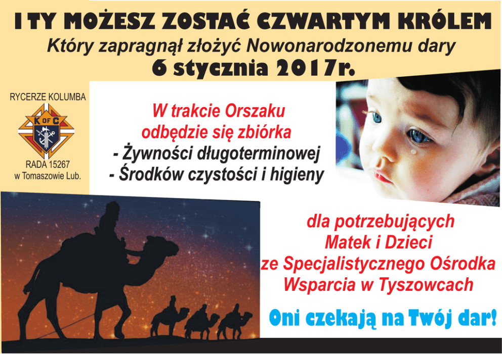 I TY MOŻESZ ZOSTAĆ CZWARTYM KRÓLEM Który zapragnął złożyć Nowonarodzonemu dary 6 stycznia 2017r. RYCERZE KOLUMBA RADA 15267 w Tomaszowie Lub. W trakcie Orszaku odbędzie się zbiórka - Żywności długoterminowej - Środków czystości i higieny dla potrzebujących Matek i Dzieci ze Specjalistycznego Ośrodka Wsparcia w Tyszowcach Oni czekają na Twój dar!