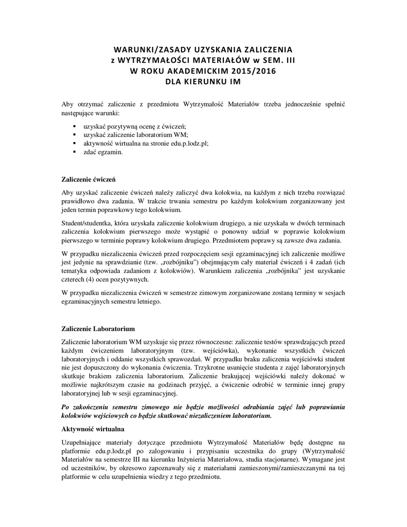 WARUNKI/ZASADY UZYSKANIA ZALICZENIA z WYTRZYMAŁOŚCI MATERIAŁÓW w SEM. III W ROKU AKADEMICKIM 2015/2016 DLA KIERUNKU IM Aby otrzymać zaliczenie z przedmiotu Wytrzymałość Materiałów trzeba jednocześnie spełnić następujące warunki: uzyskać pozytywną ocenę z ćwiczeń; uzyskać zaliczenie laboratorium WM; aktywność wirtualna na stronie edu.p.lodz.pl; zdać egzamin. Zaliczenie ćwiczeń Aby uzyskać zaliczenie ćwiczeń należy zaliczyć dwa kolokwia, na każdym z nich trzeba rozwiązać prawidłowo dwa zadania. W trakcie trwania semestru po każdym kolokwium zorganizowany jest jeden termin poprawkowy tego kolokwium. Student/studentka, która uzyskała zaliczenie kolokwium drugiego, a nie uzyskała w dwóch terminach zaliczenia kolokwium pierwszego może wystąpić o ponowny udział w poprawie kolokwium pierwszego w terminie poprawy kolokwium drugiego. Przedmiotem poprawy są zawsze dwa zadania. W przypadku niezaliczenia ćwiczeń przed rozpoczęciem sesji egzaminacyjnej ich zaliczenie możliwe jest jedynie na sprawdzianie (tzw. „rozbójniku”) obejmującym cały materiał ćwiczeń i 4 zadań (ich tematyka odpowiada zadaniom z kolokwiów). Warunkiem zaliczenia „rozbójnika” jest uzyskanie czterech (4) ocen pozytywnych. W przypadku niezaliczenia ćwiczeń w semestrze zimowym zorganizowane zostaną terminy w sesjach egzaminacyjnych semestru letniego. Zaliczenie Laboratorium Zaliczenie laboratorium WM uzyskuje się przez równoczesne: zaliczenie testów sprawdzających przed każdym ćwiczeniem laboratoryjnym (tzw. wejściówka), wykonanie wszystkich ćwiczeń laboratoryjnych i oddanie wszystkich sprawozdań. W przypadku braku zaliczenia wejściówki student nie jest dopuszczony do wykonania ćwiczenia. Trzykrotne usunięcie studenta z zajęć laboratoryjnych skutkuje brakiem zaliczenia laboratorium. Zaliczenie brakującej wejściówki należy dokonać w możliwie najkrótszym czasie na godzinach przyjęć, a ćwiczenie odrobić w terminie innej grupy laboratoryjnej lub w sesji egzaminacyjnej. Po zakończeniu semestru zimowego nie będzie możliwości odrabiania zajęć lub poprawiania kolokwiów wejściowych co będzie skutkować niezaliczeniem laboratorium. Aktywność wirtualna Uzupełniające materiały dotyczące przedmiotu Wytrzymałość Materiałów będę dostępne na platformie edu.p.lodz.pl po zalogowaniu i przypisaniu uczestnika do grupy (Wytrzymałość Materiałów na semestrze III na kierunku Inżynieria Materiałowa, studia stacjonarne). Wymagane jest od uczestników, by okresowo zapoznawały się z materiałami zamieszonymi/zamieszczanymi na tej platformie w celu uzupełnienia wiedzy z tego przedmiotu. Egzamin Egzamin składa się z trzech części. Część pisemna obejmuje część zadaniową (część I) z czterema zadaniami do rozwiązania oraz część teoretyczną (część II), w której na trzech prostych przykładach, opracowywane są szczegóły teoretyczne danego zagadnienia. Osoby, które uzyskały zaliczenie ćwiczeń są zwolnione z części zadaniowej. Trzecia część - ustna ma za zadanie weryfikację umiejętności i wiedzy studenta z całego zakresu przedmiotu wytrzymałości materiałów. Warunkiem dopuszczenia do części ustnej jest uzyskanie pozytywnych ocen ze wszystkich (3) zagadnień do rozwiązania/opracowania. W przypadku niezaliczenia egzaminu w semestrze zimowym zorganizowane zostaną terminy egzaminu w sesjach egzaminacyjnych semestru letniego. Ustalenie oceny końcowej Warunkiem dopuszczenia do egzaminu jest zaliczenie laboratorium (ocena końcowa to średnia arytmetyczna wszystkich ocen), ćwiczeń (zaliczenie wszystkich kolokwiów - ocena końcowa to średnia arytmetyczna ocen z kolokwiów) oraz aktywność wirtualnej na stronie edu.p.lodz.pl (trzeba uzyskać potwierdzenie okresowego logowania na platformie). Ocena końcowa stanowi 45% oceny z egzaminu; aktywność na platformie 5%; 35% z ćwiczeń i 15% z laboratorium. Liczba terminów w sesjach Sesja zimowa (bezpośrednio po zajęciach): dwa terminy zaliczenia ćwiczeń, trzy terminy odrobienia laboratorium, cztery terminy egzaminu. Sesja letnia (w kolejnym semestrze po odbywaniu zajęć): dwa terminy zaliczenia ćwiczeń (po jednym terminie w każdej części sesji), dwa terminy egzaminu (po jednym terminie w każdej części sesji).