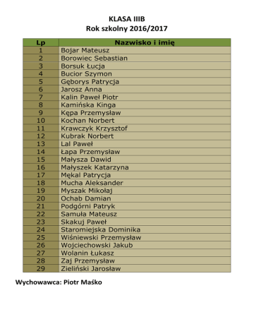 KLASA IIIB Rok szkolny 2016/2017 Lp 1 2 3 4 5 6 7 8 9 10 11 12 13 14 15 16 17 18 19 20 21 22 23 24 25 26 27 28 29 Nazwisko i imię Bojar Mateusz Borowiec Sebastian Borsuk Łucja Bucior Szymon Gęborys Patrycja Jarosz Anna Kalin Paweł Piotr Kamińska Kinga Kępa Przemysław Kochan Norbert Krawczyk Krzysztof Kubrak Norbert Lal Paweł Łapa Przemysław Małysza Dawid Małyszek Katarzyna Mękal Patrycja Mucha Aleksander Myszak Mikołaj Ochab Damian Podgórni Patryk Samuła Mateusz Skakuj Paweł Staromiejska Dominika Wiśniewski Przemysław Wojciechowski Jakub Wolanin Łukasz Zaj Przemysław Zieliński Jarosław Wychowawca: Piotr Maśko