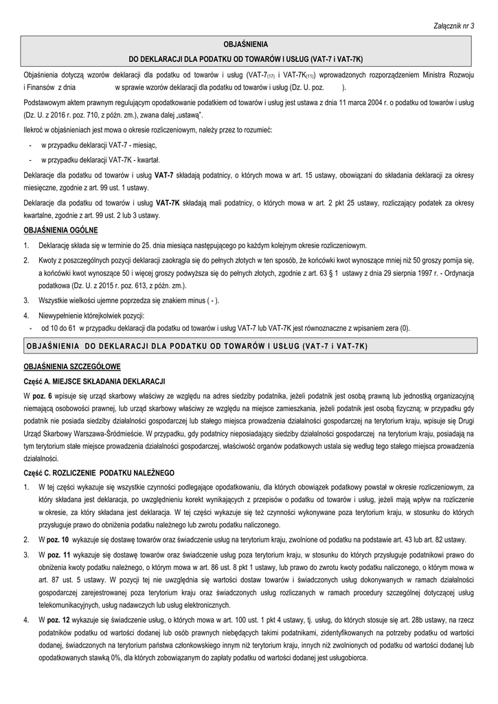 Załącznik nr 3 OBJAŚNIENIA DO DEKLARACJI DLA PODATKU OD TOWARÓW I USŁUG (VAT-7 i VAT-7K) Objaśnienia dotyczą wzorów deklaracji dla podatku od towarów i usług (VAT-7(17) i VAT-7K(11)) wprowadzonych rozporządzeniem Ministra Rozwoju i Finansów z dnia w sprawie wzorów deklaracji dla podatku od towarów i usług (Dz. U. poz. ). Podstawowym aktem prawnym regulującym opodatkowanie podatkiem od towarów i usług jest ustawa z dnia 11 marca 2004 r. o podatku od towarów i usług (Dz. U. z 2016 r. poz. 710, z późn. zm.), zwana dalej „ustawą”. Ilekroć w objaśnieniach jest mowa o okresie rozliczeniowym, należy przez to rozumieć: - w przypadku deklaracji VAT-7 - miesiąc, - w przypadku deklaracji VAT-7K - kwartał. Deklaracje dla podatku od towarów i usług VAT-7 składają podatnicy, o których mowa w art. 15 ustawy, obowiązani do składania deklaracji za okresy miesięczne, zgodnie z art. 99 ust. 1 ustawy. Deklaracje dla podatku od towarów i usług VAT-7K składają mali podatnicy, o których mowa w art. 2 pkt 25 ustawy, rozliczający podatek za okresy kwartalne, zgodnie z art. 99 ust. 2 lub 3 ustawy. OBJAŚNIENIA OGÓLNE 1. Deklarację składa się w terminie do 25. dnia miesiąca następującego po każdym kolejnym okresie rozliczeniowym. 2. Kwoty z poszczególnych pozycji deklaracji zaokrągla się do pełnych złotych w ten sposób, że końcówki kwot wynoszące mniej niż 50 groszy pomija się, a końcówki kwot wynoszące 50 i więcej groszy podwyższa się do pełnych złotych, zgodnie z art. 63 § 1 ustawy z dnia 29 sierpnia 1997 r. - Ordynacja podatkowa (Dz. U. z 2015 r. poz. 613, z późn. zm.). 3. Wszystkie wielkości ujemne poprzedza się znakiem minus ( - ). 4. Niewypełnienie którejkolwiek pozycji: - od 10 do 61 w przypadku deklaracji dla podatku od towarów i usług VAT-7 lub VAT-7K jest równoznaczne z wpisaniem zera (0). OB J A ŚN IEN IA D O D EK L A R A C J I D L A POD A T K U OD T OWA R ÓW I U SŁ U G ( VA T - 7 i VA T - 7K ) OBJAŚNIENIA SZCZEGÓŁOWE Część A. MIEJSCE SKŁADANIA DEKLARACJI W poz. 6 wpisuje się urząd skarbowy właściwy ze względu na adres siedziby podatnika, jeżeli podatnik jest osobą prawną lub jednostką organizacyjną niemającą osobowości prawnej, lub urząd skarbowy właściwy ze względu na miejsce zamieszkania, jeżeli podatnik jest osobą fizyczną; w przypadku gdy podatnik nie posiada siedziby działalności gospodarczej lub stałego miejsca prowadzenia działalności gospodarczej na terytorium kraju, wpisuje się Drugi Urząd Skarbowy Warszawa-Śródmieście. W przypadku, gdy podatnicy nieposiadający siedziby działalności gospodarczej na terytorium kraju, posiadają na tym terytorium stałe miejsce prowadzenia działalności gospodarczej, właściwość organów podatkowych ustala się według tego stałego miejsca prowadzenia działalności. Część C. ROZLICZENIE PODATKU NALEŻNEGO 1. W tej części wykazuje się wszystkie czynności podlegające opodatkowaniu, dla których obowiązek podatkowy powstał w okresie rozliczeniowym, za który składana jest deklaracja, po uwzględnieniu korekt wynikających z przepisów o podatku od towarów i usług, jeżeli mają wpływ na rozliczenie w okresie, za który składana jest deklaracja. W tej części wykazuje się też czynności wykonywane poza terytorium kraju, w stosunku do których przysługuje prawo do obniżenia podatku należnego lub zwrotu podatku naliczonego. 2. W poz. 10 wykazuje się dostawę towarów oraz świadczenie usług na terytorium kraju, zwolnione od podatku na podstawie art. 43 lub art. 82 ustawy. 3. W poz. 11 wykazuje się dostawę towarów oraz świadczenie usług poza terytorium kraju, w stosunku do których przysługuje podatnikowi prawo do obniżenia kwoty podatku należnego, o którym mowa w art. 86 ust. 8 pkt 1 ustawy, lub prawo do zwrotu kwoty podatku naliczonego, o którym mowa w art. 87 ust. 5 ustawy. W pozycji tej nie uwzględnia się wartości dostaw towarów i świadczonych usług dokonywanych w ramach działalności gospodarczej zarejestrowanej poza terytorium kraju oraz świadczonych usług rozliczanych w ramach procedury szczególnej dotyczącej usług telekomunikacyjnych, usług nadawczych lub usług elektronicznych. 4. W poz. 12 wykazuje się świadczenie usług, o których mowa w art. 100 ust. 1 pkt 4 ustawy, tj. usług, do których stosuje się art. 28b ustawy, na rzecz podatników podatku od wartości dodanej lub osób prawnych niebędących takimi podatnikami, zidentyfikowanych na potrzeby podatku od wartości dodanej, świadczonych na terytorium państwa członkowskiego innym niż terytorium kraju, innych niż zwolnionych od podatku od wartości dodanej lub opodatkowanych stawką 0%, dla których zobowiązanym do zapłaty podatku od wartości dodanej jest usługobiorca. 2 5. W wierszu 4 „Dostawa towarów oraz świadczenie usług na terytorium kraju, opodatkowane stawką 5%” w poz. 15 wykazuje się podstawę opodatkowania transakcji opodatkowanych stawką, o której mowa w art. 41 ust. 2a ustawy, a w poz. 16 wykazuje się podatek należny od tych transakcji. 6. W wierszu 5 „Dostawa towarów oraz świadczenie usług na terytorium kraju, opodatkowane stawką 7% albo 8%” w poz. 17 wykazuje się podstawę opodatkowania transakcji opodatkowanych stawką, o której mowa w art. 146a pkt 2 ustawy, tj. stawką 8%, a w poz. 18 – podatek należny od tych transakcji. W wierszu tym wykazuje się również transakcje opodatkowane wg stawki 7% (podstawa opodatkowania i podatek należny), jeżeli zgodnie z przepisami o podatku od towarów i usług w okresie rozliczeniowym, za który składana jest deklaracja, wystąpił taki przypadek, a także uwzględniane są korekty takich transakcji, jeżeli mają wpływ na rozliczenie podatku należnego w okresie, za który składana jest deklaracja. 7. W wierszu 6 „Dostawa towarów oraz świadczenie usług na terytorium kraju, opodatkowane stawką 22% albo 23%” w poz. 19 wykazuje