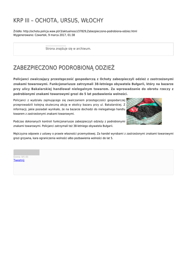 KRP III – OCHOTA, URSUS, WŁOCHY Źródło: http://ochota.policja.waw.pl/r3/aktualnosci/37829,Zabezpieczono-podrobiona-odziez.html Wygenerowano: Czwartek, 9 marca 2017, 01:38 Strona znajduje się w archiwum. ZABEZPIECZONO PODROBIONĄ ODZIEŻ Policjanci zwalczający przestępczość gospodarczą z Ochoty zabezpieczyli odzież z zastrzeżonymi znakami towarowymi. Funkcjonariusze zatrzymali 38-letniego obywatela Bułgarii, który na bazarze przy ulicy Bakalarskiej handlował nielegalnym towarem. Za wprowadzanie do obrotu rzeczy z podrobionymi znakami towarowymi grozi do 5 lat pozbawienia wolności. Policjanci z wydziału zajmującego się zwalczaniem przestępczości gospodarczej przeprowadzili kolejną skuteczną akcję w okolicy bazaru przy ul. Bakalarskiej. Z informacji, jakie posiadali wynikało, że na bazarze dochodzi do nielegalnego handlu towarem z zastrzeżonymi znakami towarowymi. Podczas dokonanych kontroli funkcjonariusze zabezpieczyli odzieży z podrobionymi znakami towarowymi. Policjanci zatrzymali też 38-letniego obywatela Bułgarii. Mężczyzna odpowie z ustawy o prawie własności przemysłowej. Za handel wyrobami z zastrzeżonymi znakami towarowymi grozi grzywna, kara ograniczenia wolności albo pozbawienia wolności do lat 5. Ocena: 0/5 (0) Tweetnij
