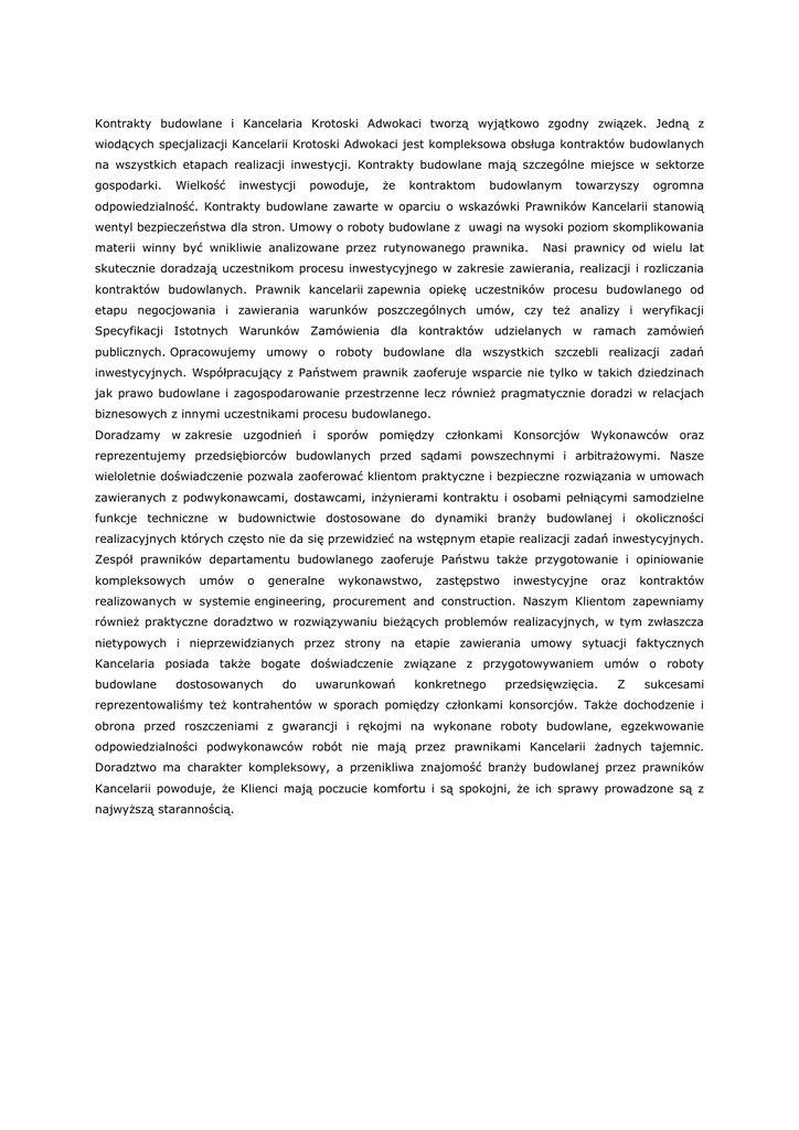 Kontrakty budowlane i Kancelaria Krotoski Adwokaci tworzą wyjątkowo zgodny związek. Jedną z wiodących specjalizacji Kancelarii Krotoski Adwokaci jest kompleksowa obsługa kontraktów budowlanych na wszystkich etapach realizacji inwestycji. Kontrakty budowlane mają szczególne miejsce w sektorze gospodarki. Wielkość inwestycji powoduje, że kontraktom budowlanym towarzyszy ogromna odpowiedzialność. Kontrakty budowlane zawarte w oparciu o wskazówki Prawników Kancelarii stanowią wentyl bezpieczeństwa dla stron. Umowy o roboty budowlane z uwagi na wysoki poziom skomplikowania materii winny być wnikliwie analizowane przez rutynowanego prawnika. Nasi prawnicy od wielu lat skutecznie doradzają uczestnikom procesu inwestycyjnego w zakresie zawierania, realizacji i rozliczania kontraktów budowlanych. Prawnik kancelarii zapewnia opiekę uczestników procesu budowlanego od etapu negocjowania i zawierania warunków poszczególnych umów, czy też analizy i weryfikacji Specyfikacji Istotnych Warunków Zamówienia dla kontraktów udzielanych w ramach zamówień publicznych. Opracowujemy umowy o roboty budowlane dla wszystkich szczebli realizacji zadań inwestycyjnych. Współpracujący z Państwem prawnik zaoferuje wsparcie nie tylko w takich dziedzinach jak prawo budowlane i zagospodarowanie przestrzenne lecz również pragmatycznie doradzi w relacjach biznesowych z innymi uczestnikami procesu budowlanego. Doradzamy w zakresie uzgodnień i sporów pomiędzy członkami Konsorcjów Wykonawców oraz reprezentujemy przedsiębiorców budowlanych przed sądami powszechnymi i arbitrażowymi. Nasze wieloletnie doświadczenie pozwala zaoferować klientom praktyczne i bezpieczne rozwiązania w umowach zawieranych z podwykonawcami, dostawcami, inżynierami kontraktu i osobami pełniącymi samodzielne funkcje techniczne w budownictwie dostosowane do dynamiki branży budowlanej i okoliczności realizacyjnych których często nie da się przewidzieć na wstępnym etapie realizacji zadań inwestycyjnych. Zespół prawników departamentu budowlanego zaoferuje Państwu także przygotowanie i opiniowanie kompleksowych umów o generalne wykonawstwo, zastępstwo inwestycyjne oraz kontraktów realizowanych w systemie engineering, procurement and construction. Naszym Klientom zapewniamy również praktyczne doradztwo w rozwiązywaniu bieżących problemów realizacyjnych, w tym zwłaszcza nietypowych i nieprzewidzianych przez strony na etapie zawierania umowy sytuacji faktycznych Kancelaria posiada także bogate doświadczenie związane z przygotowywaniem umów o roboty budowlane dostosowanych do uwarunkowań konkretnego przedsięwzięcia. Z sukcesami reprezentowaliśmy też kontrahentów w sporach pomiędzy członkami konsorcjów. Także dochodzenie i obrona przed roszczeniami z gwarancji i rękojmi na wykonane roboty budowlane, egzekwowanie odpowiedzialności podwykonawców robót nie mają przez prawnikami Kancelarii żadnych tajemnic. Doradztwo ma charakter kompleksowy, a przenikliwa znajomość branży budowlanej przez prawników Kancelarii powoduje, że Klienci mają poczucie komfortu i są spokojni, że ich sprawy prowadzone są z najwyższą starannością.