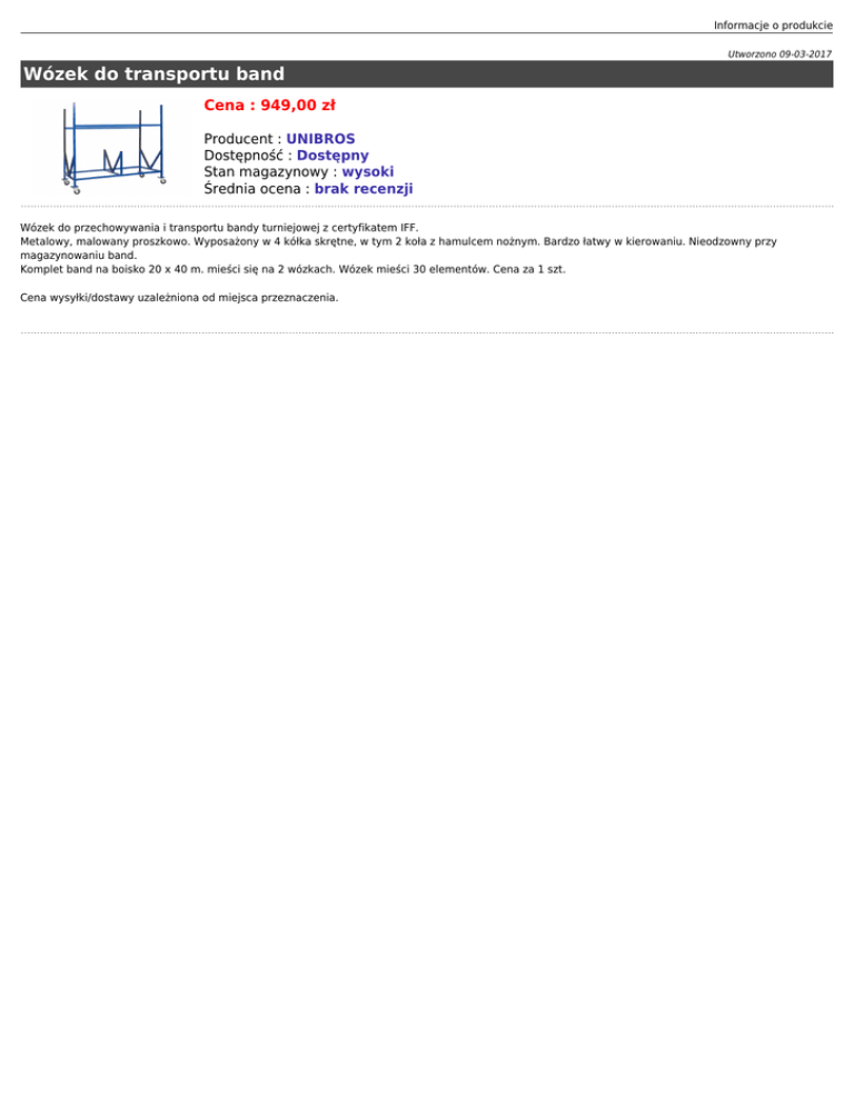 Informacje o produkcie Utworzono 09-03-2017 Wózek do transportu band Cena : 949,00 zł Producent : UNIBROS Dostępność : Dostępny Stan magazynowy : wysoki Średnia ocena : brak recenzji Wózek do przechowywania i transportu bandy turniejowej z certyfikatem IFF. Metalowy, malowany proszkowo. Wyposażony w 4 kółka skrętne, w tym 2 koła z hamulcem nożnym. Bardzo łatwy w kierowaniu. Nieodzowny przy magazynowaniu band. Komplet band na boisko 20 x 40 m. mieści się na 2 wózkach. Wózek mieści 30 elementów. Cena za 1 szt. Cena wysyłki/dostawy uzależniona od miejsca przeznaczenia.