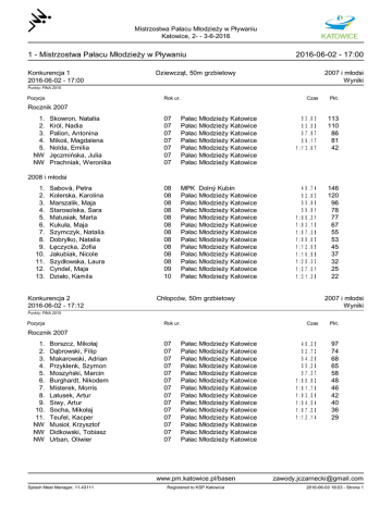 Mistrzostwa Pa acu M odzie y w P ywaniu Katowice, 2- - 3-6-2016 1 - Mistrzostwa Pa acu M odzie y w P ywaniu Konkurencja 1 2016-06-02 - 17:00 2016-06-02 - 17:00 Dziewcz t, 50m grzbietowy 2007 i m odsi Wyniki Punkty: FINA 2015 Pozycja Rok ur. Czas Pkt. Rocznik 2007 1. 2. 3. 4. 5. NW NW Skowron, Natalia Król, Nadia Palion, Antonina Miko , Magdalena Nolda, Emilia czmi ska, Julia Prachniak, Weronika 07 07 07 07 07 07 07 Pa ac M odzie Pa ac M odzie Pa ac M odzie Pa ac M odzie Pa ac M odzie Pa ac M odzie Pa ac M odzie y Katowice y Katowice y Katowice y Katowice y Katowice y Katowice y Katowice 53.03 53.50 57.97 59.17 1:13.67 113 110 86 81 42 08 08 08 08 08 08 08 08 08 08 08 09 10 MPK Dolný Kubín Pa ac M odzie y Katowice Pa ac M odzie y Katowice Pa ac M odzie y Katowice Pa ac M odzie y Katowice Pa ac M odzie y Katowice Pa ac M odzie y Katowice Pa ac M odzie y Katowice Pa ac M odzie y Katowice Pa ac M odzie y Katowice Pa ac M odzie y Katowice Pa ac M odzie y Katowice Pa ac M odzie y Katowice 48.74 52.03 55.90 59.91 1:00.21 1:03.10 1:07.39 1:08.05 1:12.05 1:16.98 1:20.33 1:27.51 1:31.38 146 120 96 78 77 67 55 53 45 37 32 25 22 2008 i m odsi 1. 2. 3. 4. 5. 6. 7. 8. 9. 10. 11. 12. 13. Sabová, Petra Kolerska, Karolina Marszalik, Maja Starosolska, Sara Matusiak, Marta Kuku a, Maja Szymczyk, Natalia Dobry ko, Natalia czycka, Zofia Jakubiak, Nicole Szyd owska, Laura Cyndel, Maja Dzia o, Kamila Konkurencja 2 2016-06-02 - 17:12 Ch opców, 50m grzbietowy 2007 i m odsi Wyniki Punkty: FINA 2015 Pozycja Rok ur. Czas Pkt. 48.25 52.73 54.28 55.26 57.37 1:00.92 1:01.70 1:03.59 1:04.54 1:07.20 1:12.14 97 74 68 65 58 48 46 42 40 36 29 Rocznik 2007 1. 2. 3. 4. 5. 6. 7. 8. 9. 10. 11. NW NW NW Borszcz, Miko aj browski, Filip Makarowski, Adrian Przyklenk, Szymon Moszy ski, Marcin Burghardt, Nikodem Misterek, Morris Latusek, Artur Siwy, Artur Socha, Miko aj Teufel, Kacper Musio , Krzysztof Didkowski, Tobiasz Urban, Oliwier 07 07 07 07 07 07 07 07 07 07 07 07 07 07 Pa ac M odzie Pa ac M odzie Pa ac M odzie Pa ac M odzie Pa ac M odzie Pa ac M odzie Pa ac M odzie Pa ac M odzie Pa ac M odzie Pa ac M odzie Pa ac M odzie Pa ac M odzie Pa ac M odzie Pa ac M odzie y Katowice y Katowice y Katowice y Katowice y Katowice y Katowice y Katowice y Katowice y Katowice y Katowice y Katowice y Katowice y Katowice y Katowice www.pm.katowice.pl/basen Splash Meet Manager, 11.43111 Registered to KSP Katowice [email protected] 2016-06-03 18:03 - Strona 1 Mistrzostwa Pa acu M odzie y w P ywaniu Katowice, 2- - 3-6-2016 Konkurencja 2, Ch opców, 50m grzbietowy 2008 i m odsi 1. 2. 3. 4. 5. 6. 7. 8. 9. 10. 11. Sitkiewicz, Karol Rogaczewski, Aleksander Tomczy ski, Aleks Kuku a, Bartosz Gajek, Dariusz Sawa ciuk, Tymoteusz Nolda, Nikodem Jesipowicz, Jakub Goik, ukasz Kondrot, Nikodem Sznura, Szymon Konkurencja 3 2016-06-02 - 17:26 09 09 09 08 08 09 09 09 09 09 09 Pa ac M odzie Pa ac M odzie Pa ac M odzie Pa ac M odzie Pa ac M odzie Pa ac M odzie Pa ac M odzie Pa ac M odzie Pa ac M odzie Pa ac M odzie Pa ac M odzie y Katowice y Katowice y Katowice y Katowice y Katowice y Katowice y Katowice y Katowice y Katowice y Katowice y Katowice 1:00.28 1:10.02 1:11.73 1:11.98 1:13.49 1:17.87 1:18.83 1:19.20 1:20.76 1:36.73 1:43.10 Dziewcz t, 50m dowolny 50 31 29 29 27 23 22 22 20 12 10 2007 i m odsi Wyniki Punkty: FINA 2015 Pozycja Rok ur. Czas Pkt. Rocznik 2007 1. 2. 3. 4. 5. Sitkiewicz, Jagoda Berna , Aleksandra Wojda, Oliwia Piskornik, Hanna Durynek, Paulina 07 07 07 07 07 Pa ac M odzie y Katowice MKS - MOS Katowice Pa ac M odzie y Katowice Pa ac M odzie y Katowice Pa ac M odzie y Katowice 45.60 45.79 51.64 57.61 1:18.10 132 130 91 65 26 08 08 08 08 08 08 08 08 08 Pa ac M odzie y Katowice Pa ac M odzie y Katowice MPK Dolný Kubín MPK Dolný Kubín Pa ac M odzie y Katowice Pa ac M odzie y Katowice Pa ac M odzie y Katowice Pa ac M odzie y Katowice Pa ac M odzie y Katowice 46.90 47.67 48.24 53.25 54.50 56.54 1:01.70 1:09.34 1:13.25 121 115 111 83 77 69 53 37 31 2008 i m odsi 1. 2. 3. 4. 5. 6. 7. 8. 9. Faruga, Julia Pó kotycka, Olga Sabová, Aneta Urbanová, Linda Starosolska, Sara Michalik, Karolina Grabowska, Patrycja Szady, Lilianna Zawi lak, Natalia Konkurencja 4 2016-06-02 - 17:36 Ch opców, 50m dowolny 2007 i m odsi Wyniki Punkty: FINA 2015 Pozycja Rok ur. Czas Pkt. Rocznik 2007 1. 2. 3. NW Bator, Jakub Wi niewski, Wiktor Krupa, Adam Górski, Pawe 07 07 07 07 Pa ac M odzie Pa ac M odzie Pa ac M odzie Pa ac M odzie y Katowice y Katowice y Katowice y Katowice 47.08 47.37 1:10.55 79 78 23 08 08 08 08 Pa ac M odzie Pa ac M odzie Pa ac M odzie Pa ac M odzie y Katowice y Katowice y Katowice y Katowice 52.15 1:11.52 1:13.78 1:21.38 58 22 20 15 2008 i m odsi 1. 2. 3. 4. Katarzy ski, Jakub Lysko, Micha Sikowski, Krzysztof Janeczko, Piotr www.pm.katowice.pl/basen Splash Meet Manager, 11.43111 Registered to KSP Katowice [email protected] 2016-06-03 18:03 - Strona 2 Mistrzostwa Pa acu M odzie y w P ywaniu Katowice, 2- - 3-6-2016 2 - Mistrzostwa Pa acu M odzie y w P ywaniu Konkurencja 5 2016-06-03 - 16:00 2016-06-03 - 16:00 Kobiet, 50m motylkowy Rocznik 1998 - 2006 Wyniki Punkty: FINA 2015 Pozycja Rok ur. Czas Pkt. Rocznik 1998 - 2002 1. 2. 3. NW Krasnod bska, Ma gorzata Rachwa , Julia Wczasek, Aleksandra Soko owska, Ewa 02 01 02 02 Pa ac M odzie Pa ac M odzie Pa ac M odzie Pa ac M odzie y Katowice y Katowice y Katowice y Katowice 32.64 41.65 42.17 416 200 193 04 04 Pa ac M odzie y Katowice Pa ac M odzie y Katowice 35.32 38.15 328 260 05 05 Pa ac M odzie y Katowice Pa ac M odzie y Katowice 48.39 50.83 127 110 Rocznik 2003 - 2004 1. Czech, Edyta 2. Miler, Martyna Rocznik 2005 - 2006 1. Chodnicka, Zofia 2. Bosowska, Wiktoria Konkurencja 6 2016-06-03 - 16:07 Ch opców, 50m motylkowy Rocznik 1998 - 2006 Wyniki Punkty: FINA 2015 Pozycja Rok ur. Czas Pkt. Rocznik 1998 - 2002 1. 2. 3. 4. 5. 6. NW Olejnik, Marcin browski, Dawid Ko acki, Grzegorz Przewo ny, Jakub Rosi ski, Jaros aw Dziewa towski, Nikodem Przyby o, Piotr 99 98 01 02 00 02 02 Pa ac M odzie Pa ac M odzie Pa