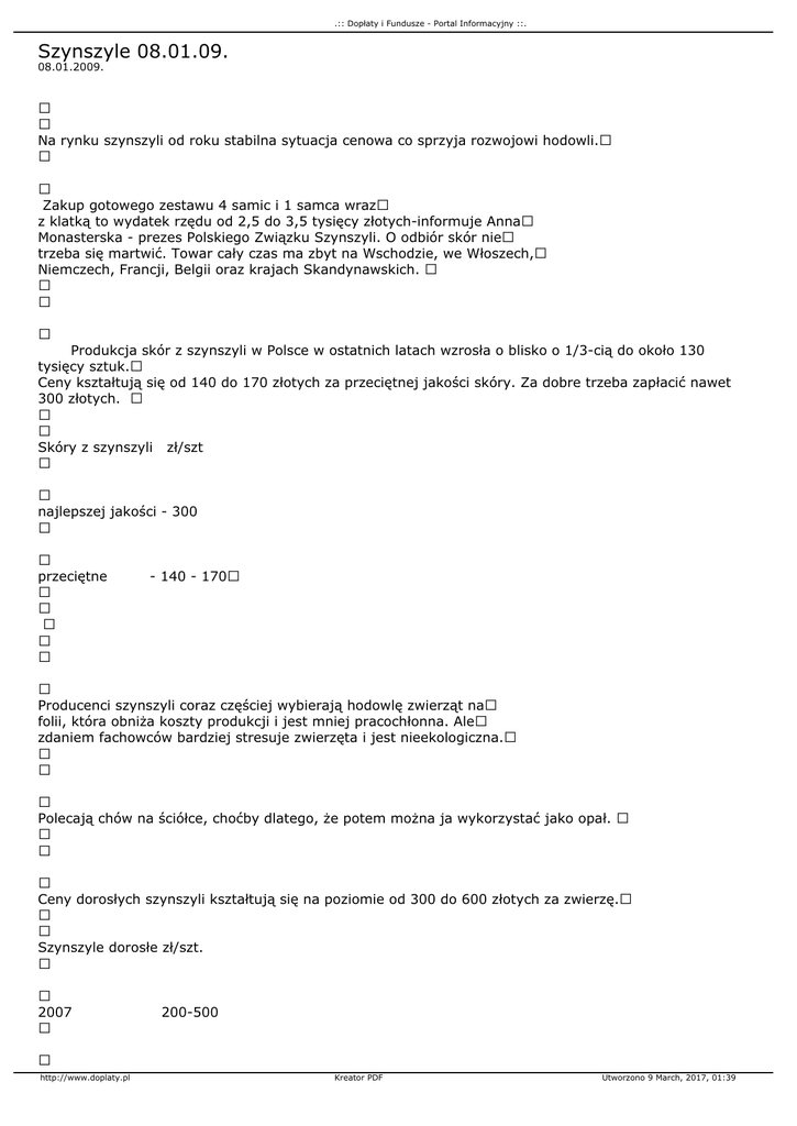 .:: Dopłaty i Fundusze - Portal Informacyjny ::. Szynszyle 08.01.09. 08.01.2009. Na rynku szynszyli od roku stabilna sytuacja cenowa co sprzyja rozwojowi hodowli. Zakup gotowego zestawu 4 samic i 1 samca wraz z klatką to wydatek rzędu od 2,5 do 3,5 tysięcy złotych-informuje Anna Monasterska - prezes Polskiego Związku Szynszyli. O odbiór skór nie trzeba się martwić. Towar cały czas ma zbyt na Wschodzie, we Włoszech, Niemczech, Francji, Belgii oraz krajach Skandynawskich. Produkcja skór z szynszyli w Polsce w ostatnich latach wzrosła o blisko o 1/3-cią do około 130 tysięcy sztuk. Ceny kształtują się od 140 do 170 złotych za przeciętnej jakości skóry. Za dobre trzeba zapłacić nawet 300 złotych. Skóry z szynszyli zł/szt najlepszej jakości - 300 przeciętne - 140 - 170 Producenci szynszyli coraz częściej wybierają hodowlę zwierząt na folii, która obniża koszty produkcji i jest mniej pracochłonna. Ale zdaniem fachowców bardziej stresuje zwierzęta i jest nieekologiczna. Polecają chów na ściółce, choćby dlatego, że potem można ja wykorzystać jako opał. Ceny dorosłych szynszyli kształtują się na poziomie od 300 do 600 złotych za zwierzę. Szynszyle dorosłe zł/szt. 2007 200-500 http://www.doplaty.pl Kreator PDF Utworzono 9 March, 2017, 01:39 .:: Dopłaty i Fundusze - Portal Informacyjny ::. 2008 300-600 Gotowa pasza też bez zmian, za kilogram trzeba teraz zapłacić maksymalnie 2 złote i 40 groszy. Gotowa pasza zł/kg 20040,9-1,8 20071,3-2,0 20081,4-2,4 Anna Borowska / TVP Informacje Rolnicze http://www.doplaty.pl Kreator PDF Utworzono 9 March, 2017, 01:39