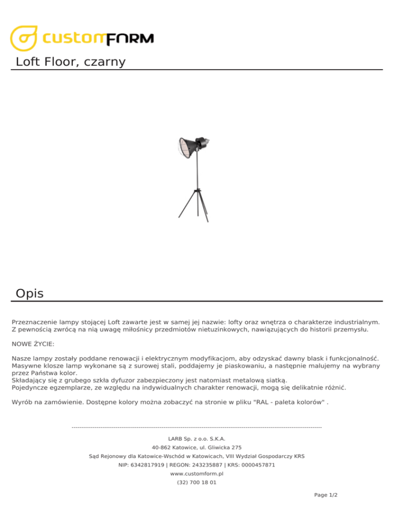 Loft Floor, czarny Opis Przeznaczenie lampy stojącej Loft zawarte jest w samej jej nazwie: lofty oraz wnętrza o charakterze industrialnym. Z pewnością zwrócą na nią uwagę miłośnicy przedmiotów nietuzinkowych, nawiązujących do historii przemysłu. NOWE ŻYCIE: Nasze lampy zostały poddane renowacji i elektrycznym modyfikacjom, aby odzyskać dawny blask i funkcjonalność. Masywne klosze lamp wykonane są z surowej stali, poddajemy je piaskowaniu, a następnie malujemy na wybrany przez Państwa kolor. Składający się z grubego szkła dyfuzor zabezpieczony jest natomiast metalową siatką. Pojedyncze egzemplarze, ze względu na indywidualnych charakter renowacji, mogą się delikatnie różnić. Wyrób na zamówienie. Dostępne kolory można zobaczyć na stronie w pliku "RAL - paleta kolorów" . ----------------------------------------------------------------------------------------------------------------------------------LARB Sp. z o.o. S.K.A. 40-862 Katowice, ul. Gliwicka 275 Sąd Rejonowy dla Katowice-Wschód w Katowicach, VIII Wydział Gospodarczy KRS NIP: 6342817919 | REGON: 243235887 | KRS: 0000457871 www.customform.pl (32) 700 18 01 Page 1/2 Przy zamówieniu proszę podać kod koloru!!! Czas oczekiwania na wybrany kolor przy dostępności wyrobu - 3 tygodnie. Specyfikacja Wysokość 160-200 cm Gwint żarówki E27 Moc żarówki max 100W Ilość żarówek 1 Żarówka w komplecie nie Regulacja tak Klosz metal malowany proszkowo Średnica klosza 45 cm Dodatkowe zdjęcia ----------------------------------------------------------------------------------------------------------------------------------LARB Sp. z o.o. S.K.A. 40-862 Katowice, ul. Gliwicka 275 Sąd Rejonowy dla Katowice-Wschód w Katowicach, VIII Wydział Gospodarczy KRS NIP: 6342817919 | REGON: 243235887 | KRS: 0000457871 www.customform.pl (32) 700 18 01 Page 2/2 Powered by TCPDF (www.tcpdf.org)