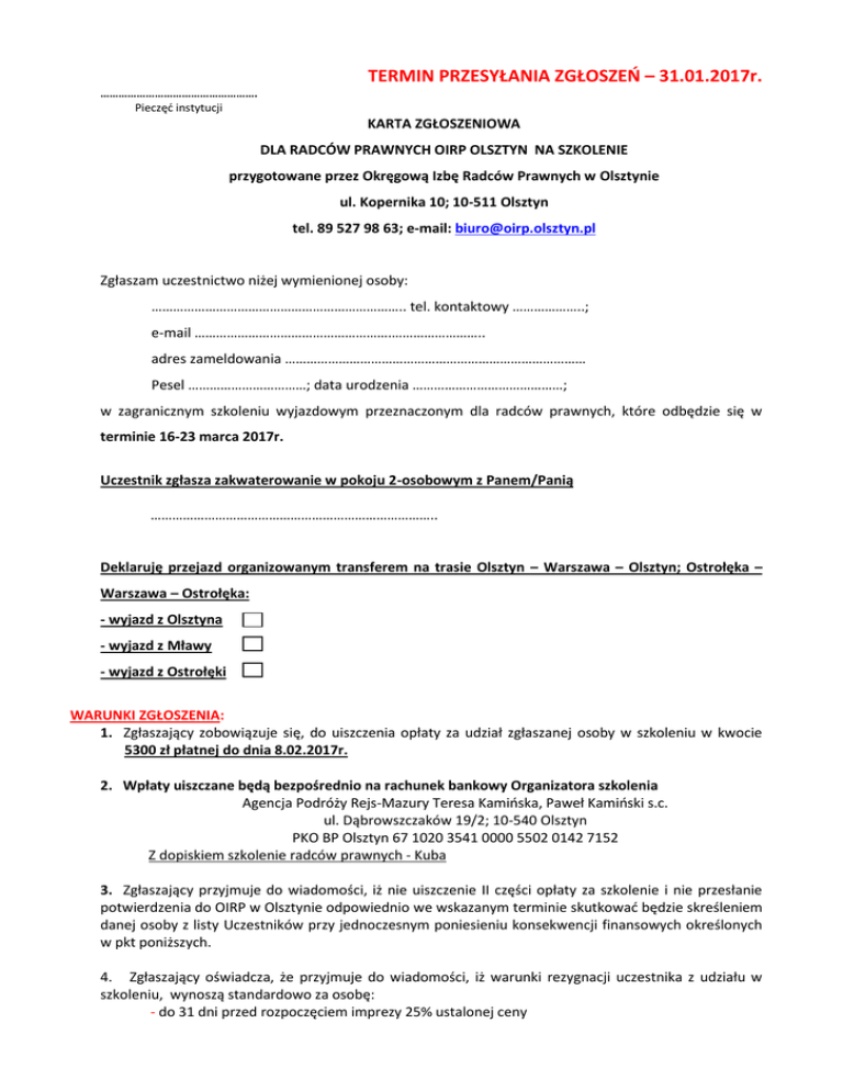 TERMIN PRZESYŁANIA ZGŁOSZEŃ – 31.01.2017r. ……………………………………………. Pieczęć instytucji KARTA ZGŁOSZENIOWA DLA RADCÓW PRAWNYCH OIRP OLSZTYN NA SZKOLENIE przygotowane przez Okręgową Izbę Radców Prawnych w Olsztynie ul. Kopernika 10; 10-511 Olsztyn tel. 89 527 98 63; e-mail: [email protected] Zgłaszam uczestnictwo niżej wymienionej osoby: …………………………………………………………….. tel. kontaktowy ………………..; e-mail ……………………………………………….…………………….. adres zameldowania ………………………………………………………………………… Pesel ……………………………; data urodzenia ……………………………………; w zagranicznym szkoleniu wyjazdowym przeznaczonym dla radców prawnych, które odbędzie się w terminie 16-23 marca 2017r. Uczestnik zgłasza zakwaterowanie w pokoju 2-osobowym z Panem/Panią …………………………………………………………………….. Deklaruję przejazd organizowanym transferem na trasie Olsztyn – Warszawa – Olsztyn; Ostrołęka – Warszawa – Ostrołęka: - wyjazd z Olsztyna - wyjazd z Mławy - wyjazd z Ostrołęki WARUNKI ZGŁOSZENIA: 1. Zgłaszający zobowiązuje się, do uiszczenia opłaty za udział zgłaszanej osoby w szkoleniu w kwocie 5300 zł płatnej do dnia 8.02.2017r. 2. Wpłaty uiszczane będą bezpośrednio na rachunek bankowy Organizatora szkolenia Agencja Podróży Rejs-Mazury Teresa Kamińska, Paweł Kamiński s.c. ul. Dąbrowszczaków 19/2; 10-540 Olsztyn PKO BP Olsztyn 67 1020 3541 0000 5502 0142 7152 Z dopiskiem szkolenie radców prawnych - Kuba 3. Zgłaszający przyjmuje do wiadomości, iż nie uiszczenie II części opłaty za szkolenie i nie przesłanie potwierdzenia do OIRP w Olsztynie odpowiednio we wskazanym terminie skutkować będzie skreśleniem danej osoby z listy Uczestników przy jednoczesnym poniesieniu konsekwencji finansowych określonych w pkt poniższych. 4. Zgłaszający oświadcza, że przyjmuje do wiadomości, iż warunki rezygnacji uczestnika z udziału w szkoleniu, wynoszą standardowo za osobę: - do 31 dni przed rozpoczęciem imprezy 25% ustalonej ceny - od 30 dnia przed rozpoczęciem imprezy 40% ustalonej ceny - od 24 dnia przed rozpoczęciem imprezy 50% ustalonej ceny - od 17 dnia przed rozpoczęciem imprezy 60% ustalonej ceny - od 10 dnia przed rozpoczęciem imprezy 80% ustalonej ceny - od 3 dnia do dnia rozpoczęcia imprezy lub jej nierozpoczęcia 90% ustalonej ceny 5. W przypadku rezygnacji ze szkolenia lub też nie wzięcia przez Uczestnika udziału w wyjeździe szkoleniowym, zgłaszający zobowiązany jest do zwrócenia na rzecz OIRP w Olsztynie uiszczonego przez Izbę dofinansowania w terminie 14 dni od otrzymania stosownego rozliczenia. 6. W przypadku rezygnacji Uczestnika, Zgłaszający, w terminie do dnia 1.03.2017r., uprawniony jest do nieodpłatnego wskazania osoby, która zajmie jego miejsce. 7. Zgłaszający może złożyć do Organizatora - Agencji Podróży Rejs-Mazury Teresa Kamińska, Paweł Kamiński s.c. mailem [email protected] - wniosek o wystawienie faktury VAT Marża z tytułu dokonanych wpłat. Faktury będą wystawiane w terminie 7 dni od zakończenia szkolenia, tytułem „Obsługa turystyczna wyjazdu szkoleniowego”. .................................................... miejscowość, data ……………………………………………………………….. podpis osoby zgłaszającej uczestnika Oświadczenia Uczestnika: Uczestnik oświadcza, iż zapoznał się oraz akceptuje warunki uczestnictwa w wyjeździe szkoleniowym określone w załączniku do zgłoszenia. .................................................... miejscowość, data ……………………………………………………………….. podpis uczestnika Kartę zgłoszeniową wraz z dowodem uiszczenia I wpłaty należy dostarczyć osobiście lub przesłać w nieprzekraczalnym terminie do dnia 31 stycznia 2017r. do Okręgowej Izby Radców Prawnych w Olsztynie ul. Kopernika 10; 10-511 Olsztyn; e-mail: [email protected]. Liczba miejsc na szkoleniu ograniczona, o przyjęciu zgłoszenia decyduje kolejność wpływu zgłoszenia wraz z dowodem uiszczenia wpłaty do OIRP.